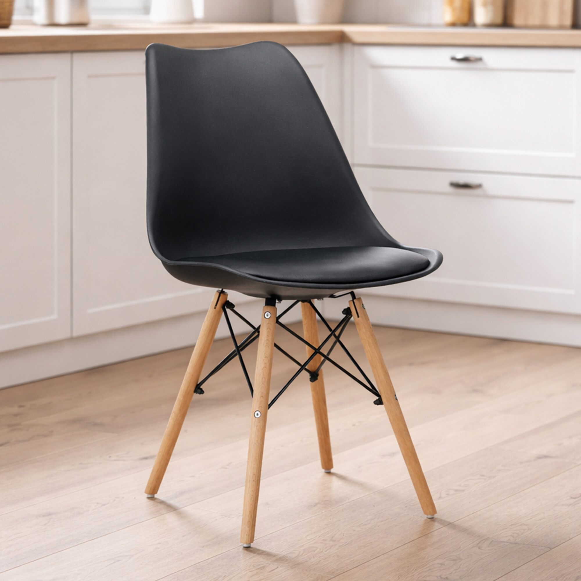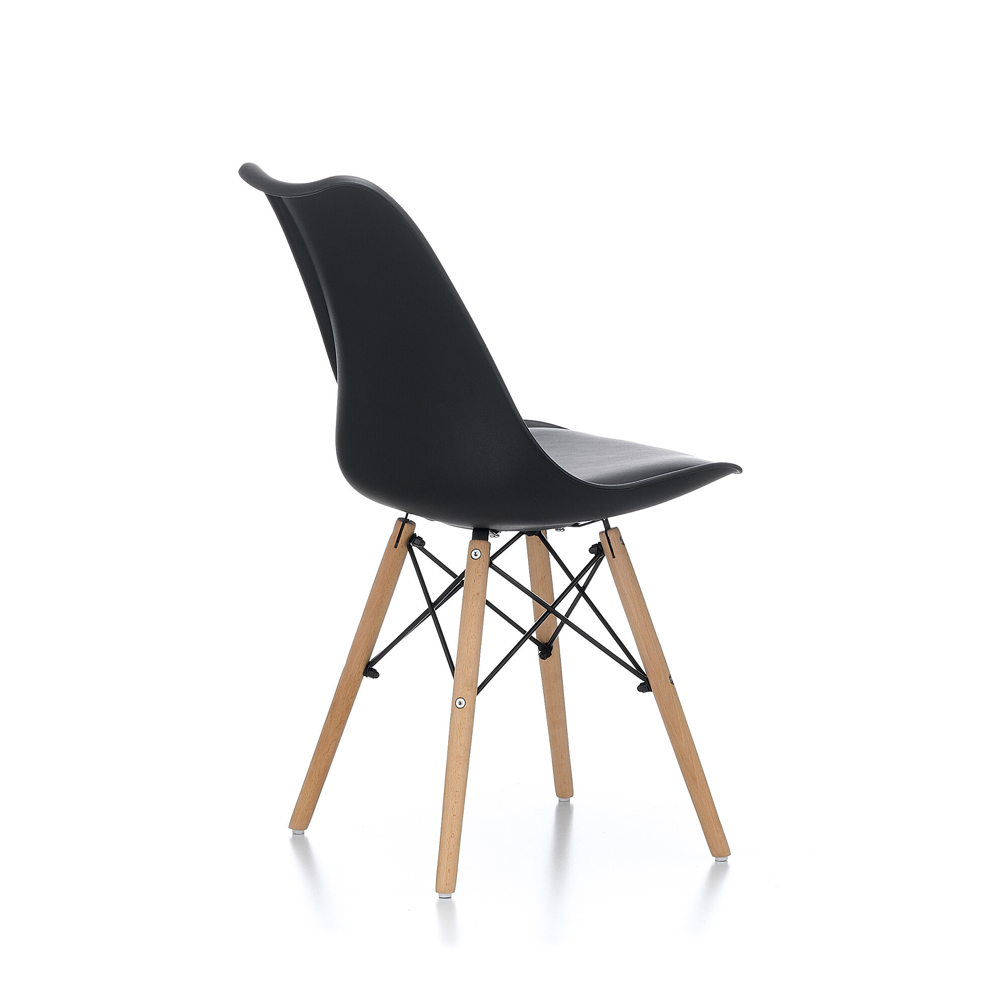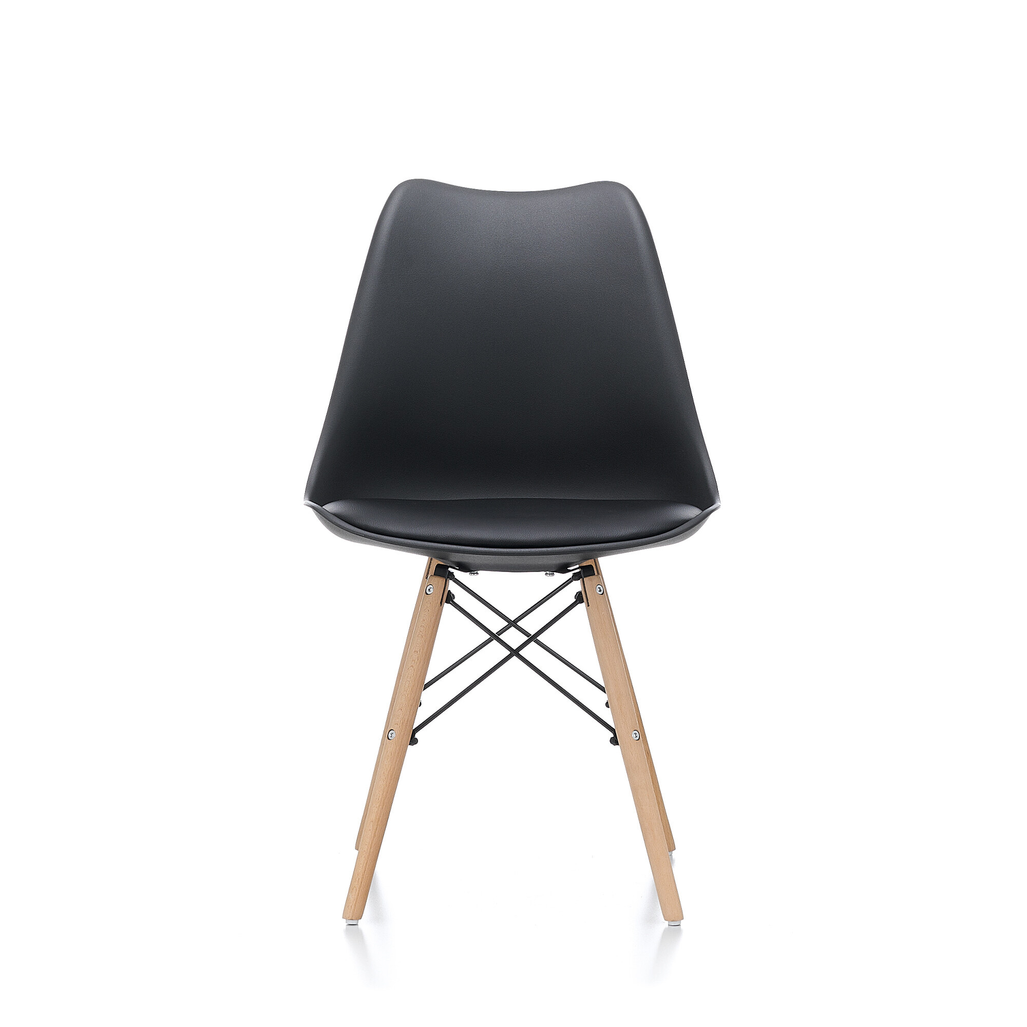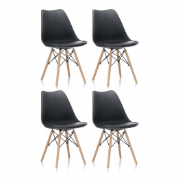 Krzesło wykonane jest z wysokiej jakości i trwałego polipropylenu z poduszką pokrytą sztuczną skórą w połączeniu z nogami z drewna bukowego.