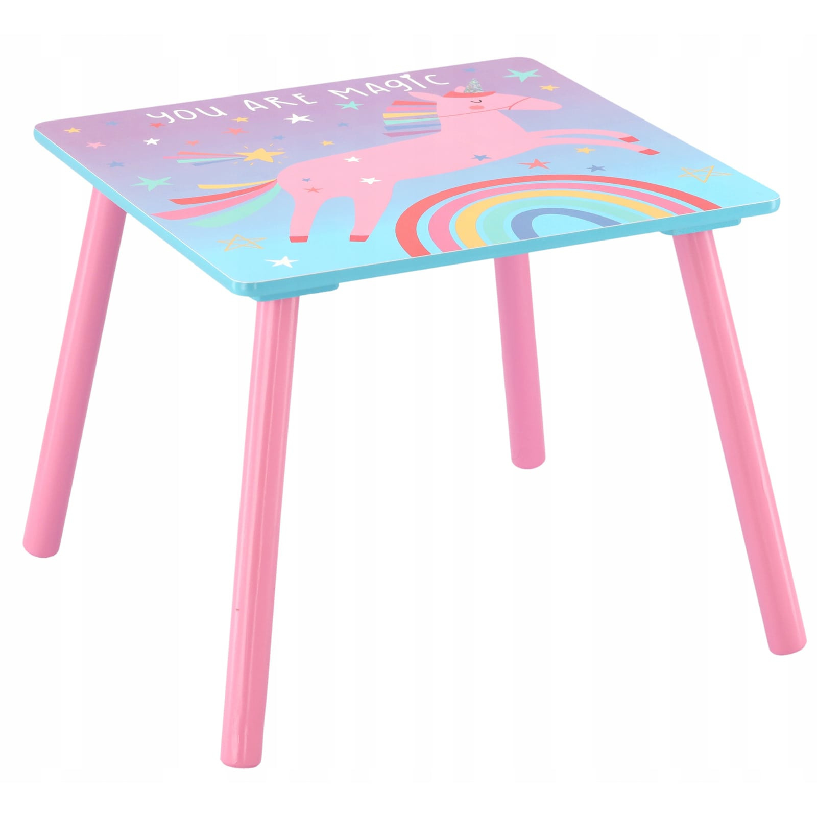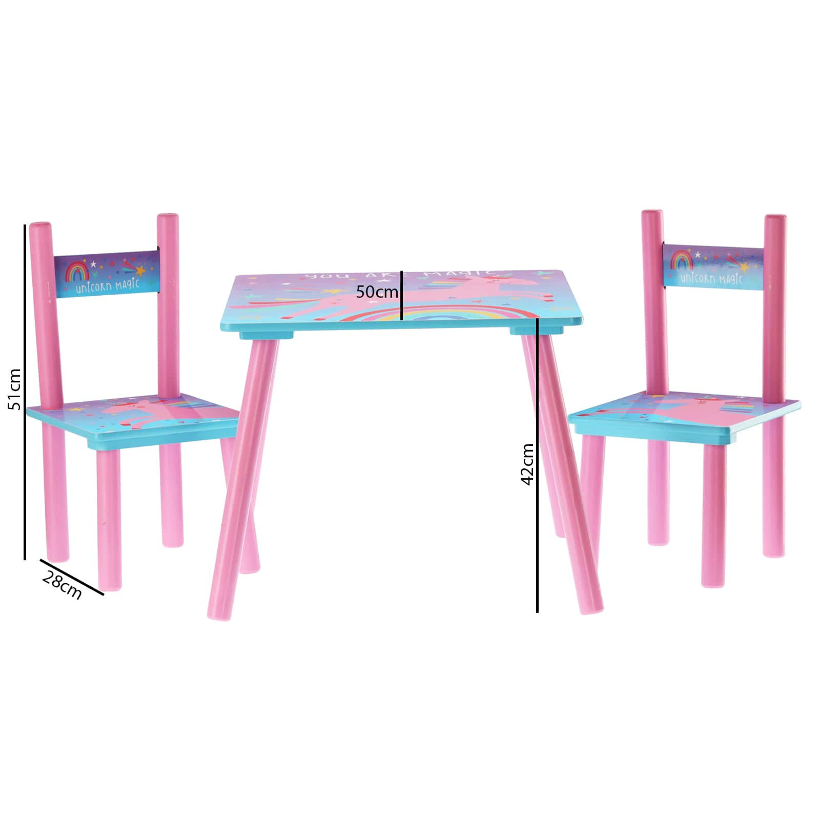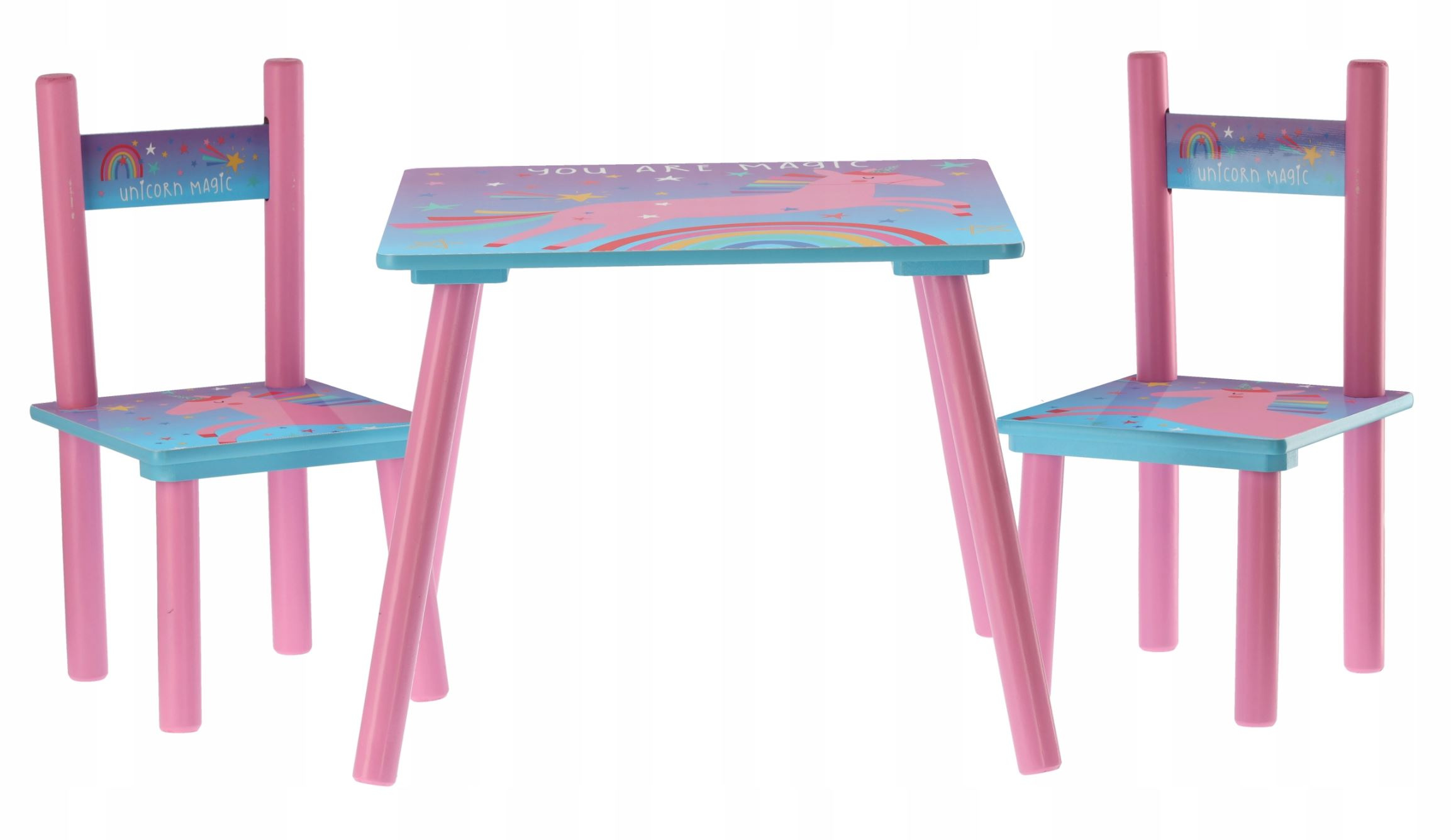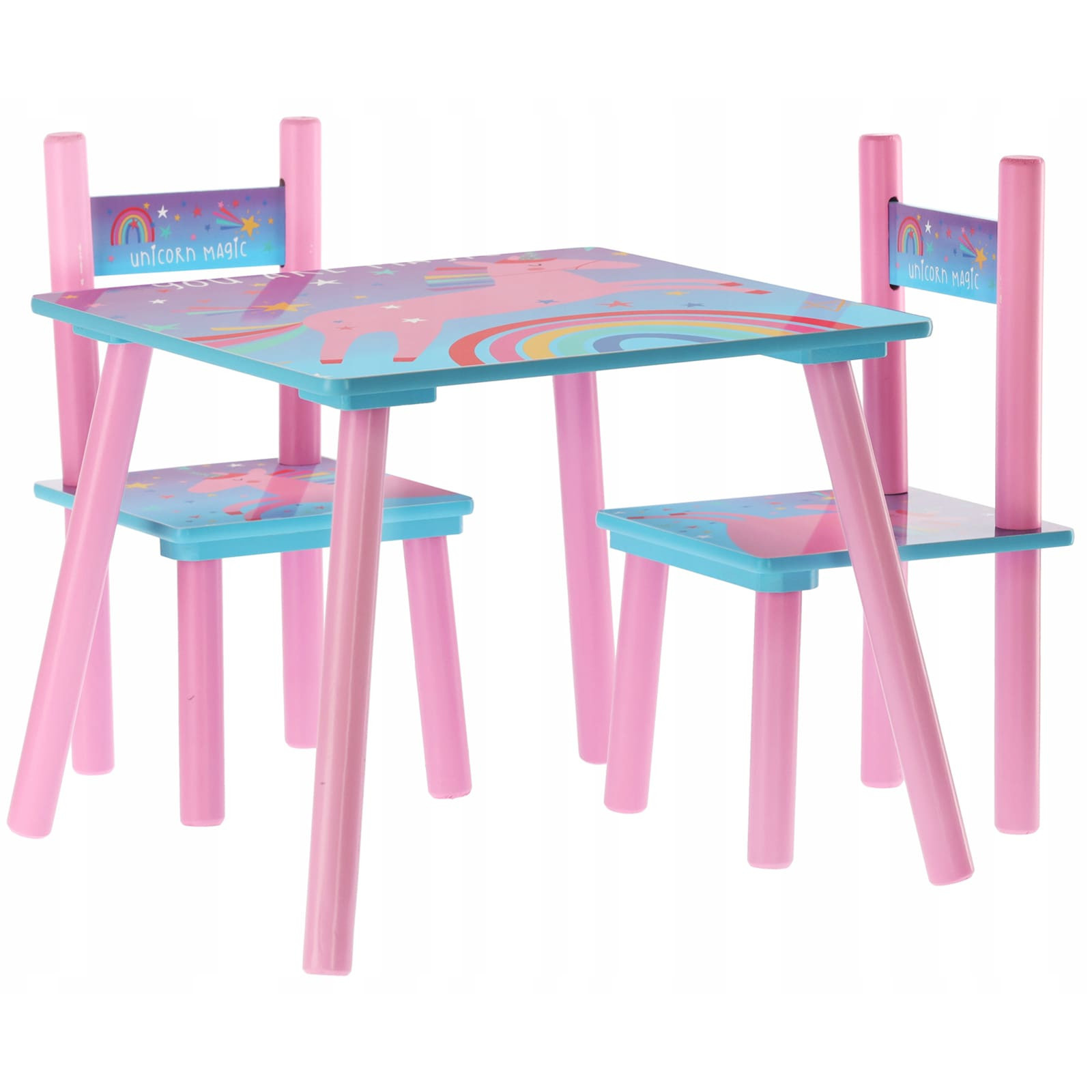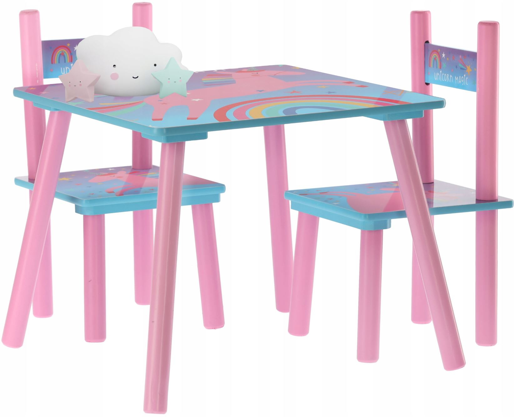 W zestawie znajdują się również 2 krzesła. Stół dziecięcy z krzesłami wykonany jest z materiału MDF i drewna sosnowego.