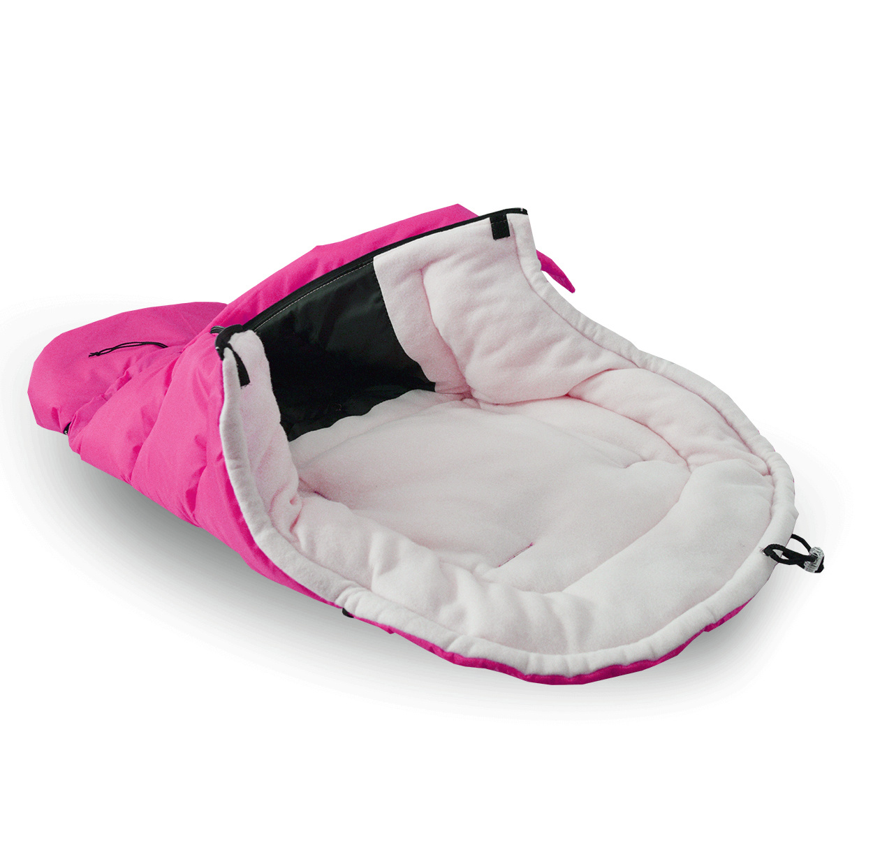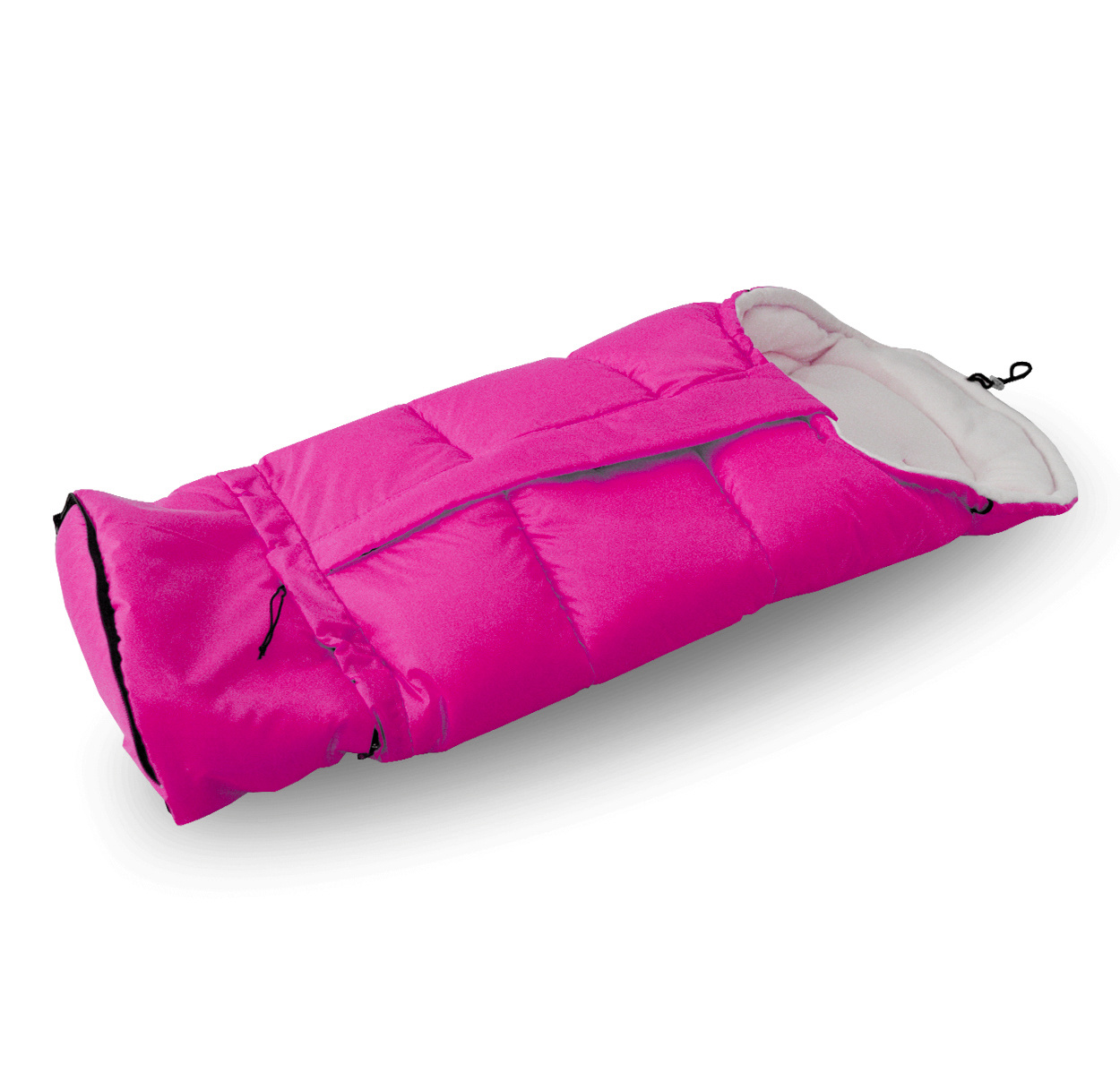 Śpiworek dziecięcy posiada zamek błyskawiczny, otwory na 5-punktowe pasy bezpieczeństwa i gumowe uchwyty do mocowania do wózka.