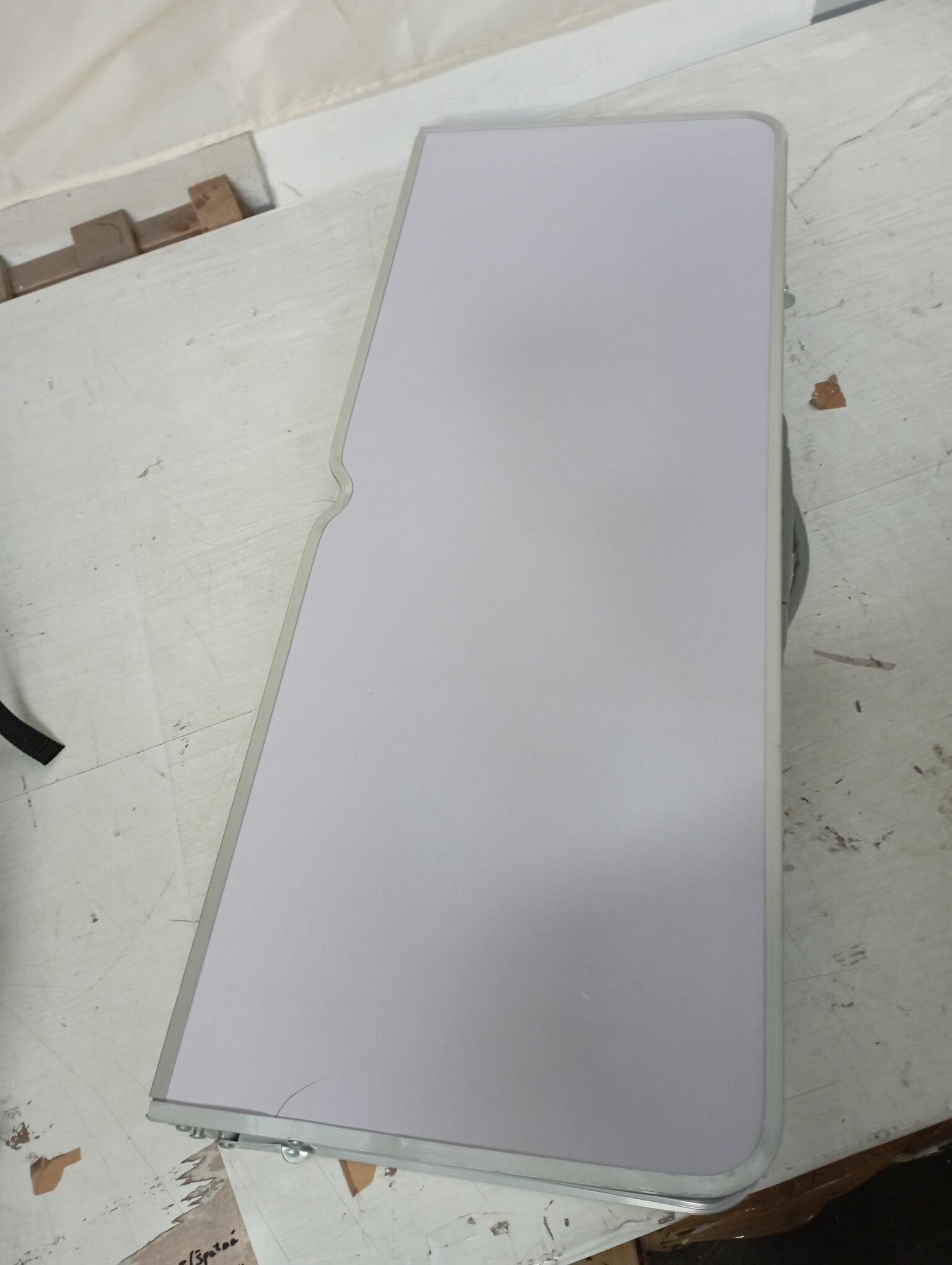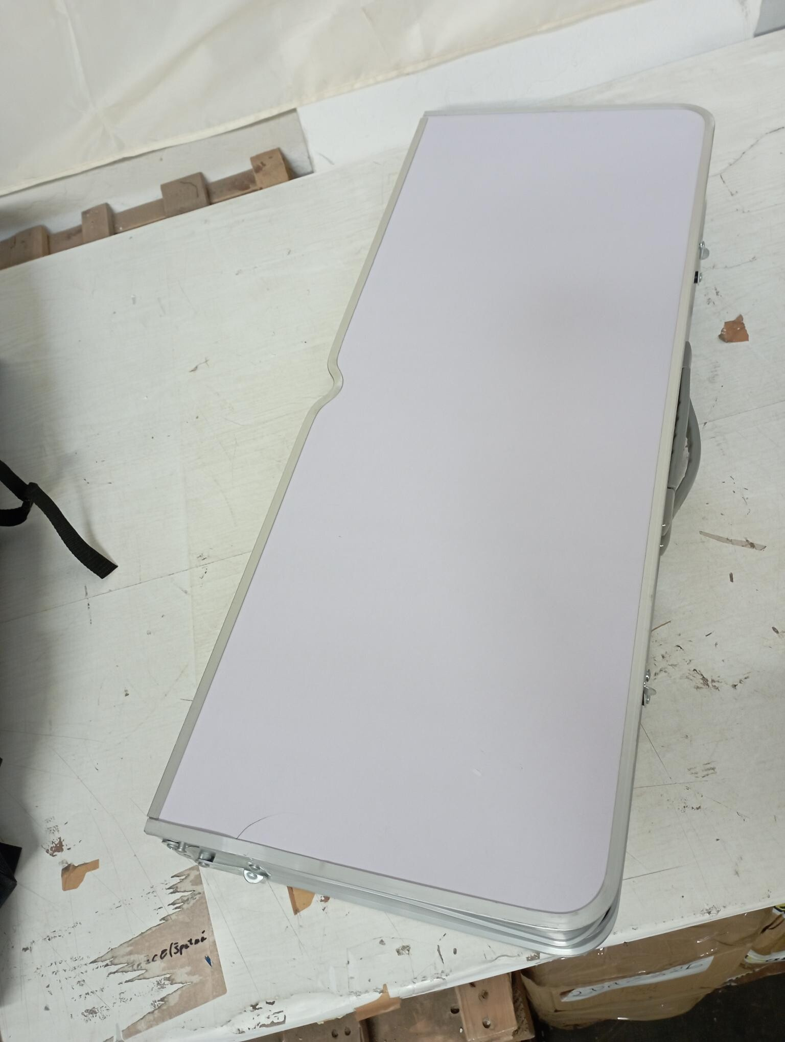 Zestaw kempingowy jest kompletny i w pełni funkcjonalny. Blat stołu jadalnego ma pęknięcie, które nie wpływa na stabilność ani użytkowanie. Blat jest również lekko zabrudzony od przechowywania.