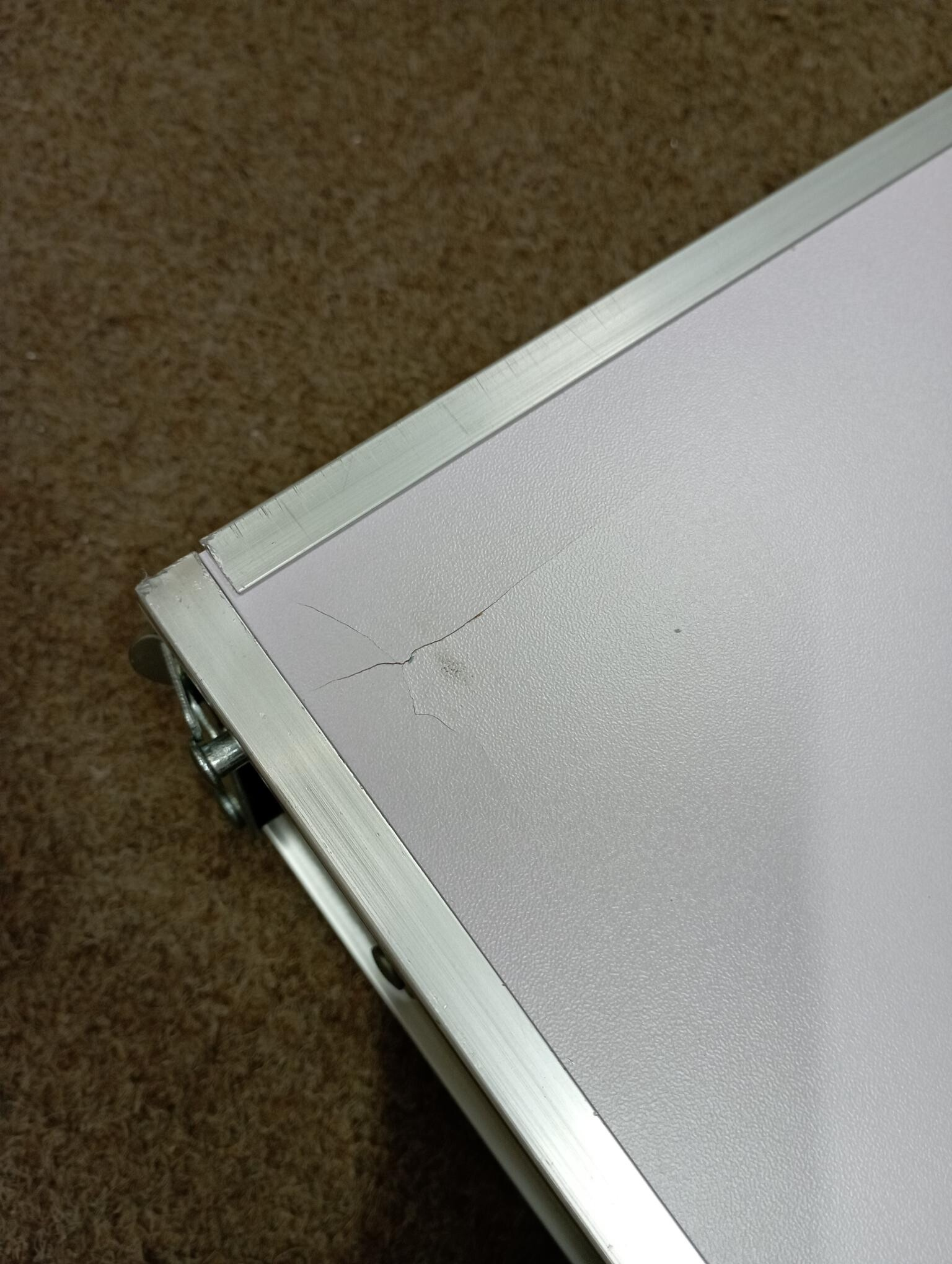 Stół jest kompletny i w pełni sprawny. Blat stołu jest pęknięty w jednym rogu, powierzchnia jest lekko porysowana i zakurzona.