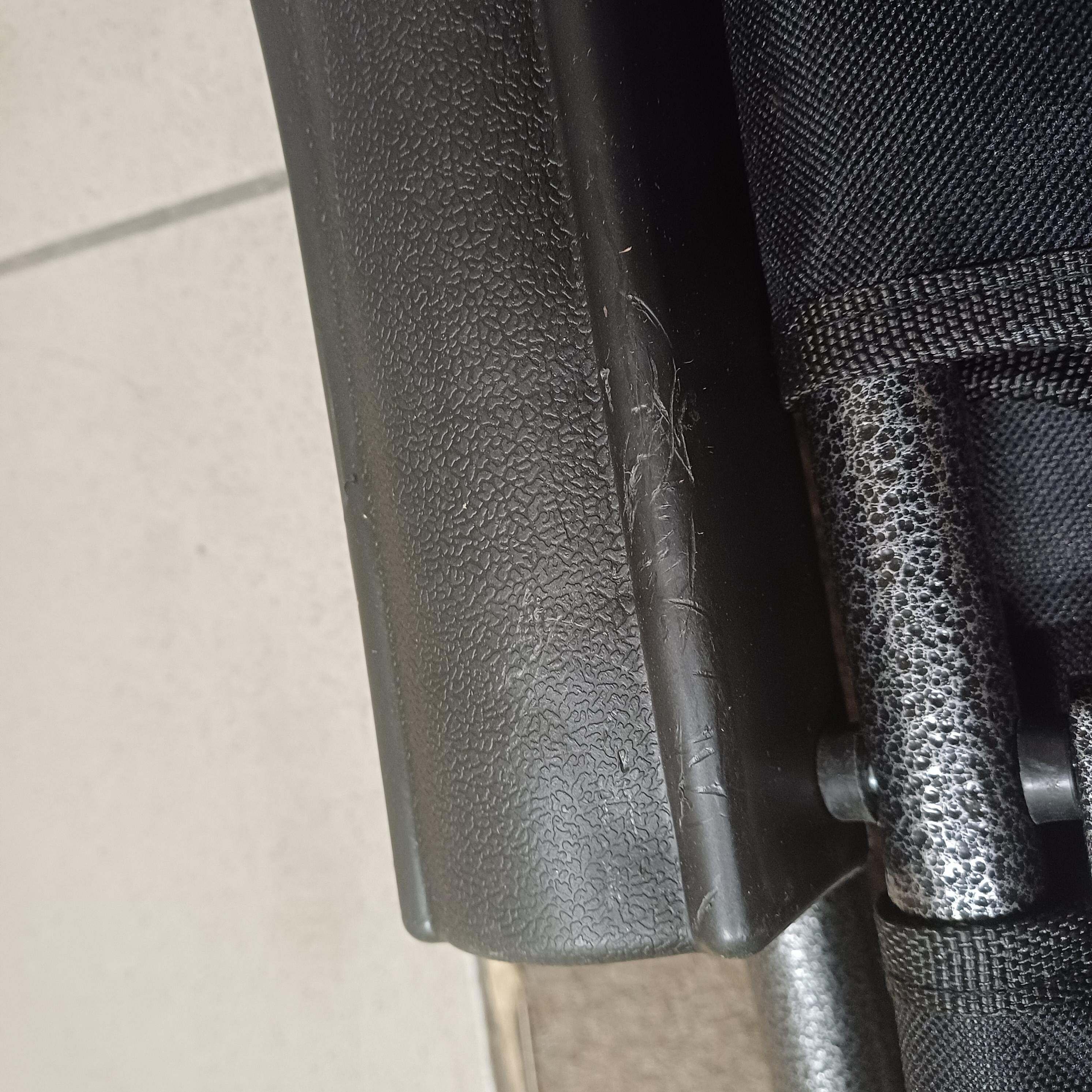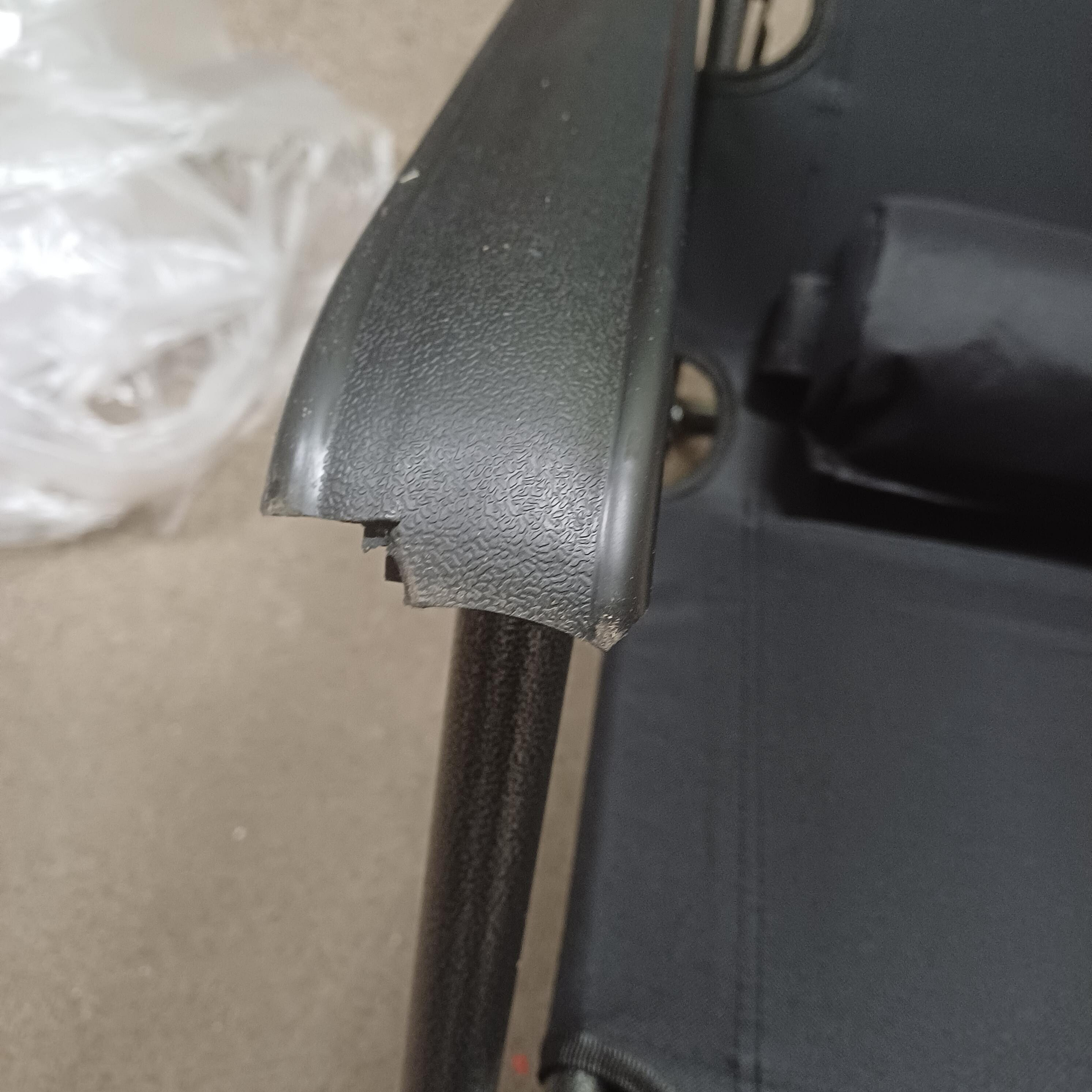 Produkt wykazuje wady kosmetyczne w postaci zarysowań i obitych podłokietników. Te niedociągnięcia nie mają wpływu na funkcjonalność.