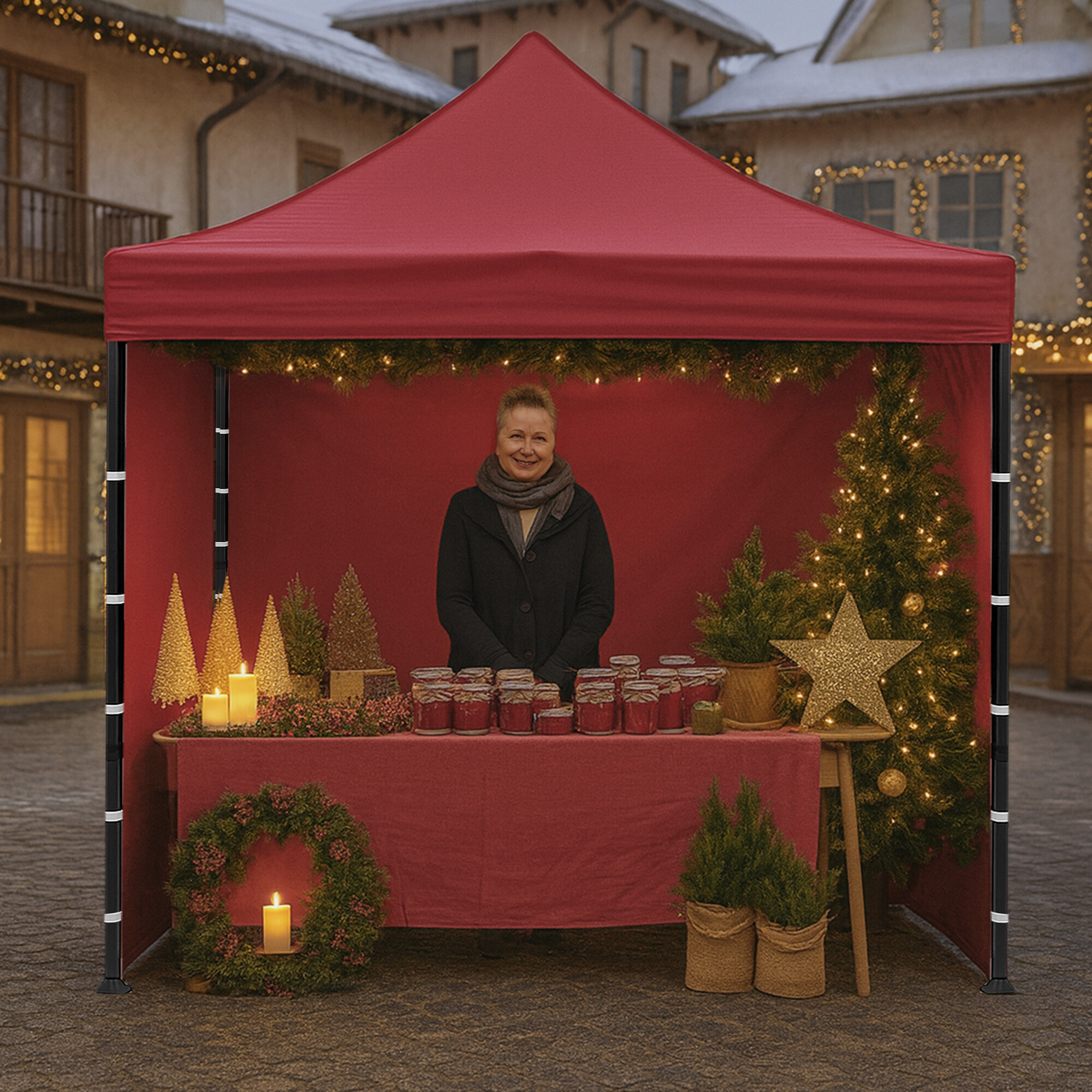 Stoisko sprzedażowe 2×2 m z solidną konstrukcją nożycową jest przeznaczone na targi rolnicze, akcje reklamowe, wystawy oraz sprzedaż sezonową.