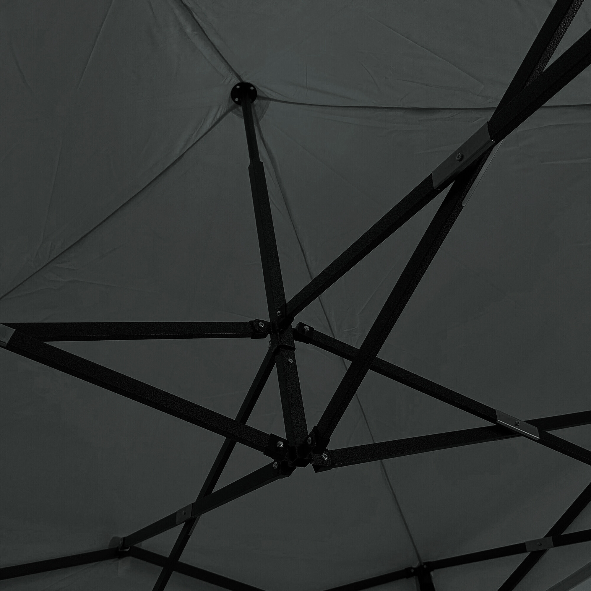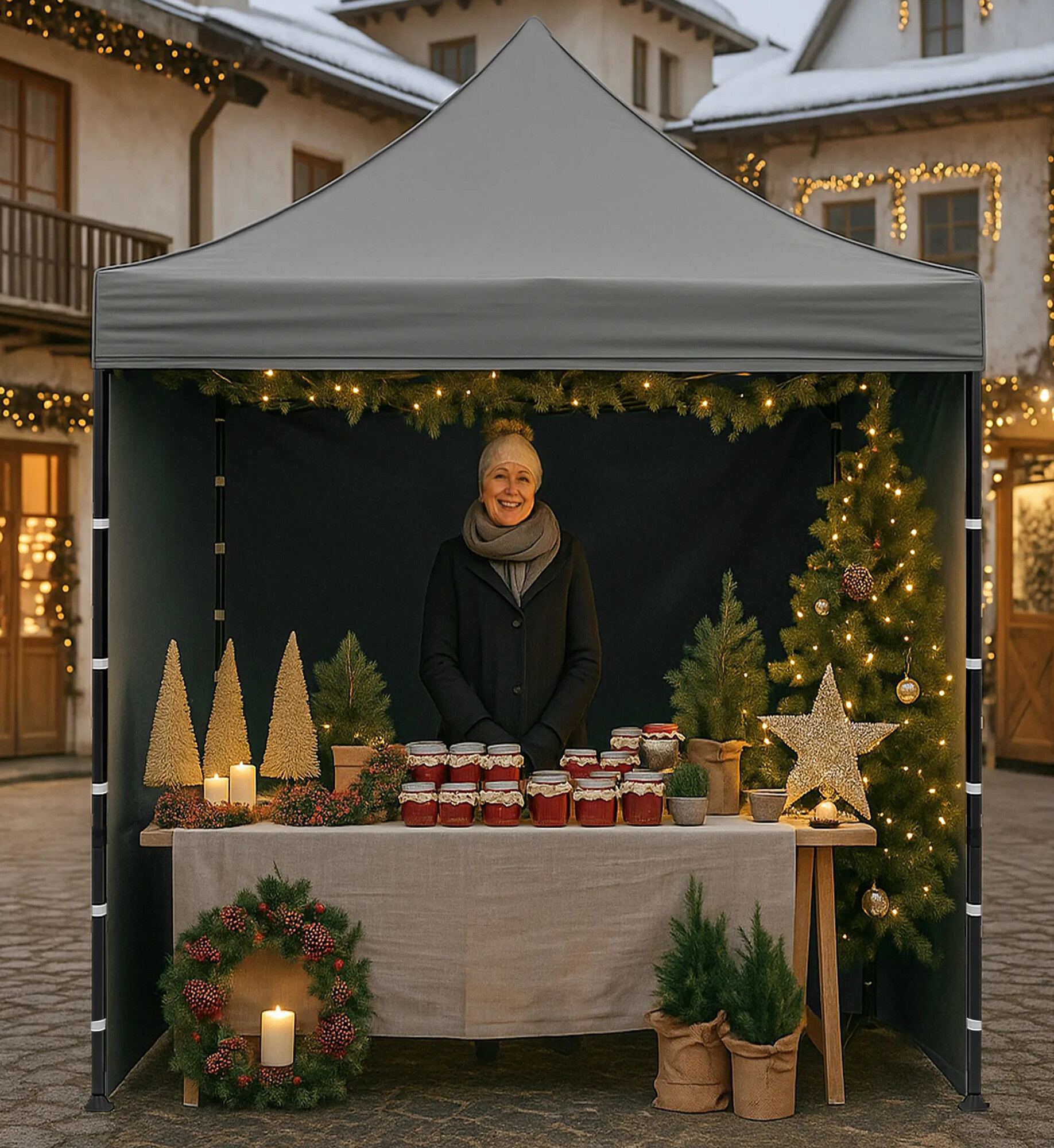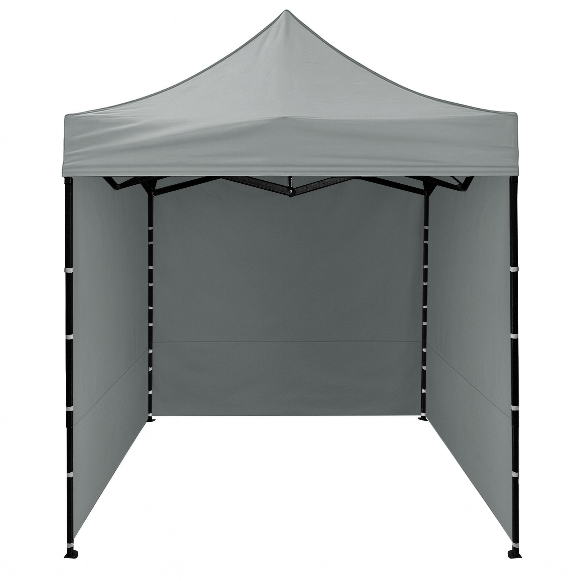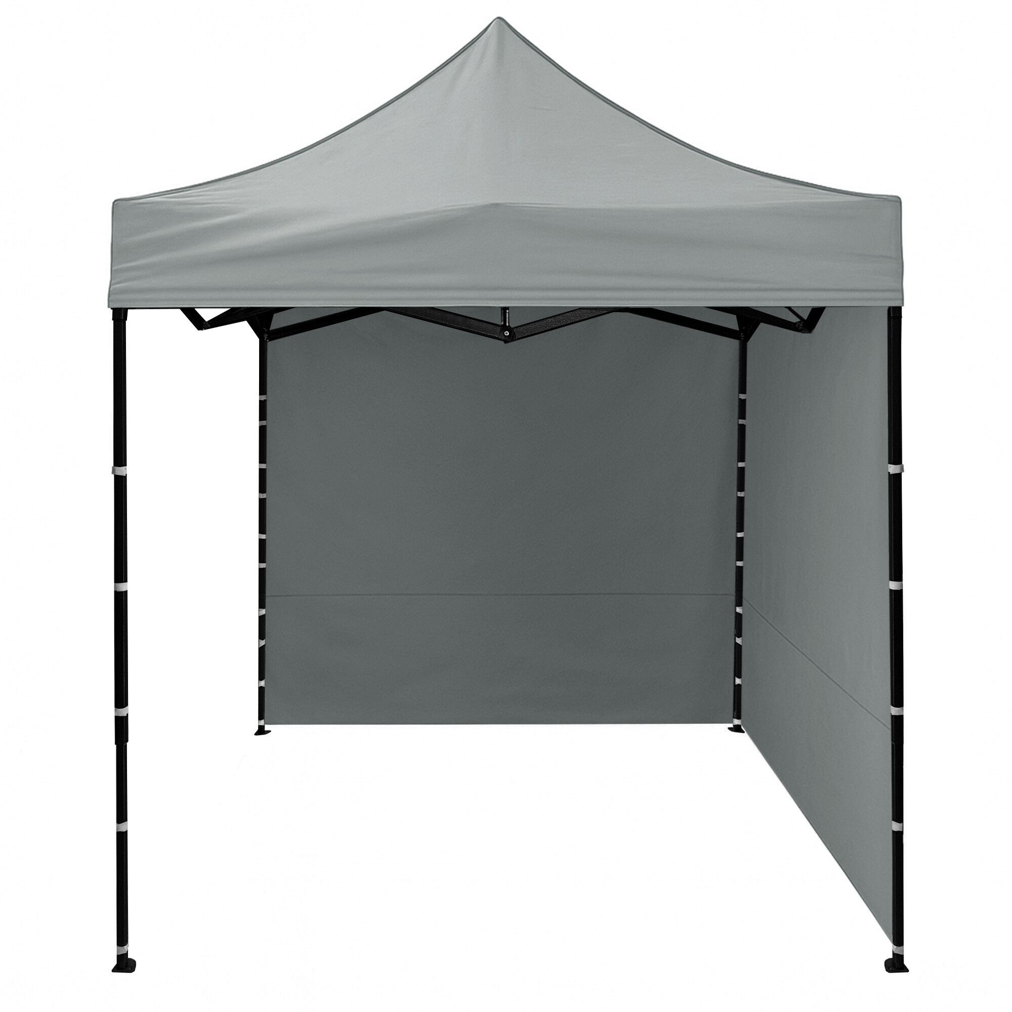 Dach z 420D PU Oxfordu i boczne ścianki z PVC Oxford 210D zapewniają ochronę przed wiatrem i deszczem, jednocześnie tworząc reprezentacyjne zaplecze dla sprzedawców i klientów. Dzięki praktycznemu rzepowi boczne ścianki można szybko zdjąć lub ponownie zamocować.