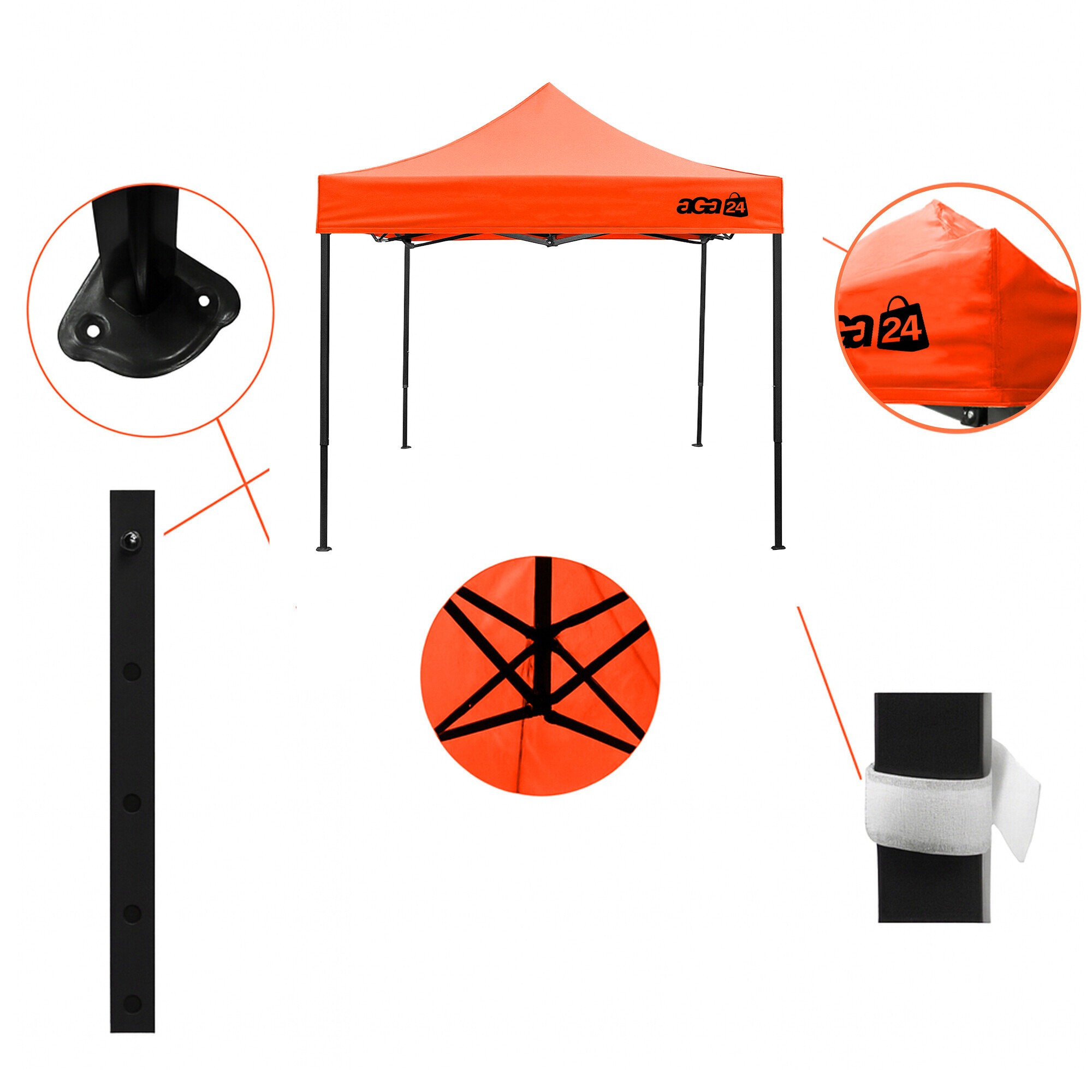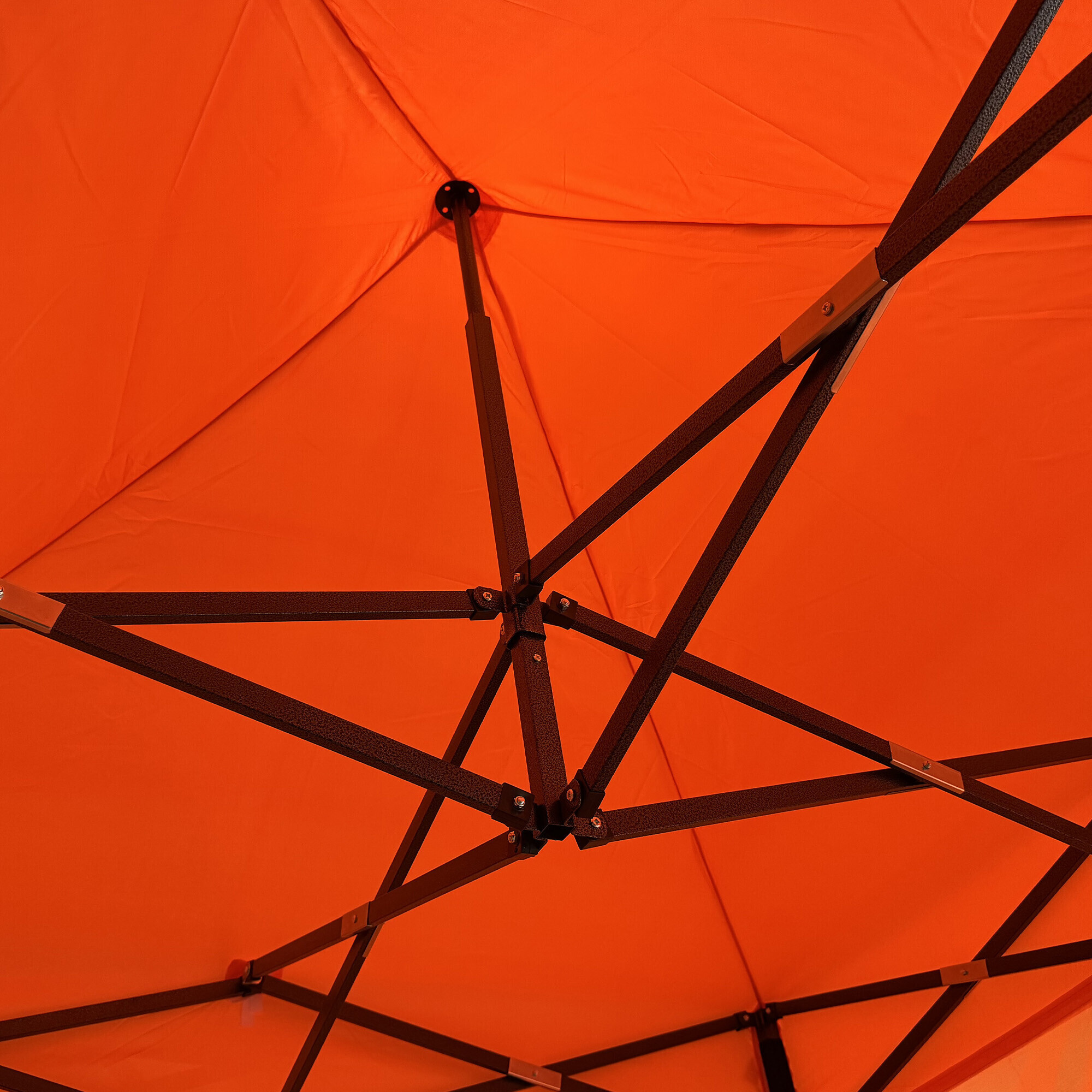 Konstrukcja składa się ze stalowej ramy z mechanizmem nożycowym, której powierzchnia jest zabezpieczona antykorozyjnie powłoką proszkową. W porównaniu z tradycyjnymi namiotami składanymi, ten model posiada połączenia śrubowe, co zwiększa wytrzymałość, wydłuża żywotność i ułatwia ewentualną wymianę części. Dzięki trzem poziomom regulacji, wysokość namiotu można regulować w zakresie od 213 cm do 290 cm, co pozwala na łatwe dopasowanie go do konkretnych warunków.