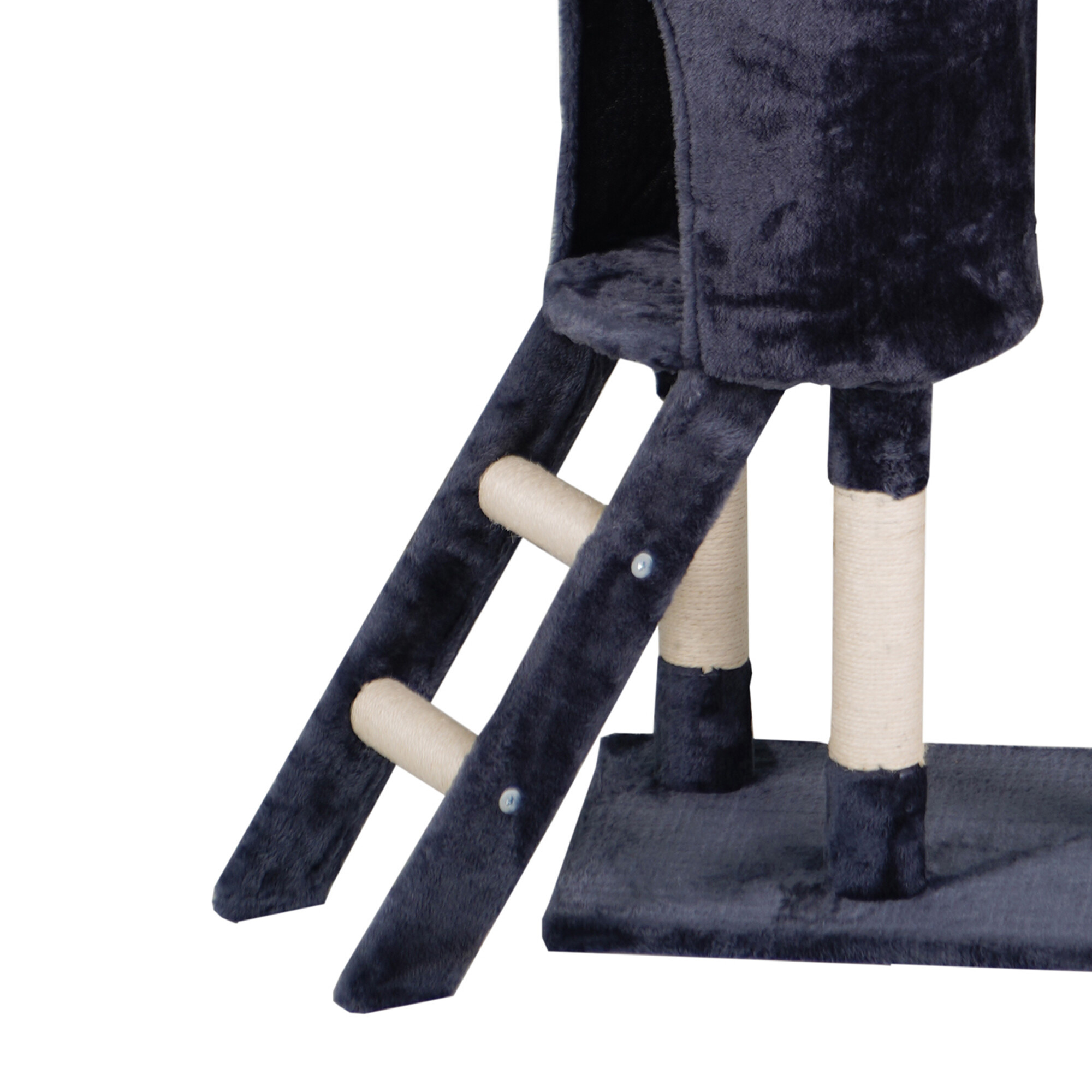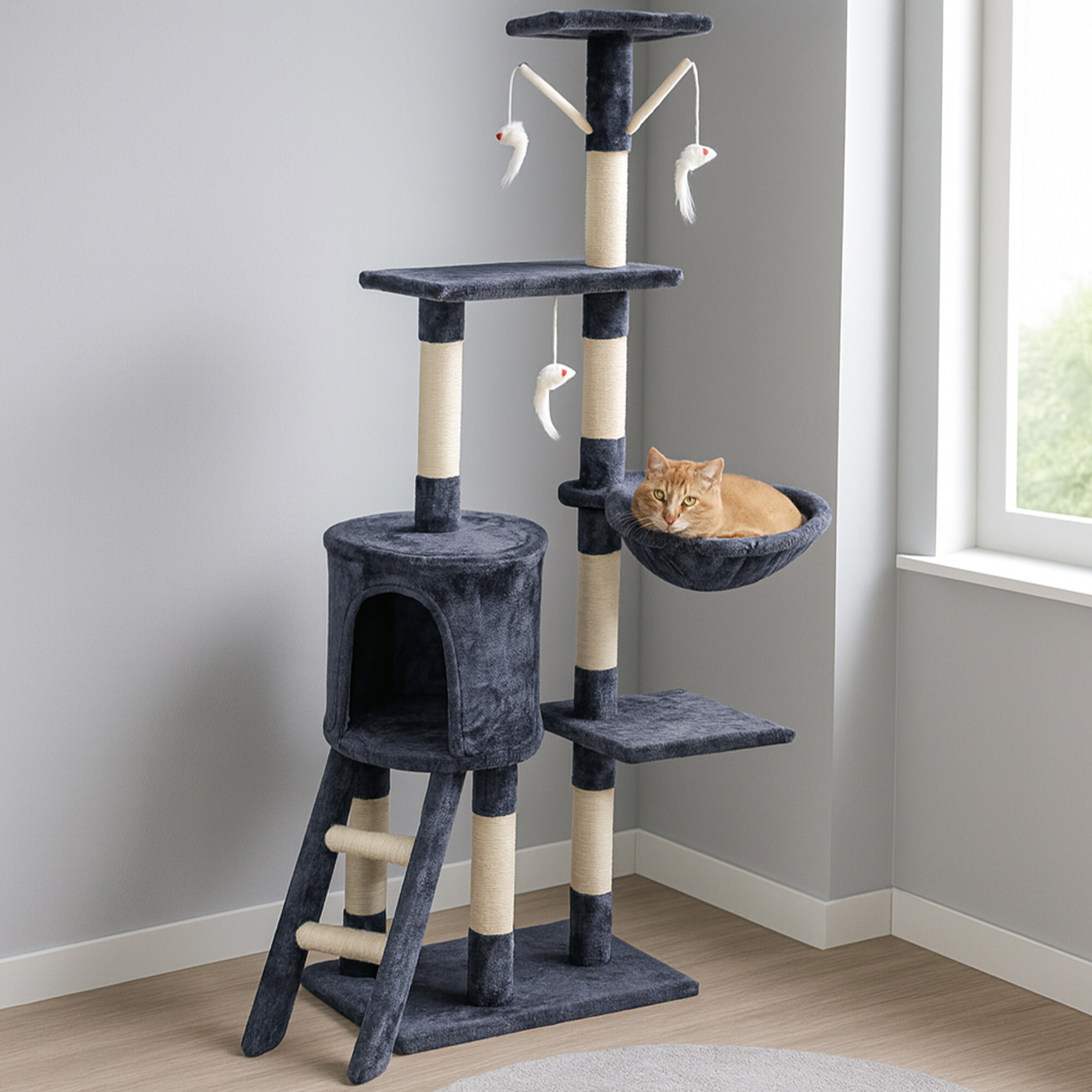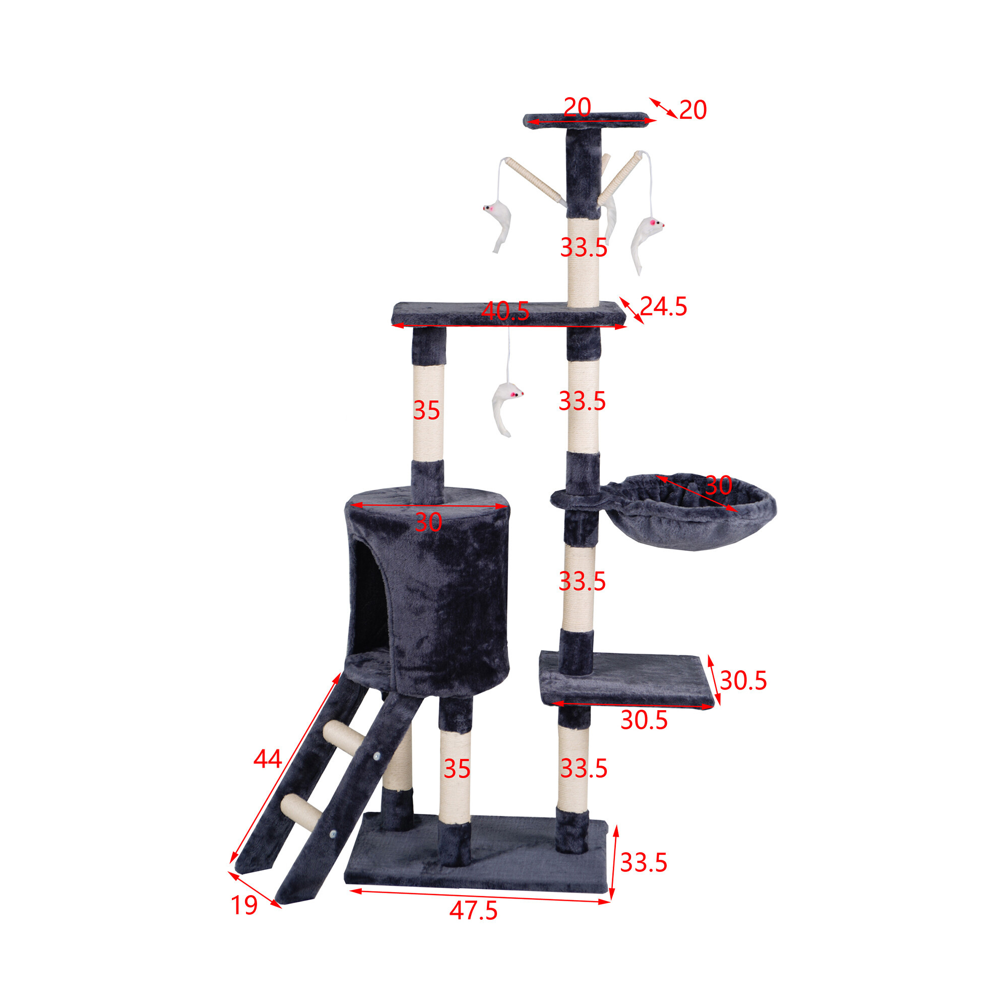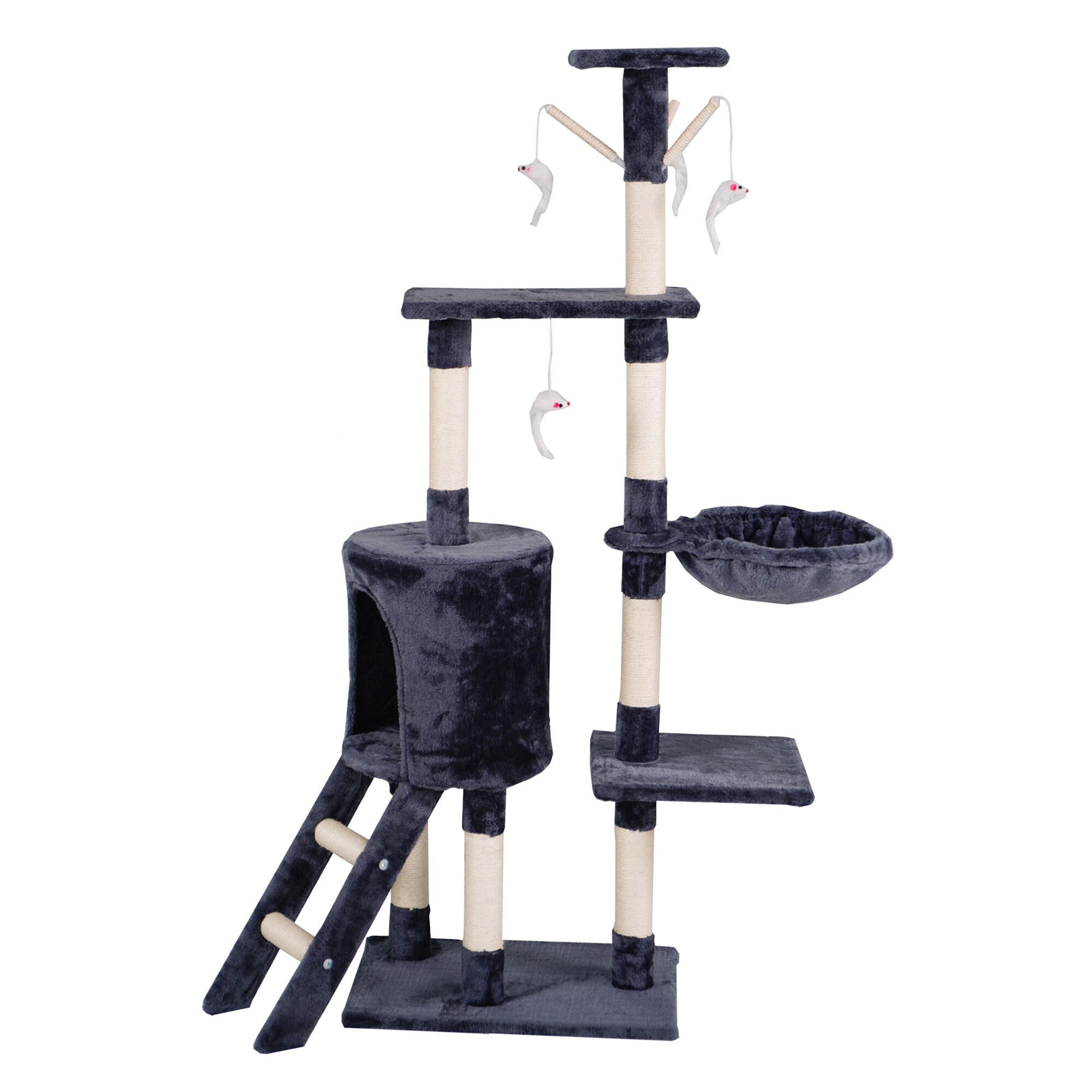 - Drapak zawiera: 1 domek do ukrycia, 4 miejsca do odpoczynku, drabinę, 4 myszy-zabawki przymocowane do elastycznych lin oraz słupki częściowo pokryte sizalem