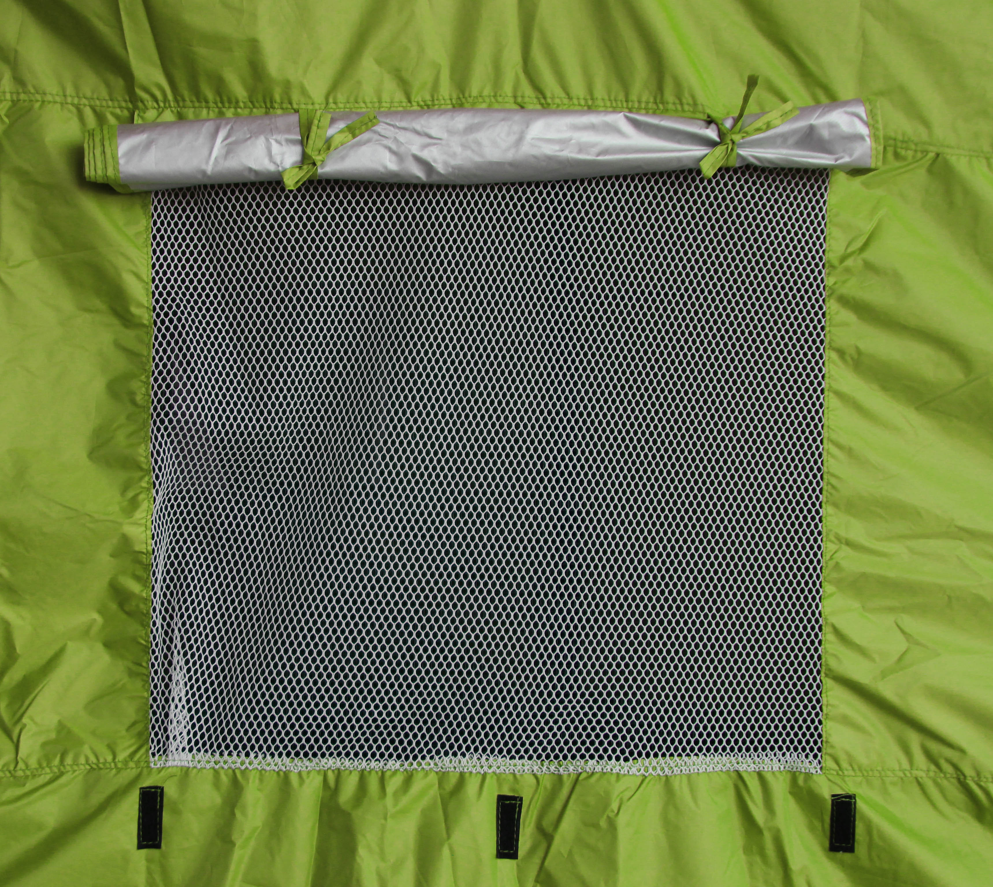 Namiot posiada otwory wentylacyjne wyposażone w zwijane klapy oraz moskitiery przeciw owadom.