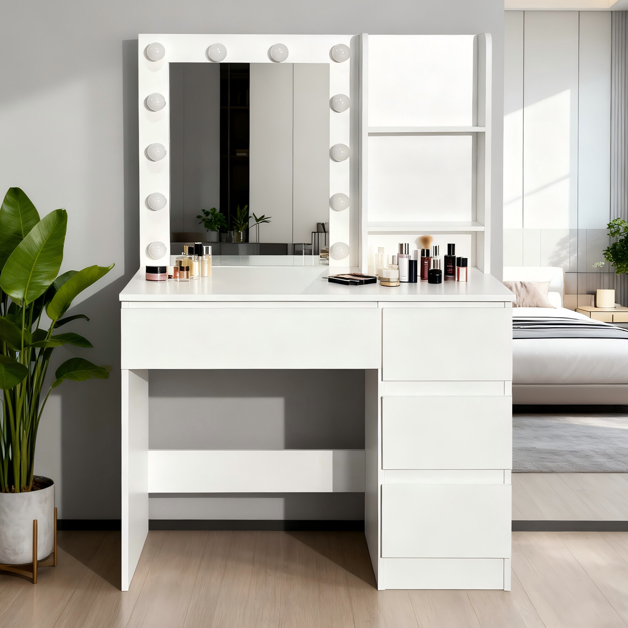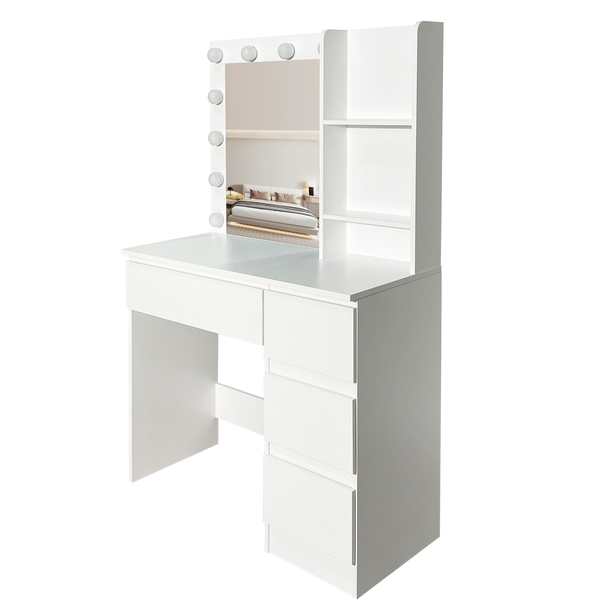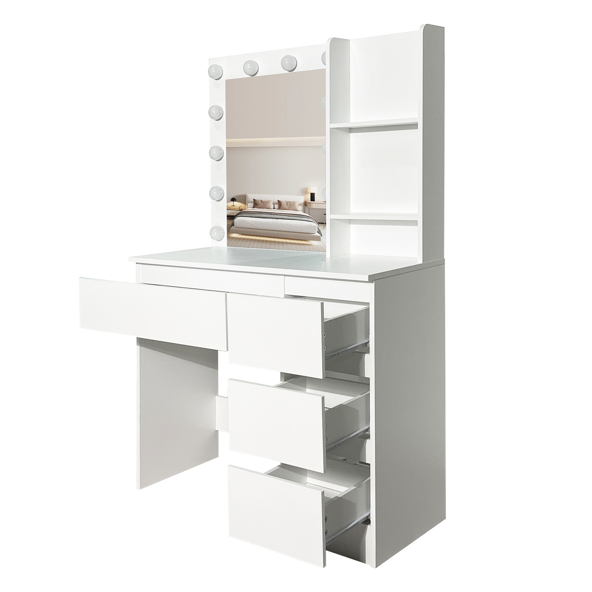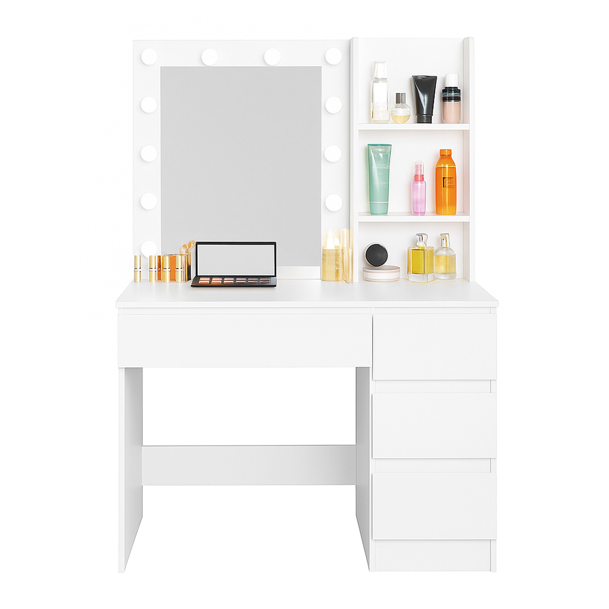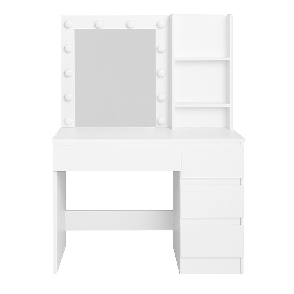 Stolik jest wyposażony w przestronny blat roboczy, na którym wygodnie zmieszczą się kosmetyki i akcesoria. Cztery praktyczne szuflady umożliwiają przejrzyste przechowywanie makijażu, biżuterii i innych potrzebnych rzeczy, podczas gdy dwie otwarte półki po bokach lustra zapewniają miejsce na dekoracje lub często używane produkty.