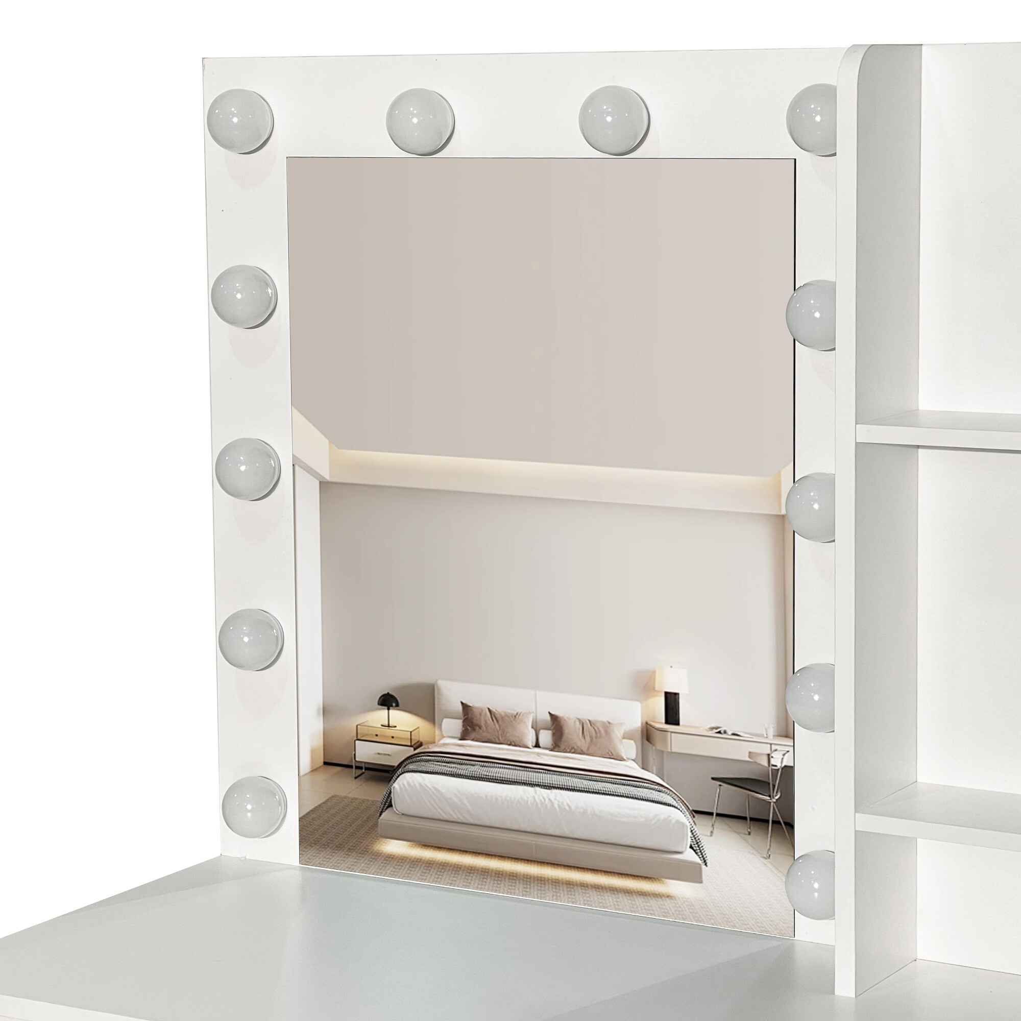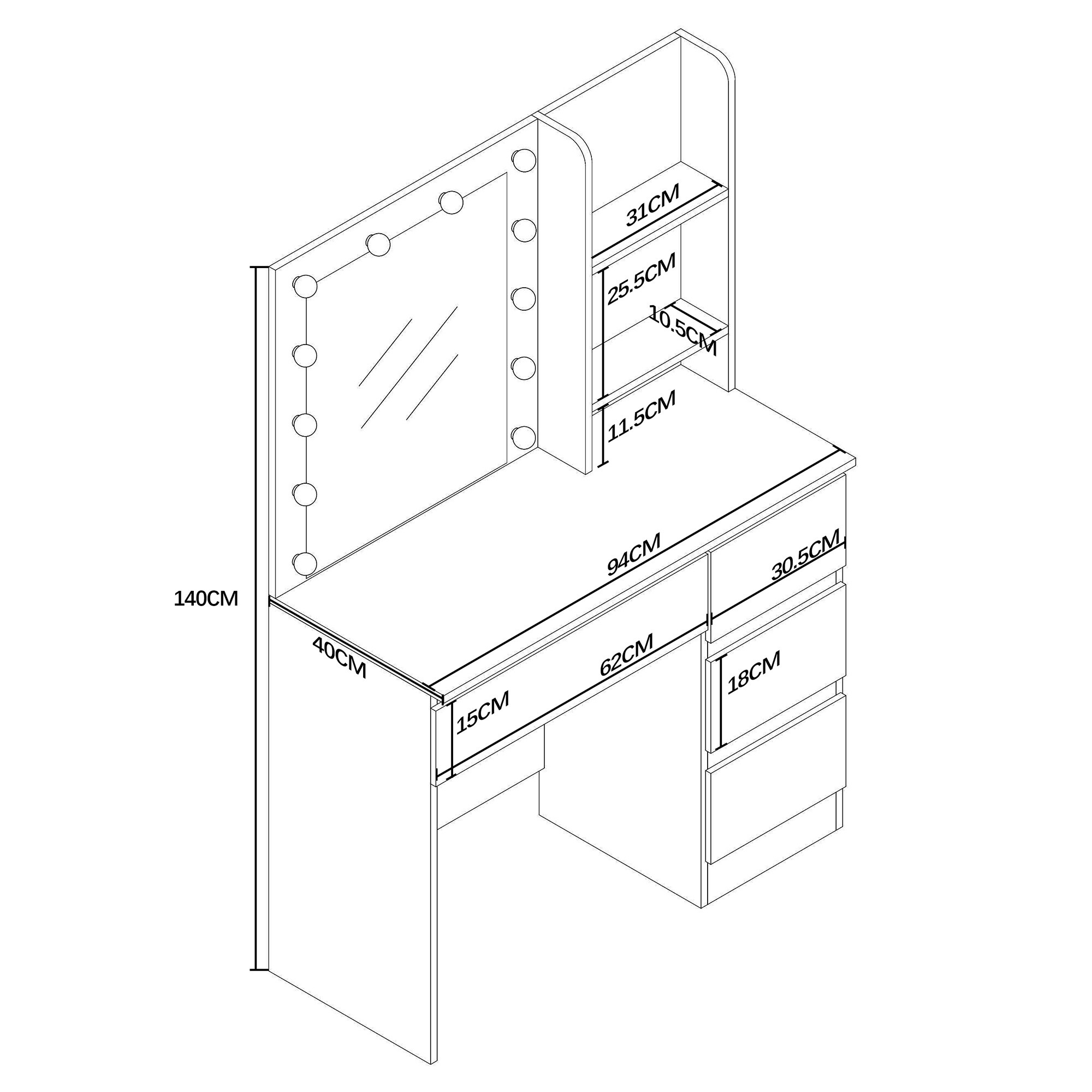 O wymiarach 94 × 40 × 140 cm stolik doskonale pasuje również do mniejszych sypialni czy mieszkań. Jego nowoczesny design uzupełniony delikatnym oświetleniem LED tworzy stylowe i przytulne miejsce na codzienne rytuały piękna.