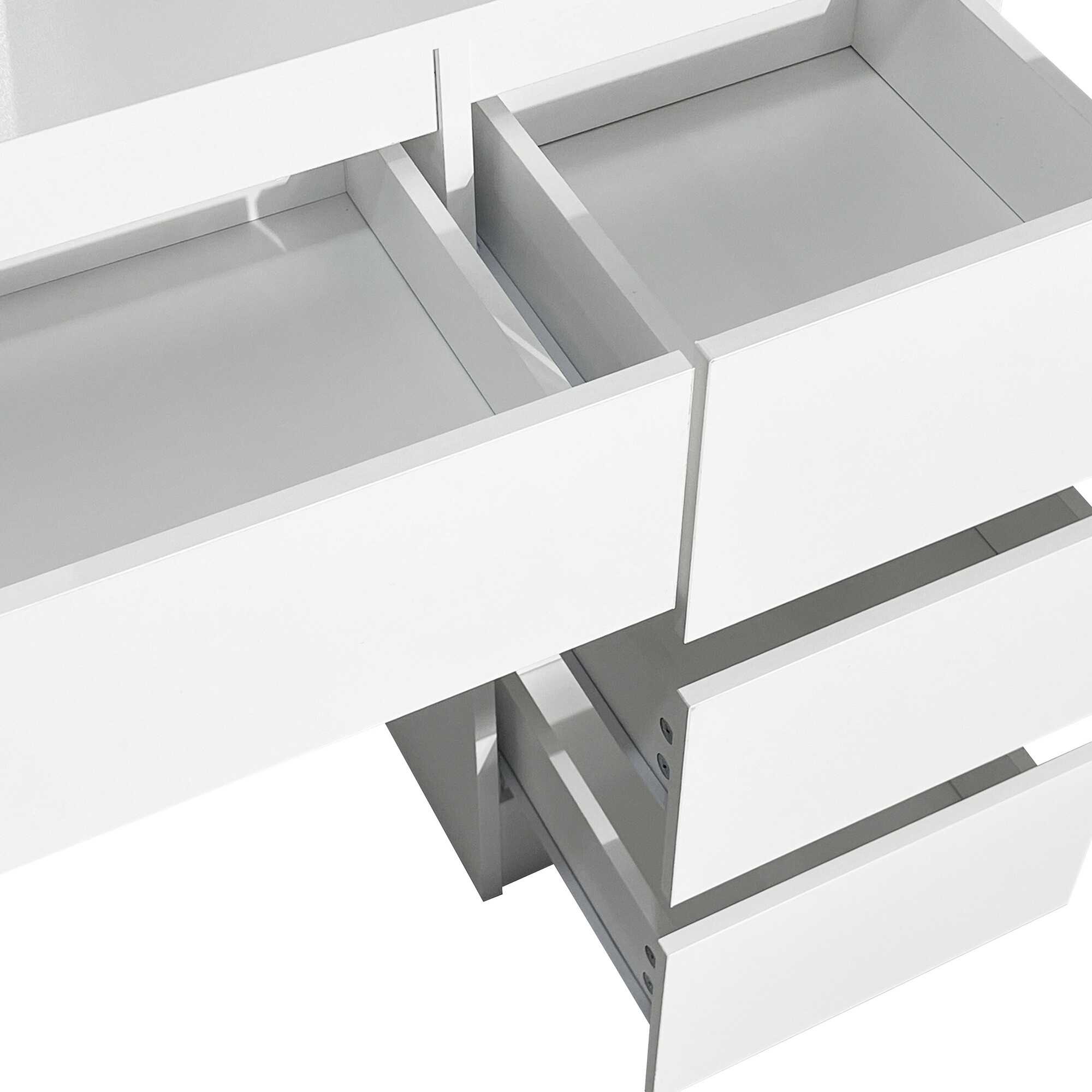 Szeroki blat roboczy zapewnia wystarczająco dużo miejsca na codzienny makijaż, stylizację włosów i pielęgnację skóry, a jednocześnie wygląda elegancko i schludnie. Wysokiej jakości płyta wiórowa gwarantuje wytrzymałość, stabilność i długą żywotność stolika, który zachowa piękno nawet po latach użytkowania.