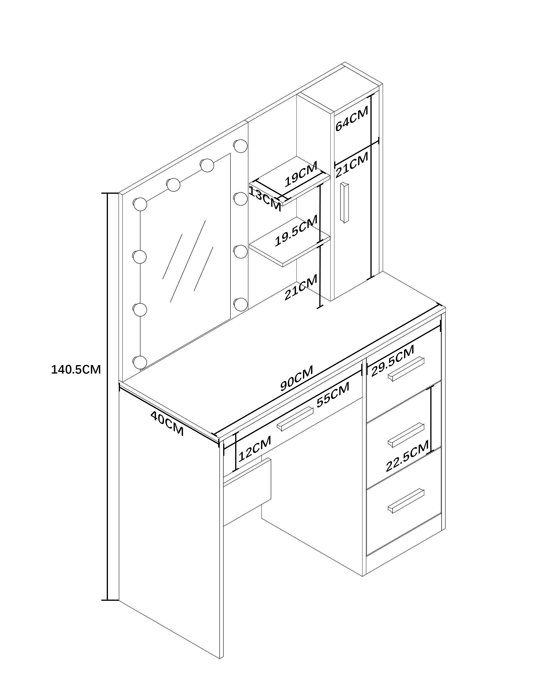 Szeroki blat roboczy zapewnia wystarczająco dużo miejsca na codzienny makijaż, stylizację włosów i pielęgnację skóry, a jednocześnie wygląda elegancko i schludnie. Wysokiej jakości płyta wiórowa gwarantuje wytrzymałość, stabilność i długą żywotność stolika, który zachowa piękno nawet po latach użytkowania.