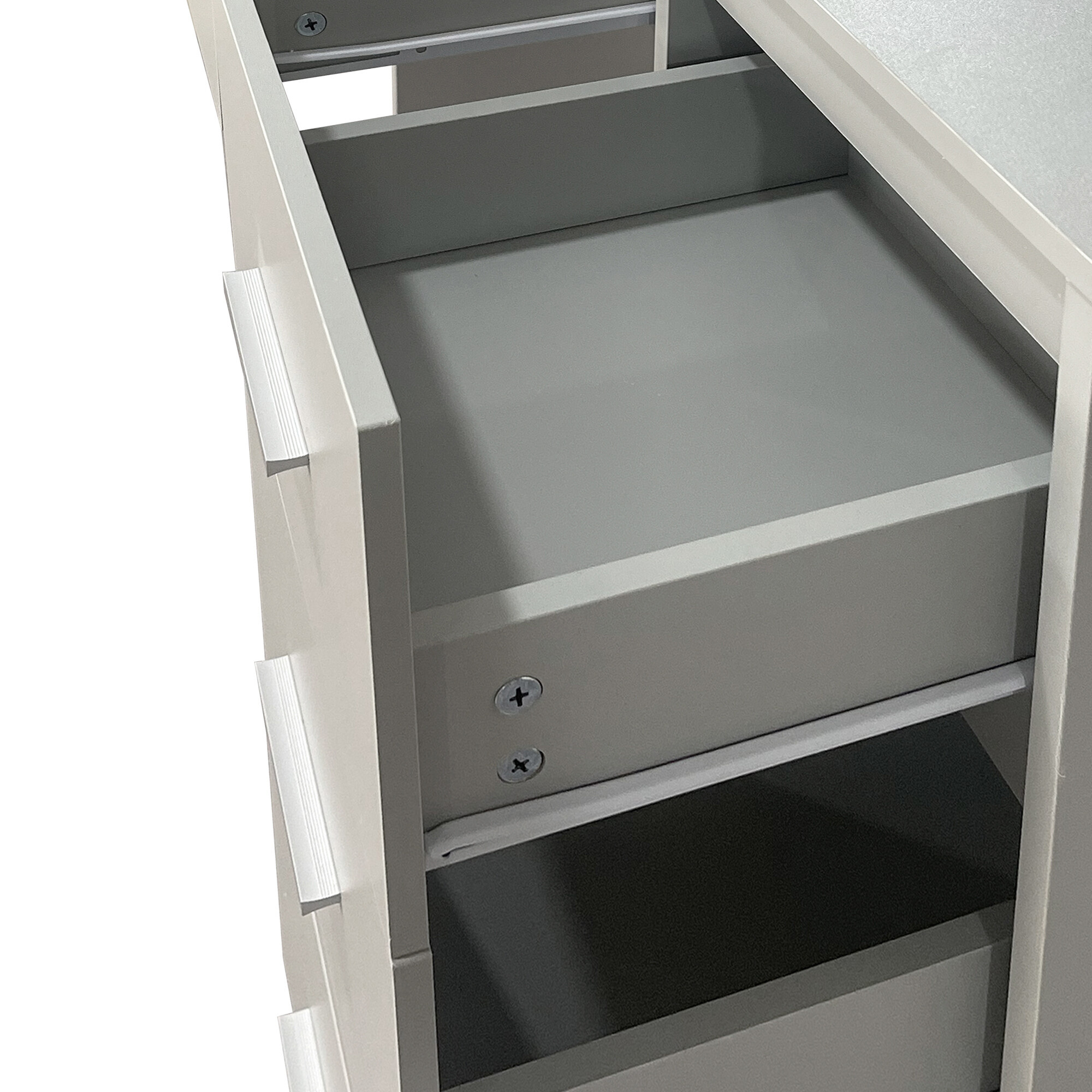 Obok lustra znajdują się dwie praktyczne otwarte półki i szuflada, na których można wyeksponować ulubione kosmetyki, perfumy lub dekoracje. Cztery przestronne szuflady oferują wystarczająco dużo miejsca do przechowywania makijażu, biżuterii i innych akcesoriów, które zawsze będziesz mieć pod ręką.