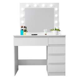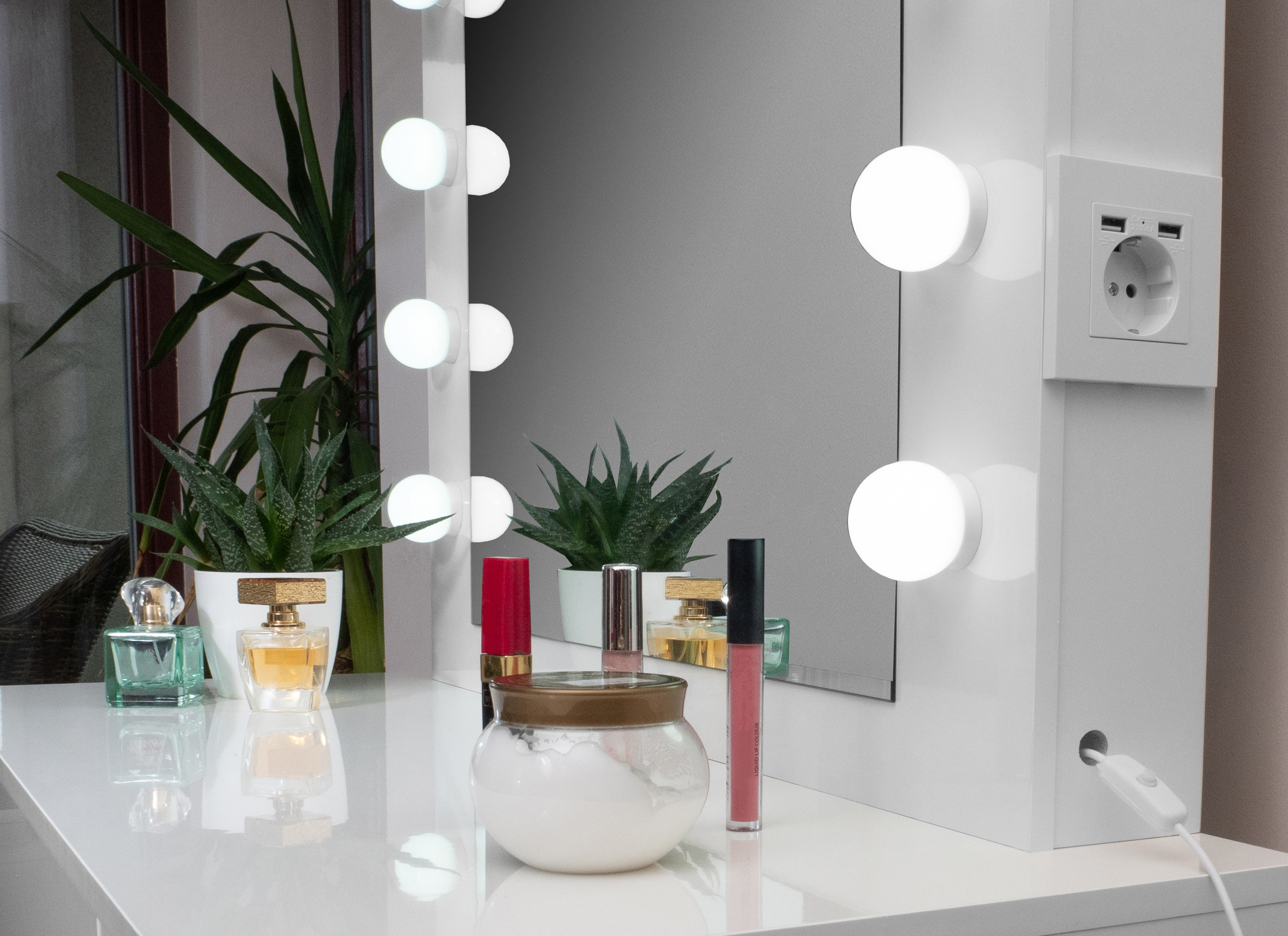 W lustrze znajduje się 12 żarówek LED, dzięki czemu możesz wygodnie wykonać makijaż nawet przy słabym oświetleniu naturalnym.Z boku lustra znajduje się gniazdko elektryczne, np. na suszarkę, prostownicę do włosów oraz złącza USB do ładowania urządzeń mobilnych.