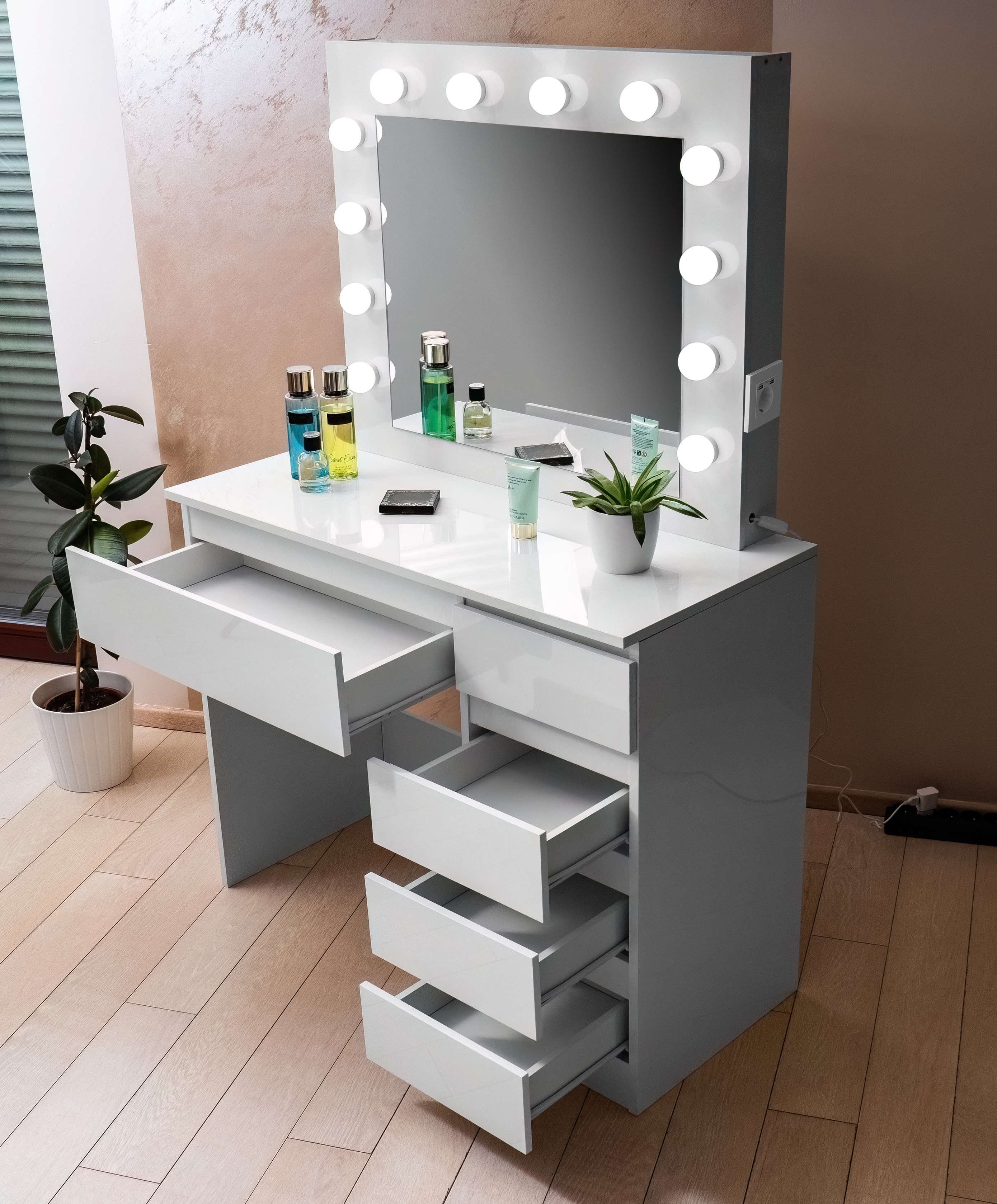Docenisz 5 pojemnych szuflad, w których wygodnie przechowasz wszystkie kosmetyki, biżuterię i inne akcesoria.