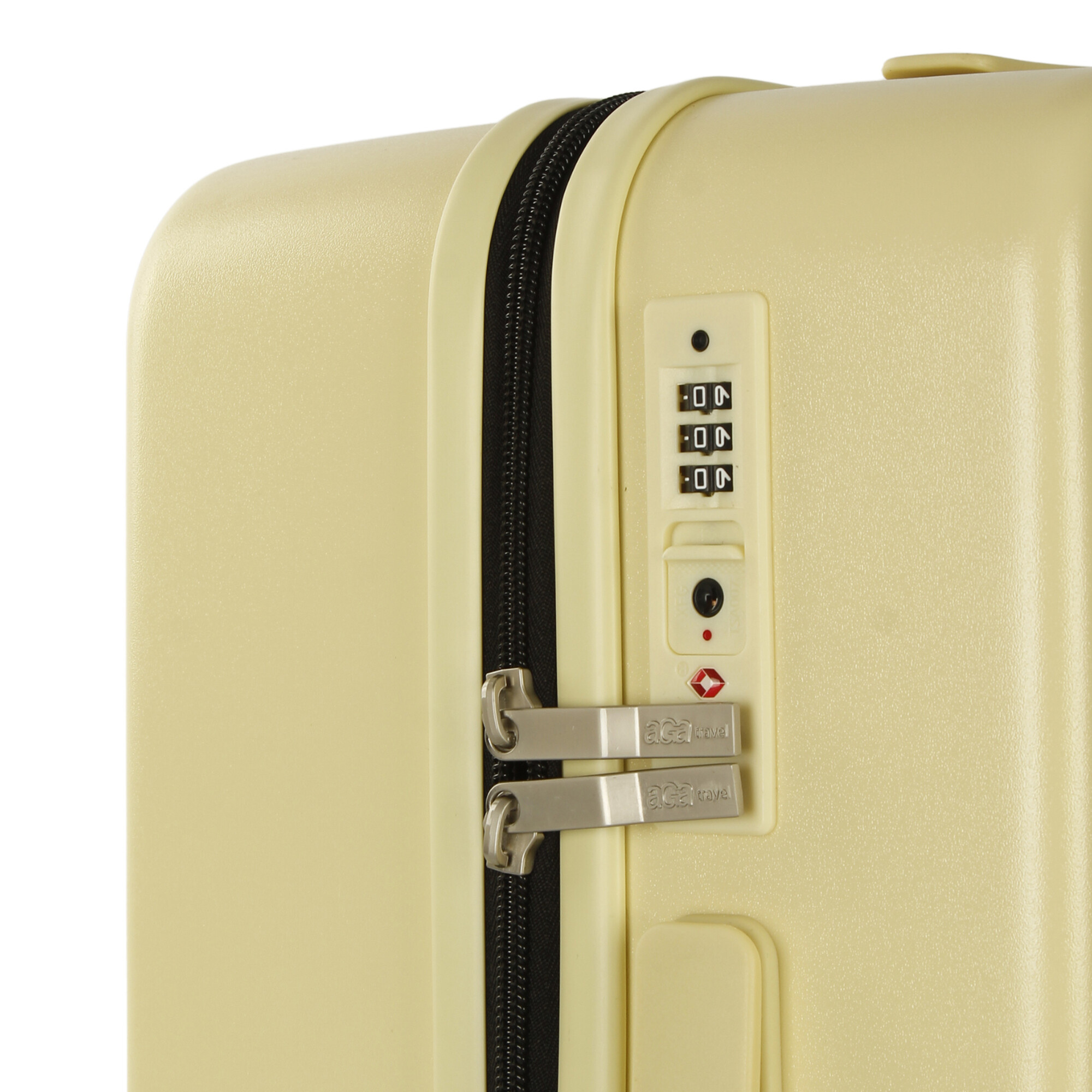 Zamek szyfrowy z trzema cyframi, w który wyposażony jest walizka, zapewnia bezpieczne przechowywanie rzeczy. Walizka jest zapinana na zamek błyskawiczny w kolorze walizki. Oba suwaki można podłączyć do wpuszczanego zamka szyfrowego.