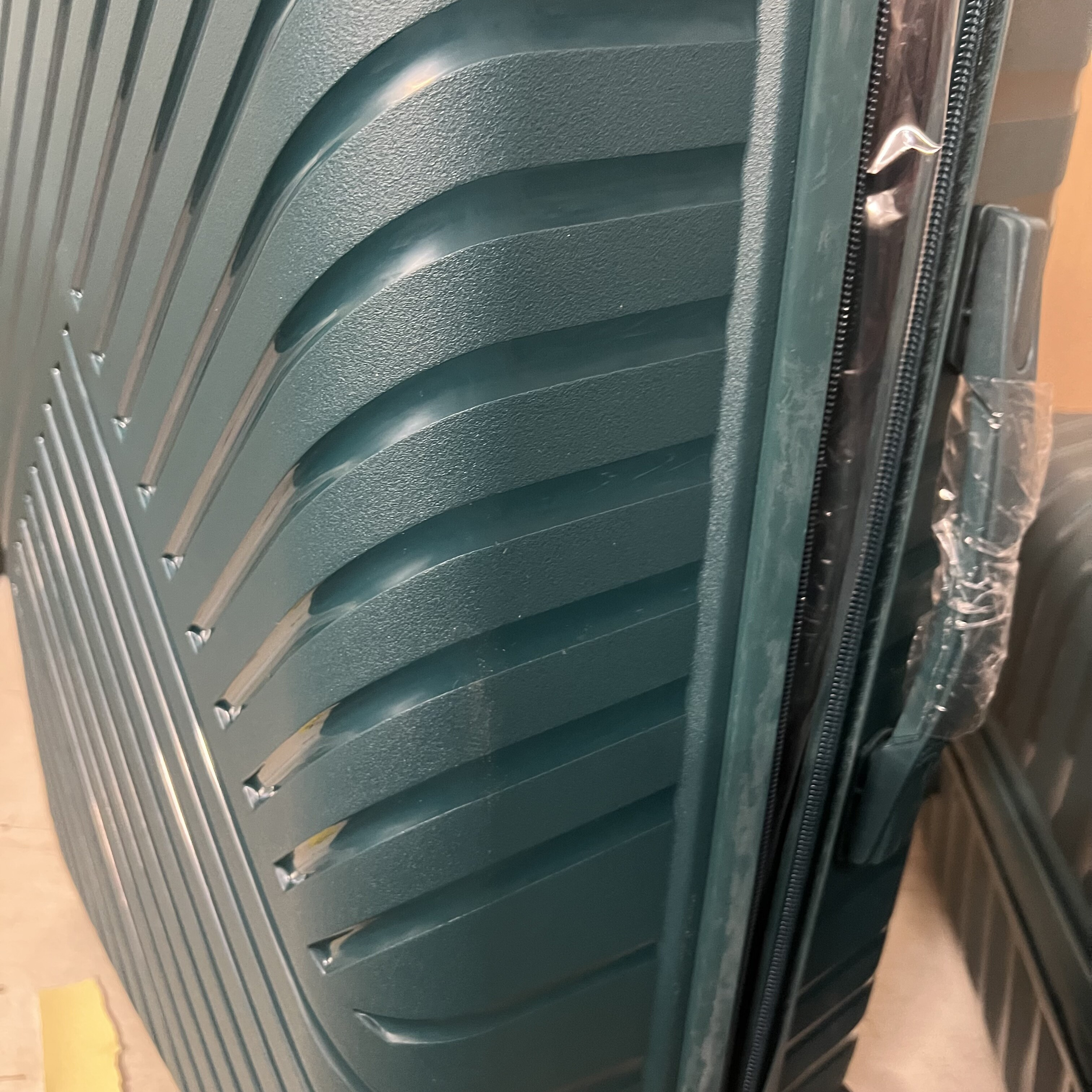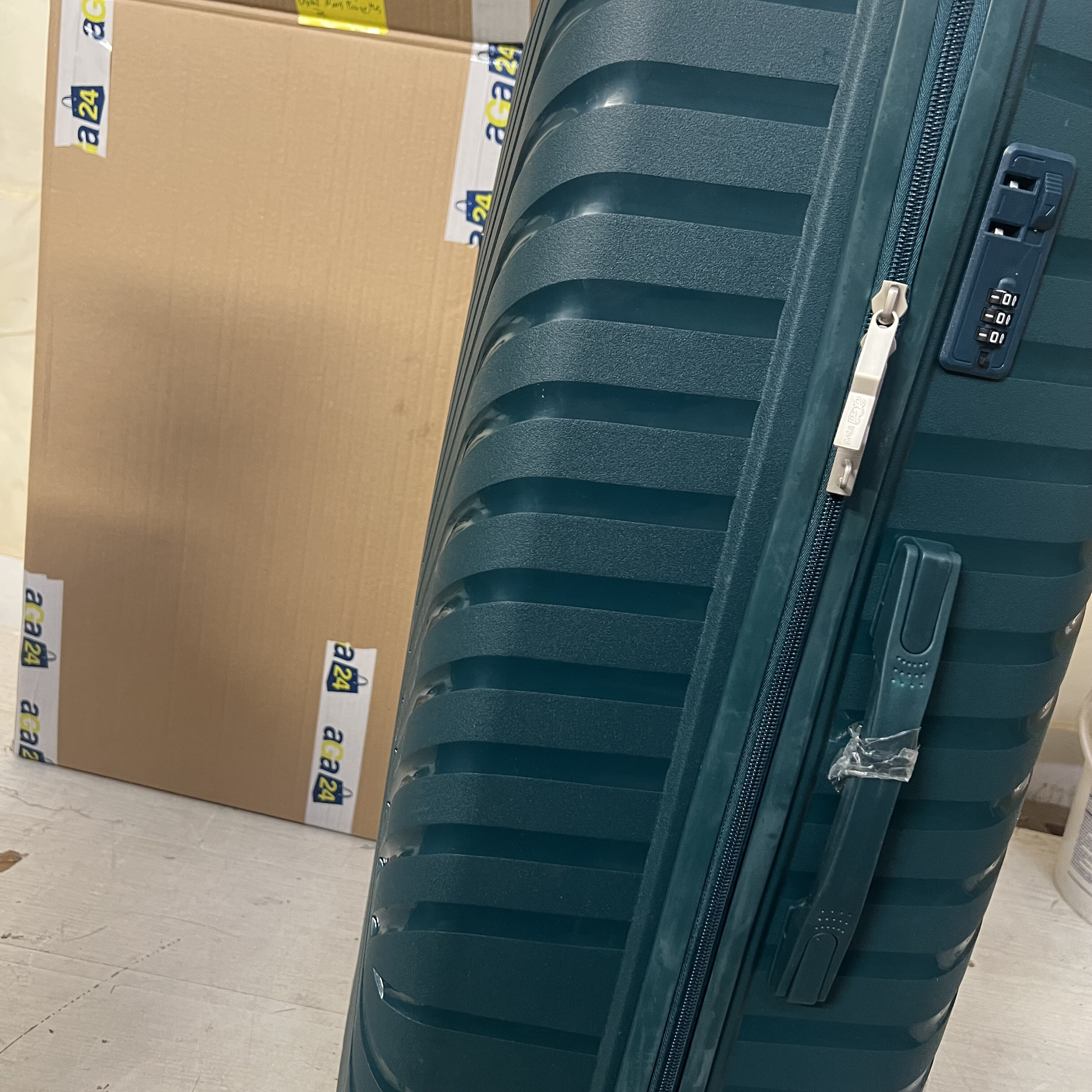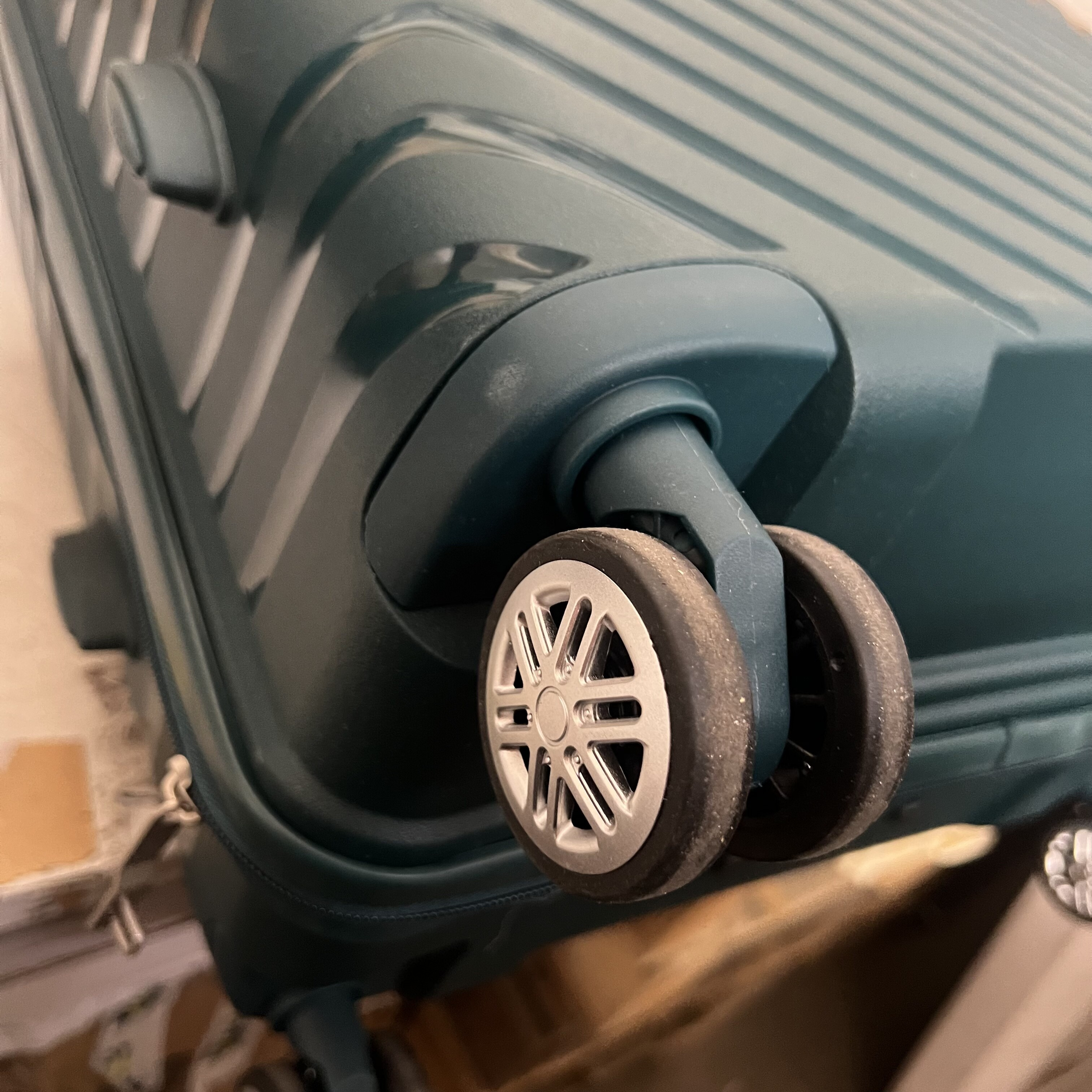 Kółka są lekko zabrudzone, a powierzchnia walizki ma lekkie zarysowania.