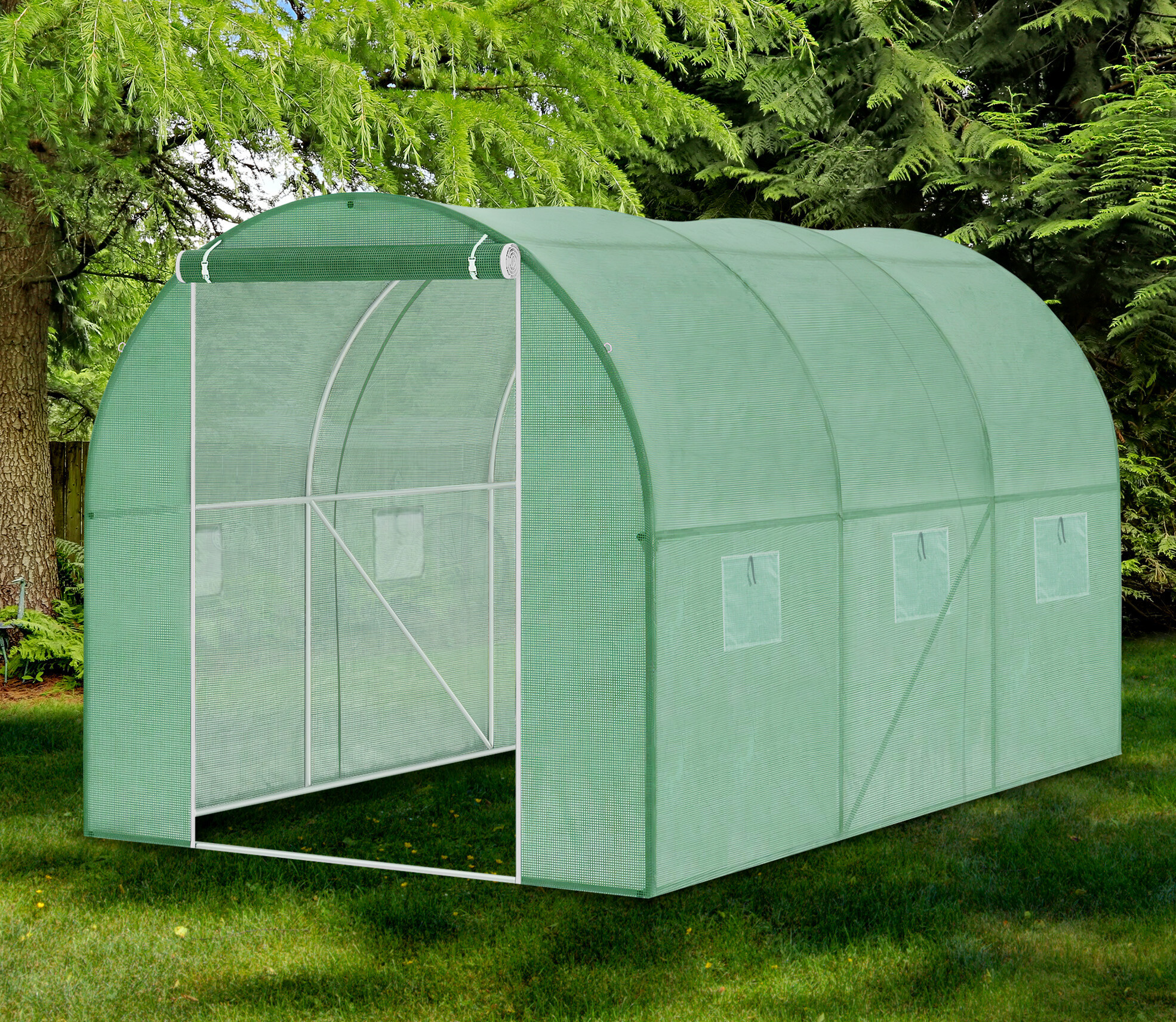 Szerokie zwijane drzwi z podwójnymi zamkami błyskawicznymi ułatwiają wejście.Brama rolowana może być zwijana i mocowana na górze.