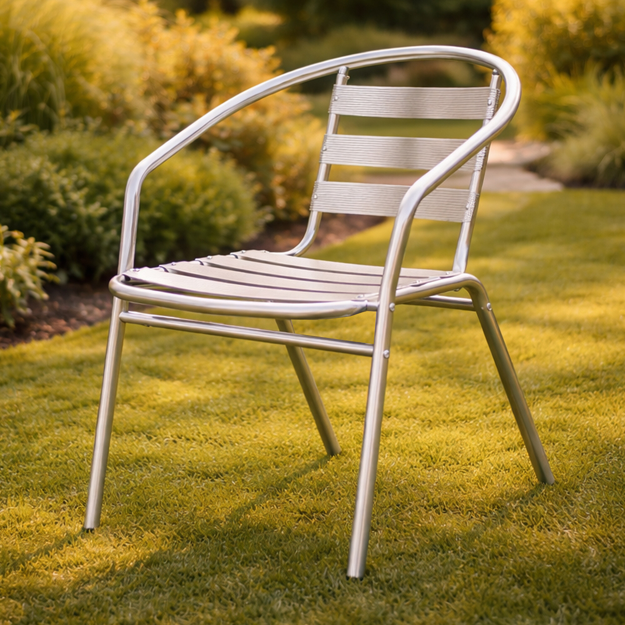 Krzesło ogrodowe z całkowicie aluminiową konstrukcją, w nowoczesnym designie, odpowiednie do ogrodów, tarasów, werand, balkonów czy restauracji ogrodowych.