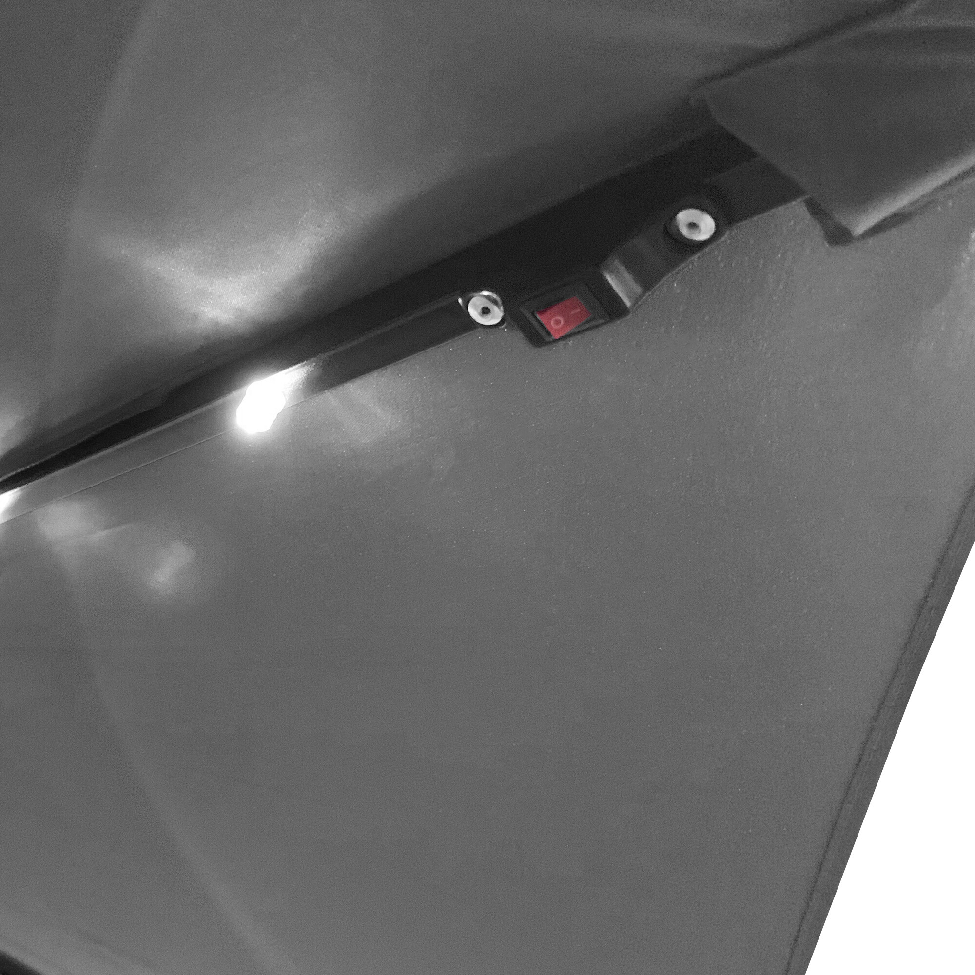 Parasol ma 24 diody LED wzdłuż żeber, które są zasilane przez panel słoneczny umieszczony na górze parasola. Oświetlenie LED tworzy przyjemną atmosferę w ogrodzie podczas wieczornego siedzenia.