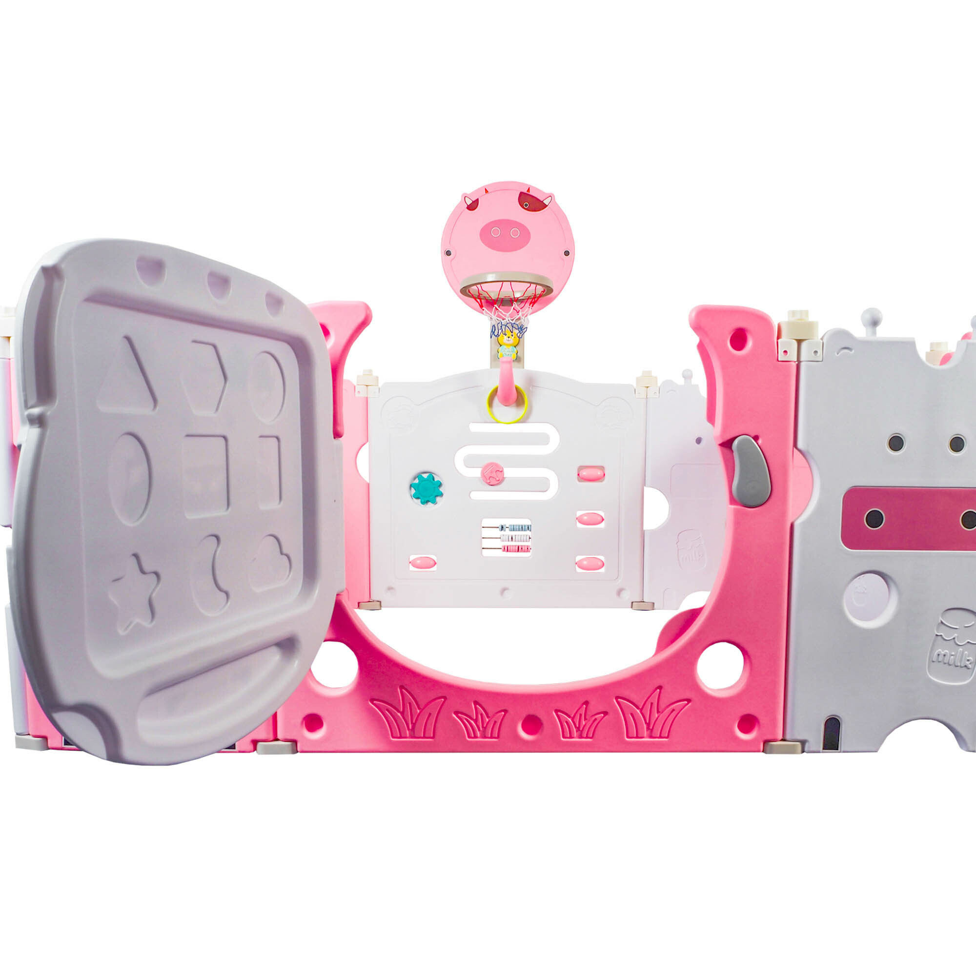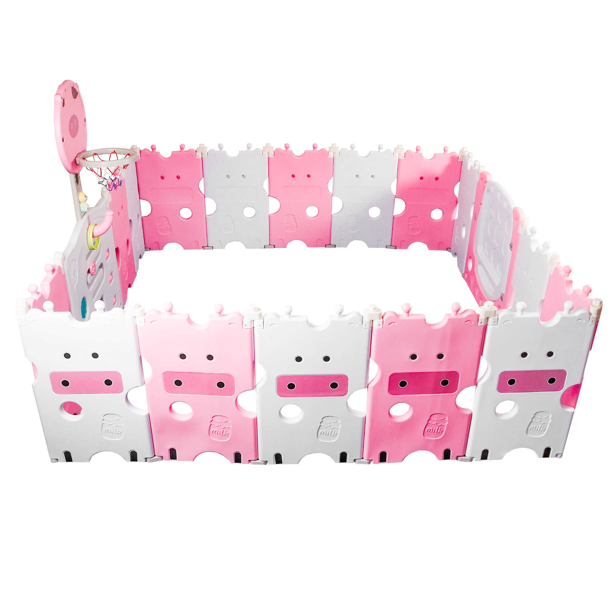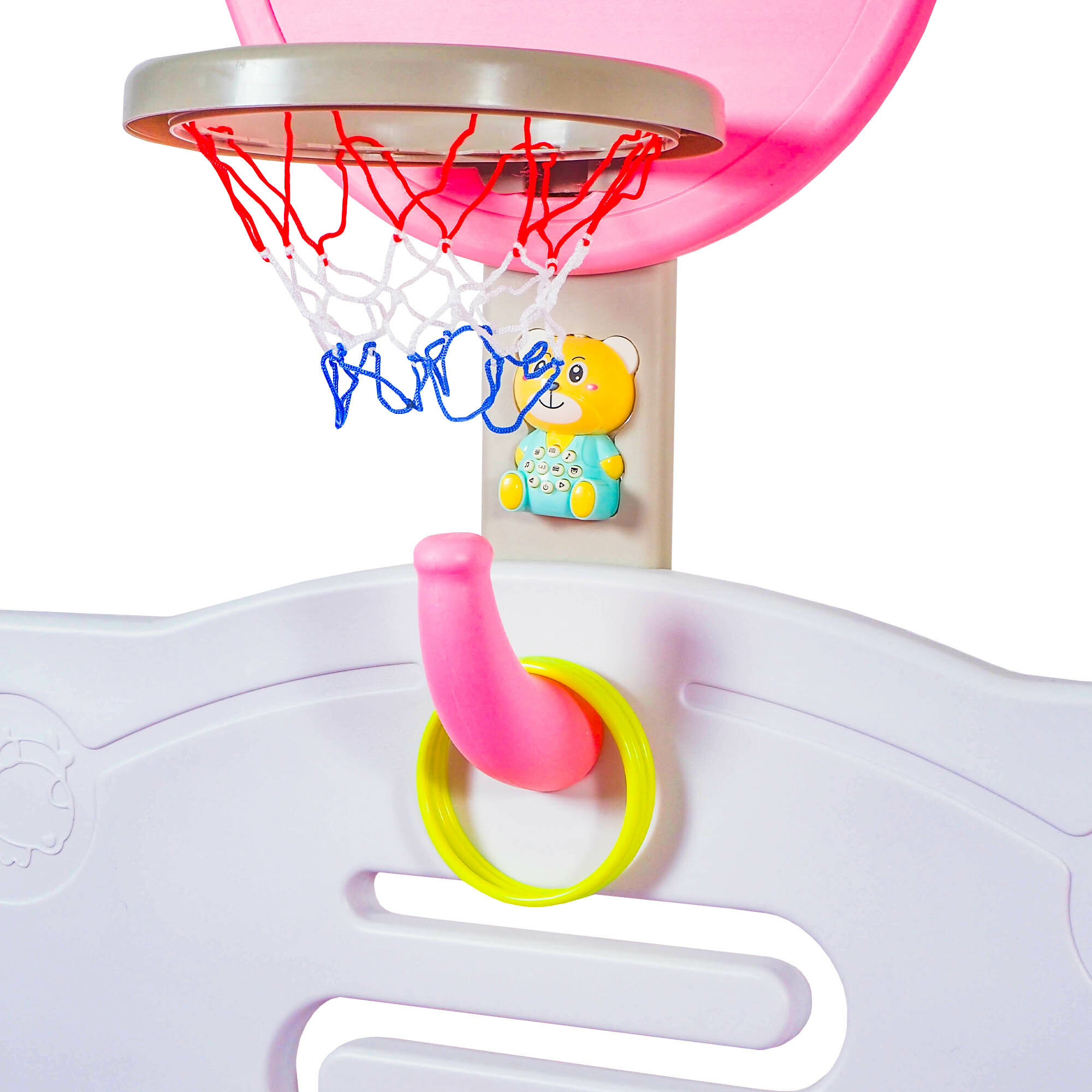 Plastikowy kojec to nie tylko zwykłe miejsce do zabawy. Jest wyposażony w obręcz do koszykówki i piłkę, dzięki czemu dzieci mogą rozwijać swoje umiejętności motoryczne i koordynację. Ponadto kojec zawiera interaktywnego misia z efektami dźwiękowymi, który bawi dzieci i stymuluje ich rozwój sensoryczny. Miś wydaje różne dźwięki, które pobudzają ciekawość dzieci i wspierają ich rozwój poznawczy.