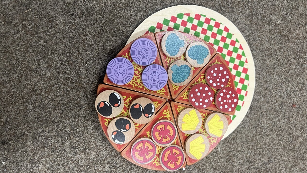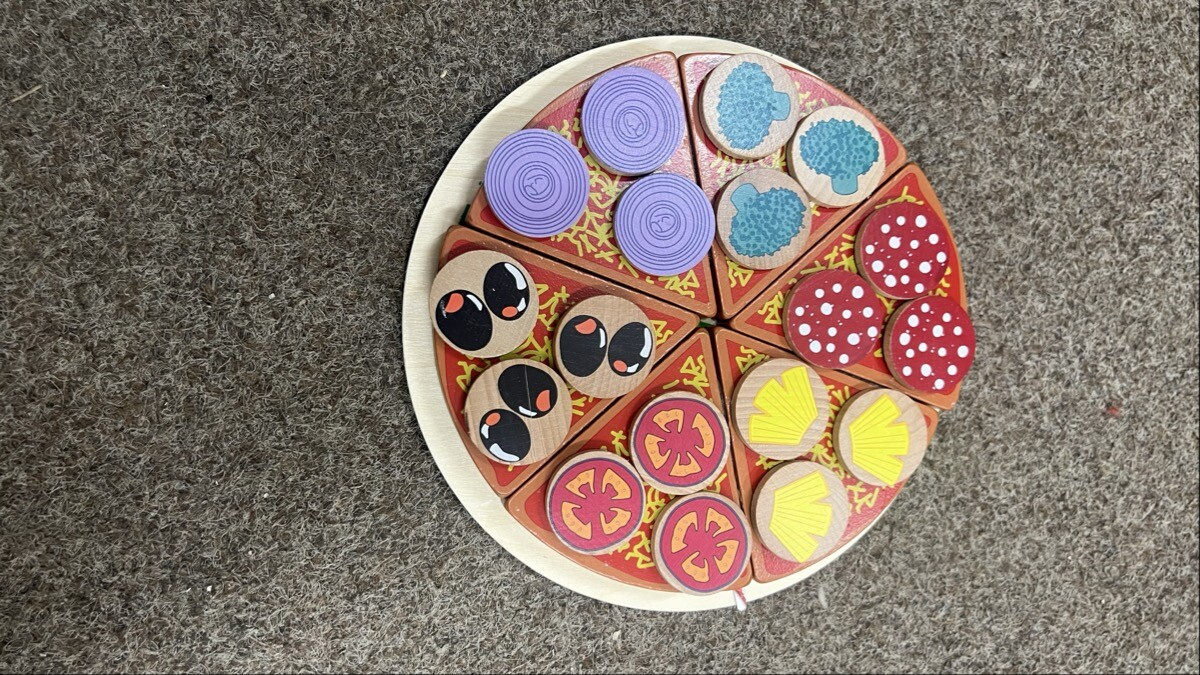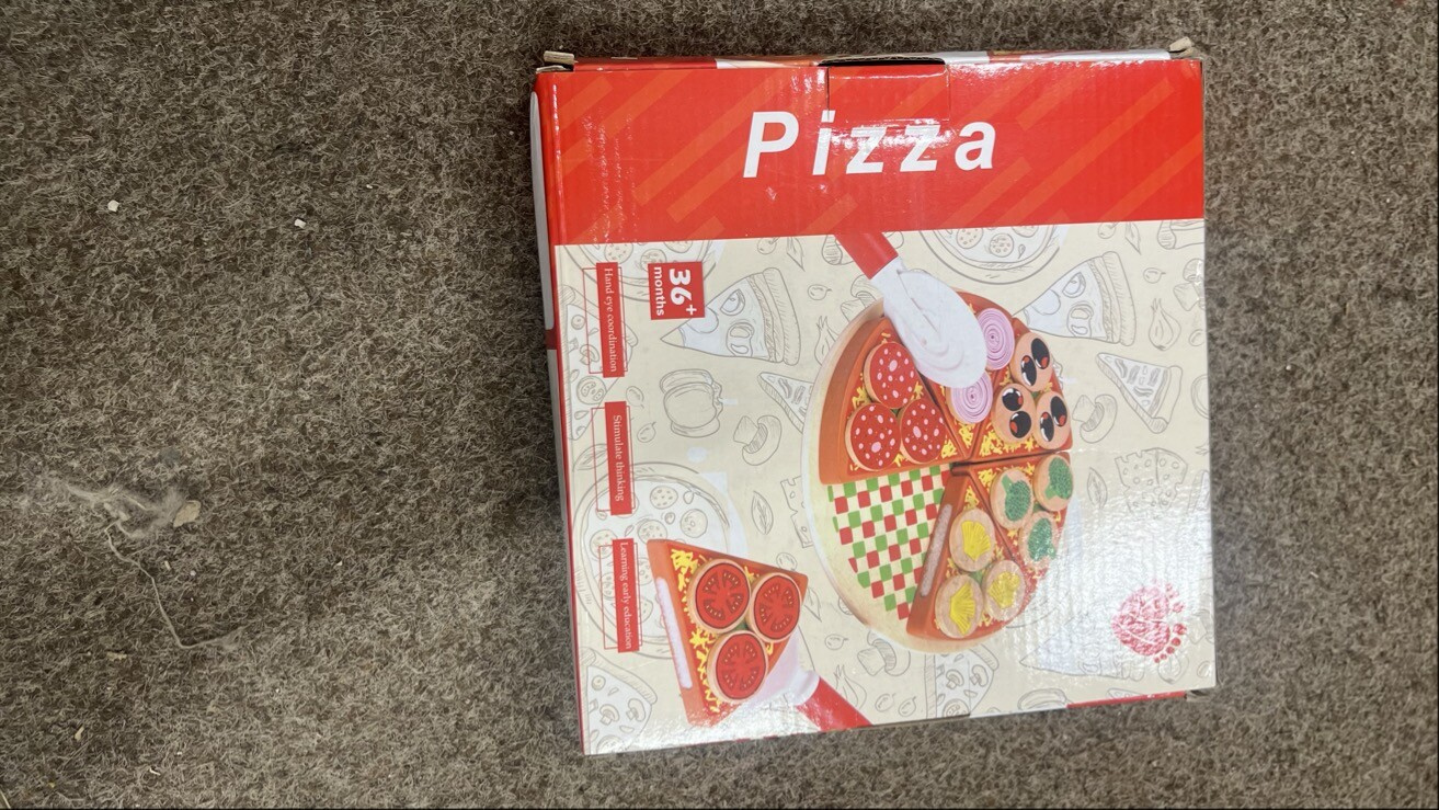 - Zestaw zawiera drewniany okrągły nóż, łopatkę do nabierania kawałków pizzy, drewnianą deskę i pizzę z dodatkami