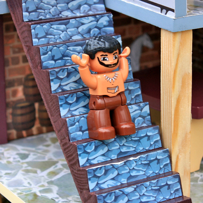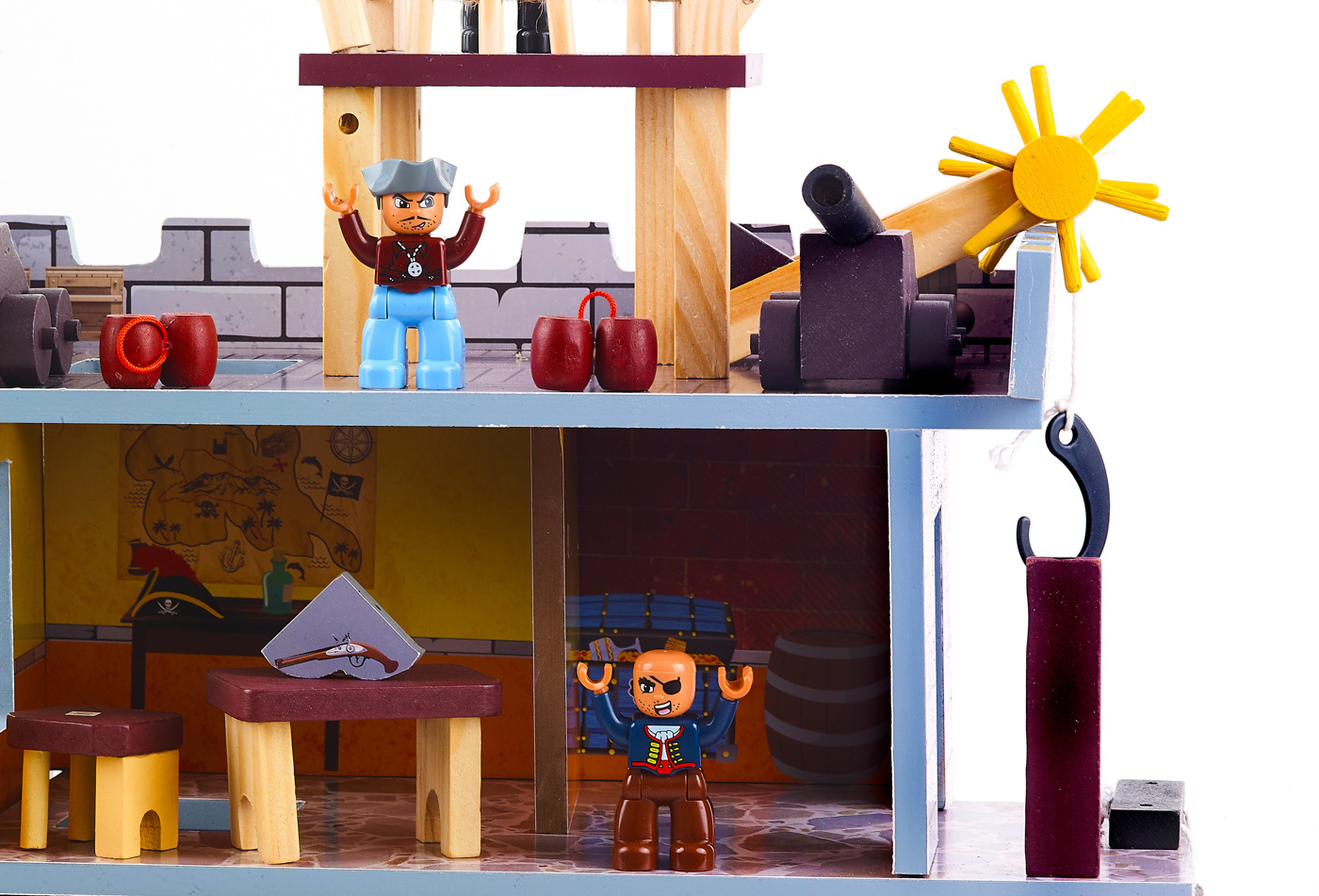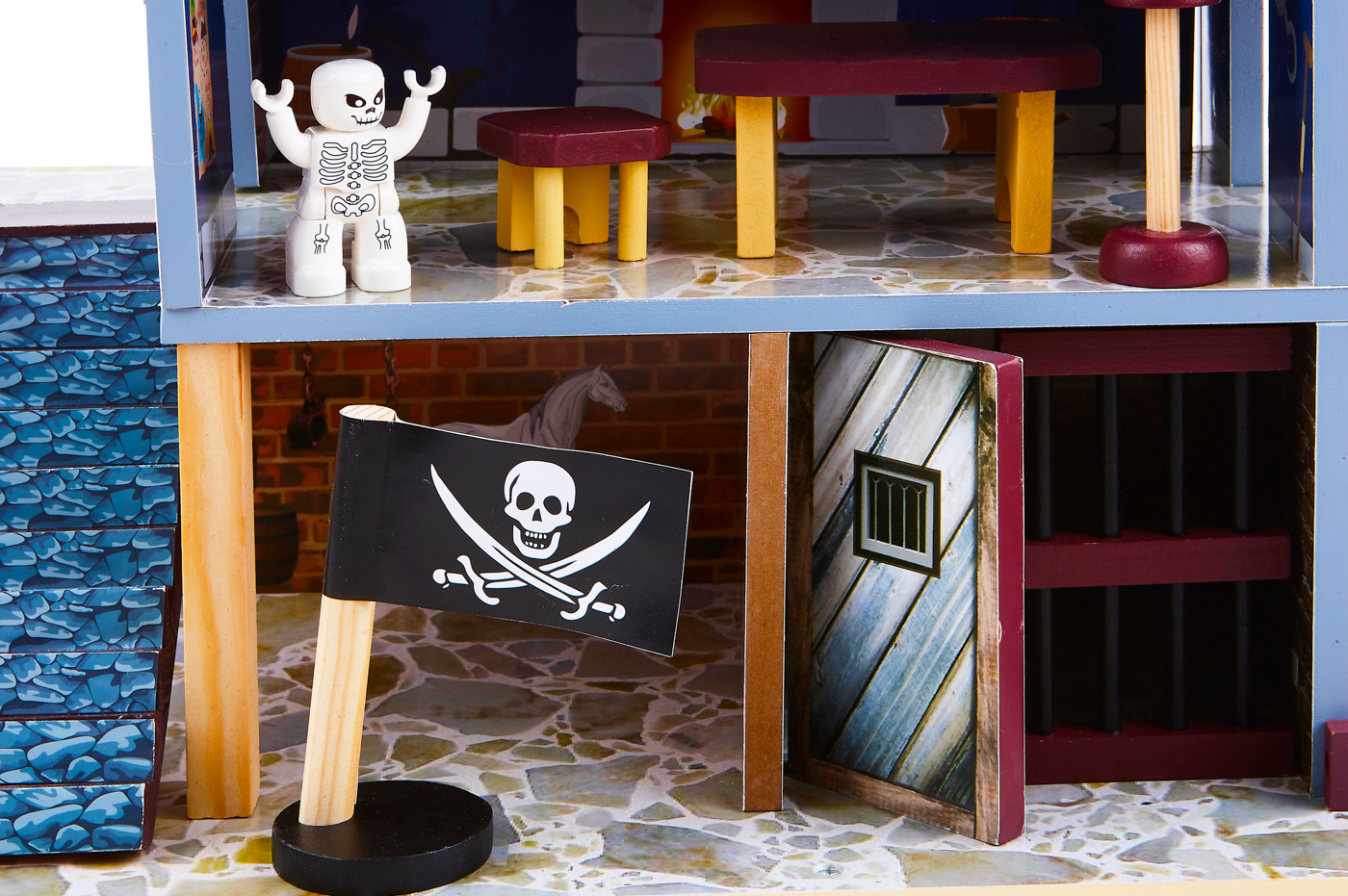 - Jest tu cela więzienna, wieża strażnicza z flagą i dwoma armatami oraz przystań dla pirackiego statku
