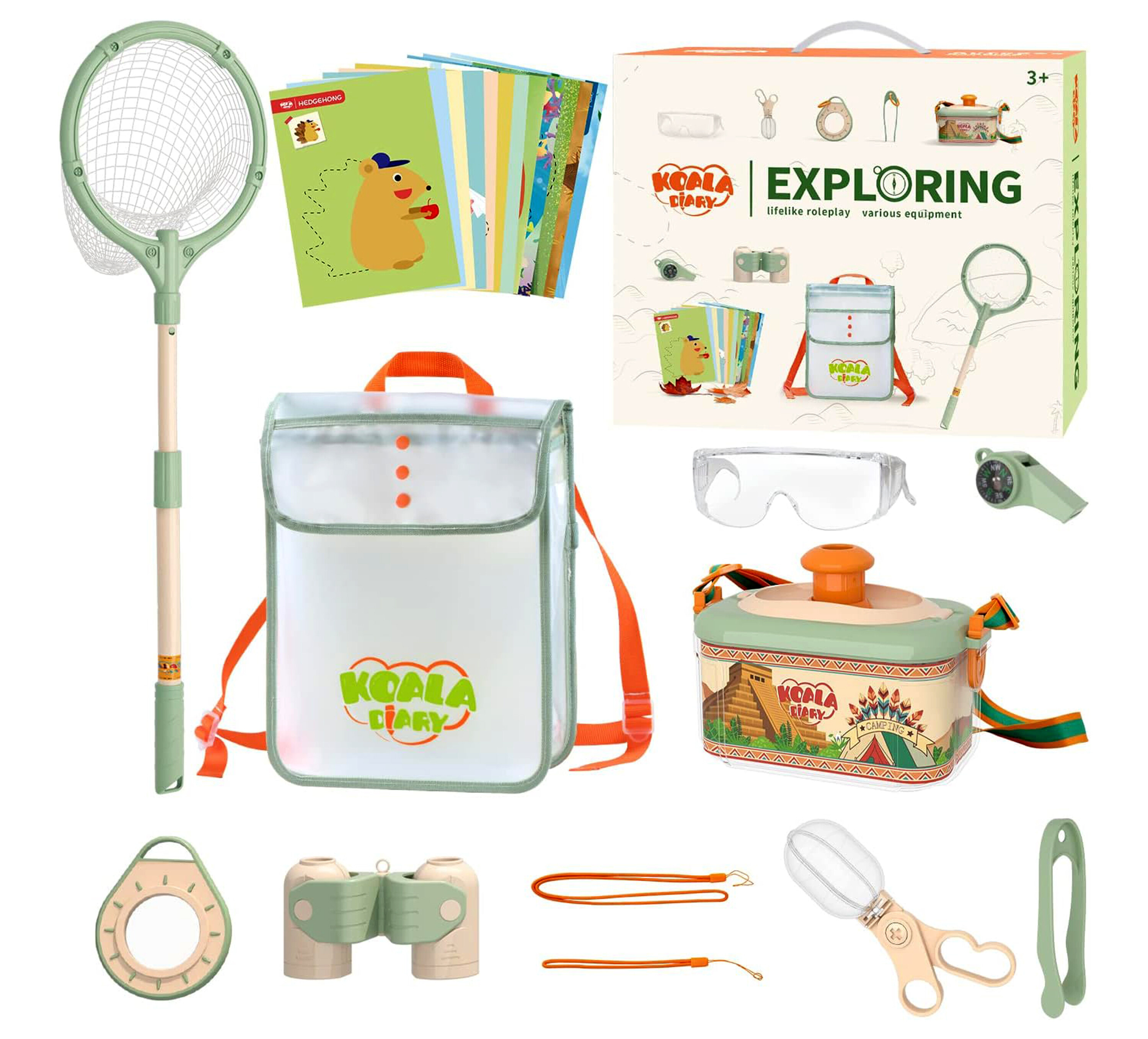 W zestawie znajduje się siatka na owady, ułatwiająca łapanie owadów w celu obserwacji. Wielofunkcyjny gwizdek, który może służyć również jako kompas. Lornetka z możliwością regulacji kąta widzenia, szkło powiększające i wiele innych przydatnych narzędzi do eksploracji przyrody.