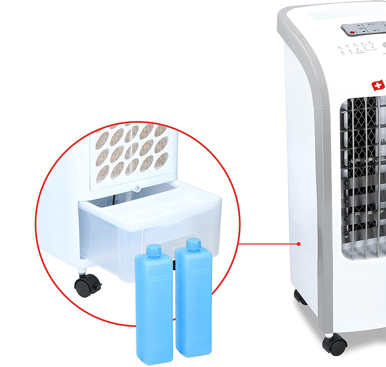 Powietrze w chłodnicy przechodzi przez zimną wodę lub lód, dzięki czemu zapewnia znacznie lepsze chłodzenie niż konwencjonalny wentylator. W zestawie znajdują się dwie podkładki chłodzące, których można używać naprzemiennie. Możesz monitorować poziom wody z przodu zbiornika.