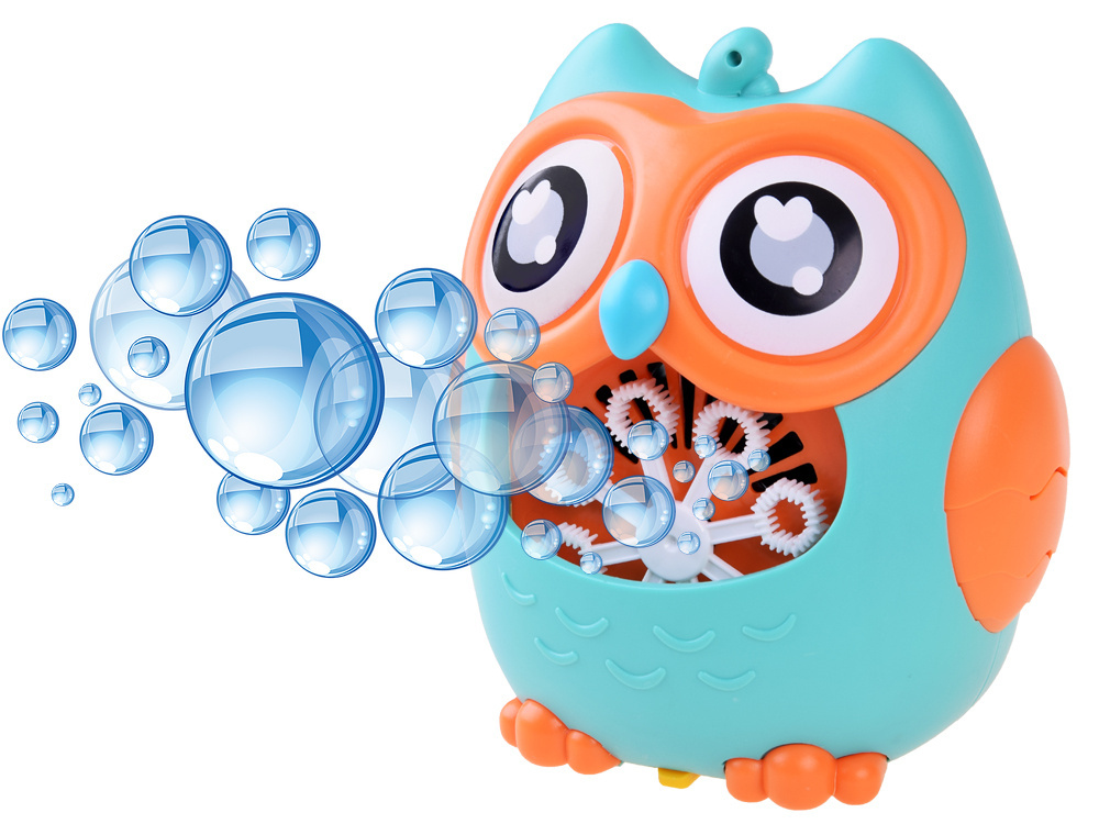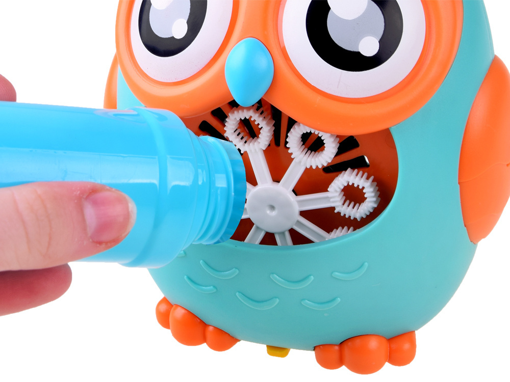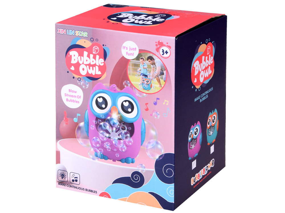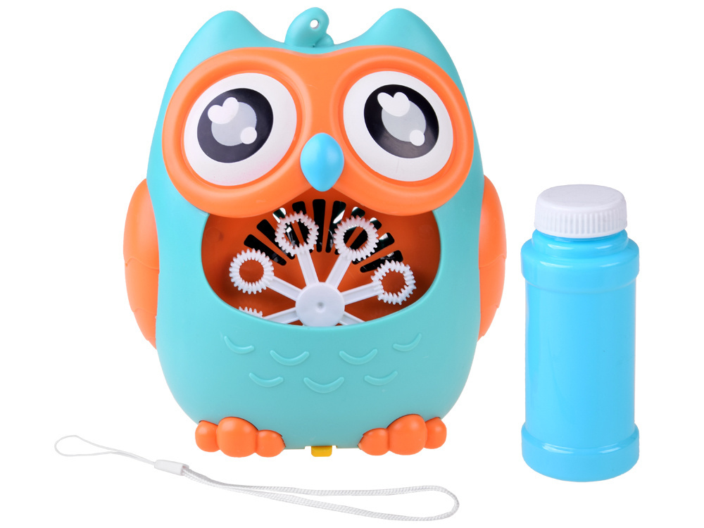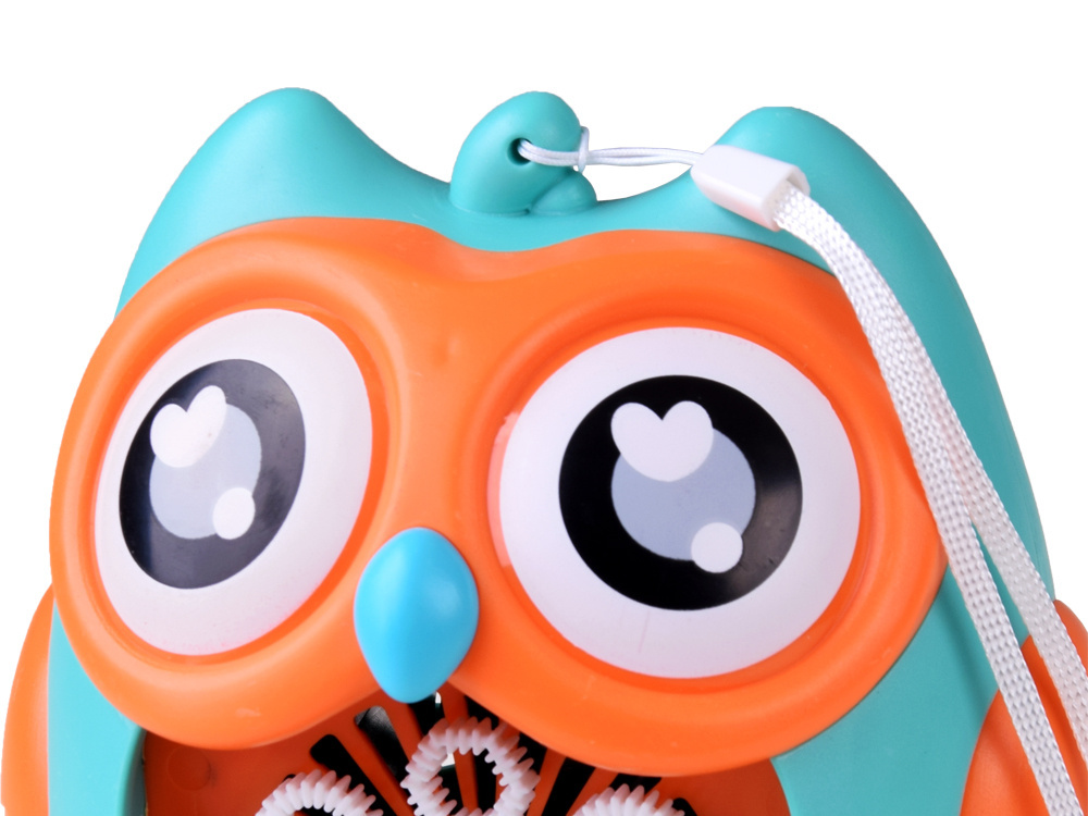 Bańki mydlane to ulubiona zabawa małych i dużych dzieci. Rewelacyjna maszynka do robienia baniek mydlanych w kształcie uroczej Sowy na pewno zapewni mnóstwo radości każdemu dziecku. Zabawka pozwala na puszczanie kolorowych baniek z automatu. Wystarczy tylko nalać płyn do otworu, w którym znajduje się tarcza z oczkami, włączyć przycisk znajdujący się za jednym z uszu sówki uruchamiając wiatraczek i obrót tarczy, który podczas kręcenia wypuszcza magiczne, tęczowe bańki. Ale to nie wszystko za drugim uchem sowy został ukryty przycisk z nutką wciskając go zacznie wydobywać się wesoła melodia. W zabawce po włączeniu świeci się czerwone światełko co dodatkowo urozmaici zabawę naszym pociechom szczególnie w ciemności. Na czubku głowy sowy została umieszczona smycz dzięki, której maszynkę do baniek można będzie powiesić w dowolnym miejscu.