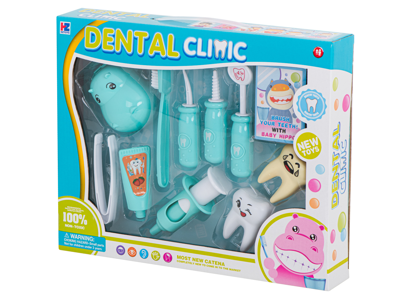 Zestaw zwiera wszystkie niezbędne elementy potrzebne dla małego dentysty do wyleczenia ząbków hipopotama i pluszowych przyjaciół: