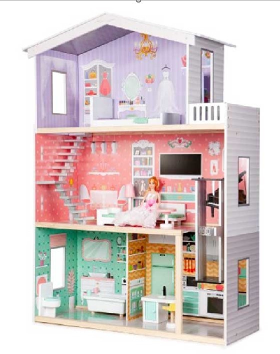 Wyjątkowy domek dla lalek z mebelkami. Domek posiada 4 oddzielne pokoje oraz balkon i windę, a także dużą ilość mebelków. Doskonale pobudzi wyobraźnię i zagwarantuje zabawę na długie godziny. Tworzywo: drewno. Wiek dziecka: 3+. Wymiary domku: 82x30x117cm.Pełny opis