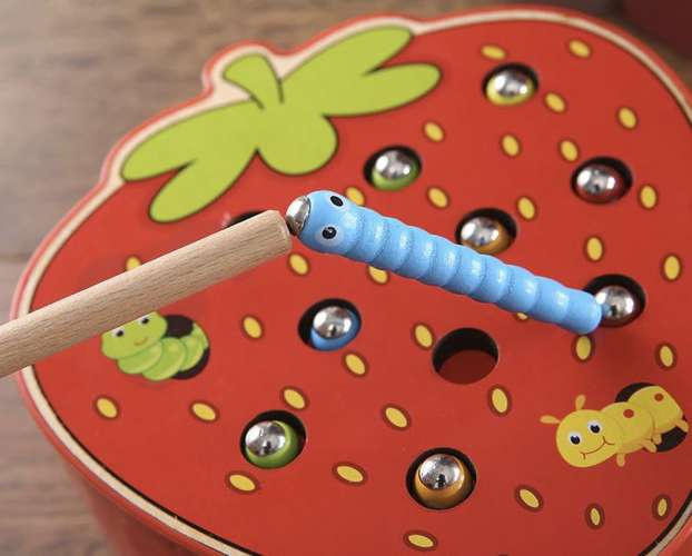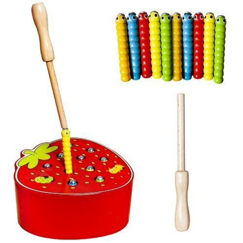 ZŁAP ROBACZKA! - ta wyjątkowa gra drewniana to doskonały pomysł na zajęcie malucha. Zabawa polega na chwytaniu drewnianym kijkiem zakończonym magnesem robaczków ukrytych w otworkach znajdujących się w owocu a następnie na ich ponownym wkładaniu. Jest to spore wyzwanie dla malucha, które wymaga skupienia uwagi oraz sprawności manualnej.