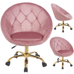 Wyrafinowany design w połączeniu z nowoczesnością tworzą ten stylowy fotel. Obrotowy, na kółkach, wykonany z przyjemnego w dotyku weluru w klasycznym i uniwersalnym odcieniu różu, stanie się ozdobą każdego biura, toaletki, salonu kosmetycznego czy pokoju młodzieżowego.