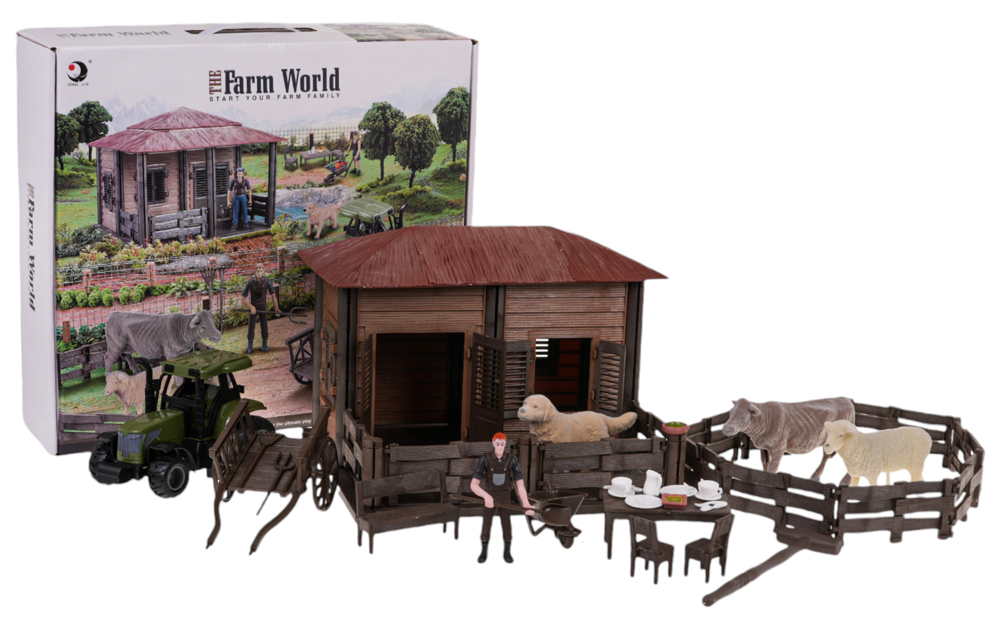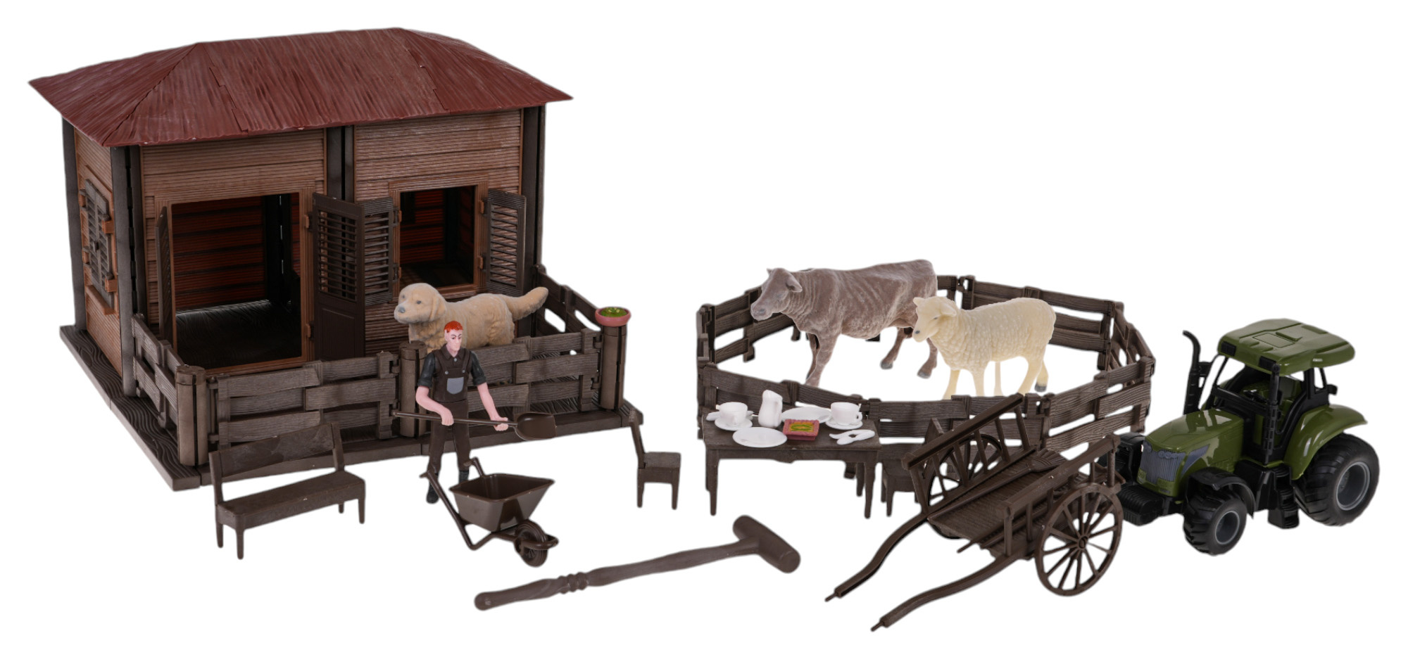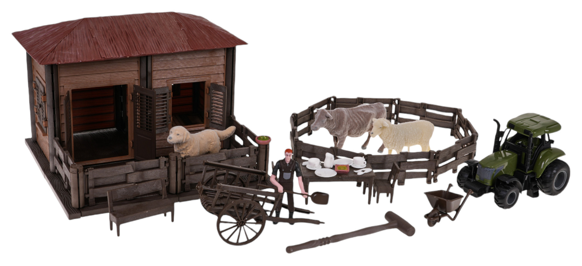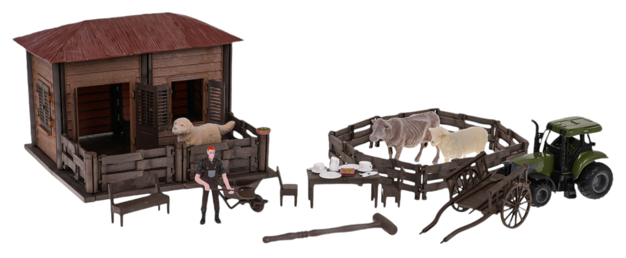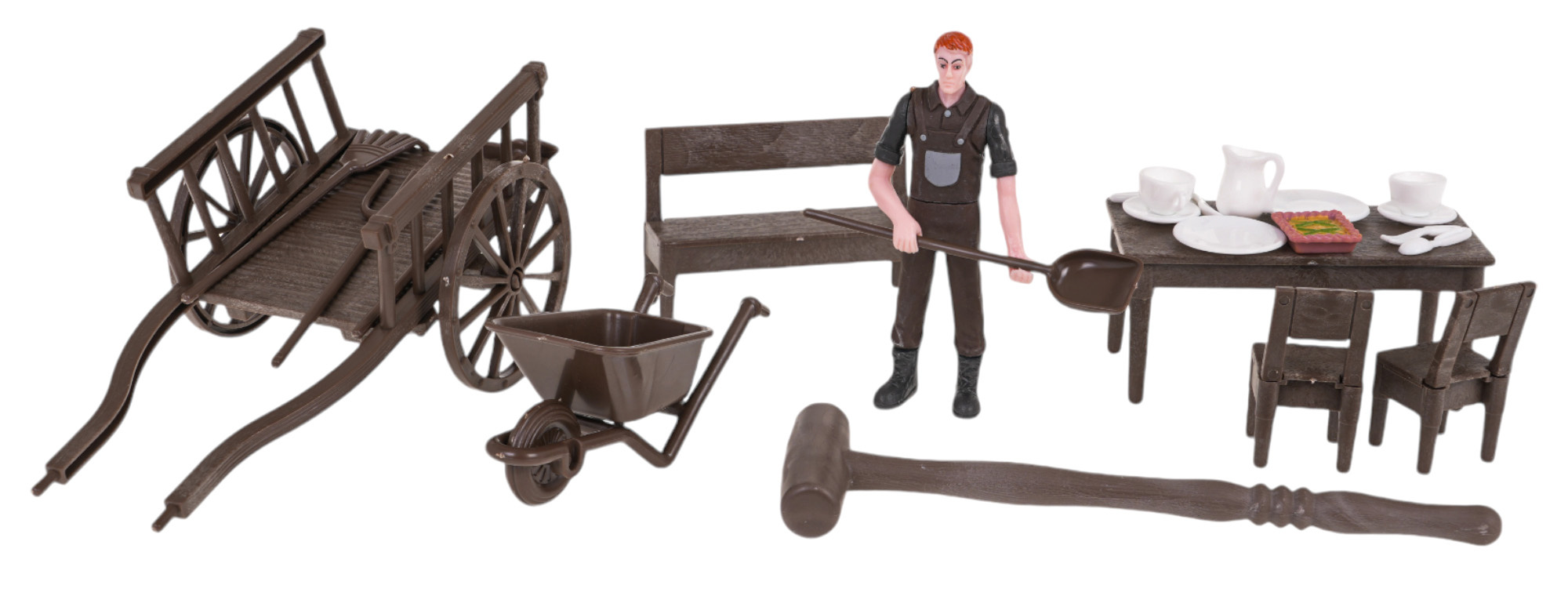 | - domek rolnika, - łóżko, - stół, - 2 x krzesło, - ławka, - wózek ręczny, - taczki, - traktor, - zagroda, - piesek, - figurka rolnika, - krówka, - owieczka, - 2 x doniczka ze spodkiem, - 2 filiżanki, - 2 podstawki, - dzbanek, - 2 łyżki, - 2 widelce. - 4 x narzędzia rolnicze, - młotek. |