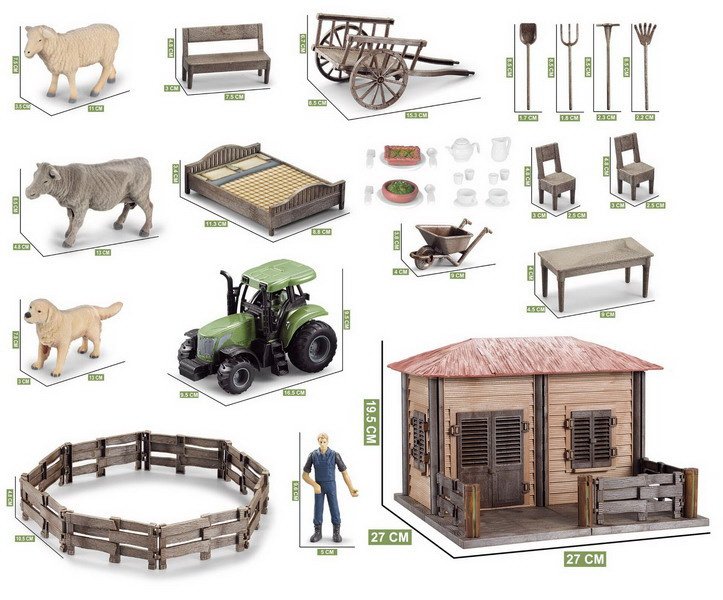 | Wymiary | - domek rolnika ok.27 cm x 27 cm x 19 cm, - łóżko ok. 11,5 cm x 9 cm x 3,5 cm, - stół ok. 9 cm x 4,5 cm x 4 cm, - krzesło ok. 4 cm x 2 cm, - ławka ok. 7,5 cm x 5 cm x 2,5 cm, - wóz ok. 15,5 cm x 7 cm x 8,5 cm, - taczki ok. 8,5 cm x 3 cm x 5 cm, - traktor ok. 15,5 cm x 10 cm x 9,5 cm, - piesek ok. 13 cm x 8 cm x 3 cm, - figurka rolnika ok. 9,5 cm x 4,5 cm, - krówka ok. 13,5 cm x 9 cm x 4 cm, - owieczka ok. 11 cm x 8 cm x 3 cm, - opakowanie ok.37 cm x 34,5 cm x 10 cm. |