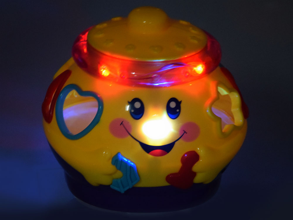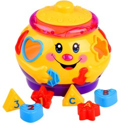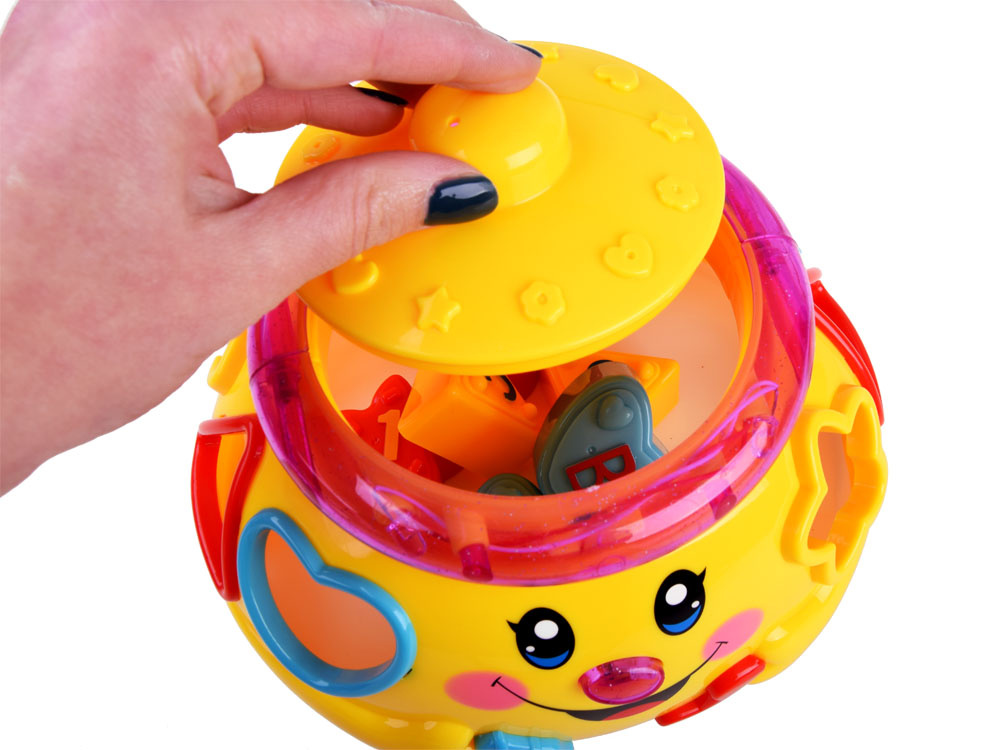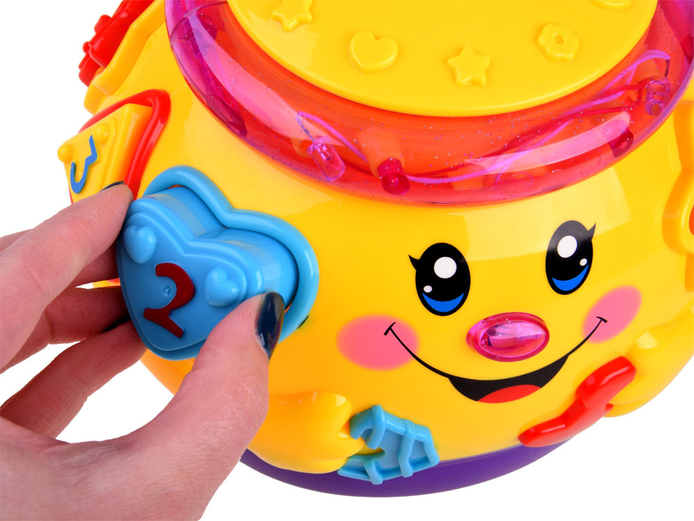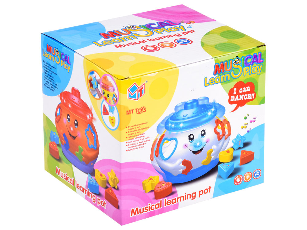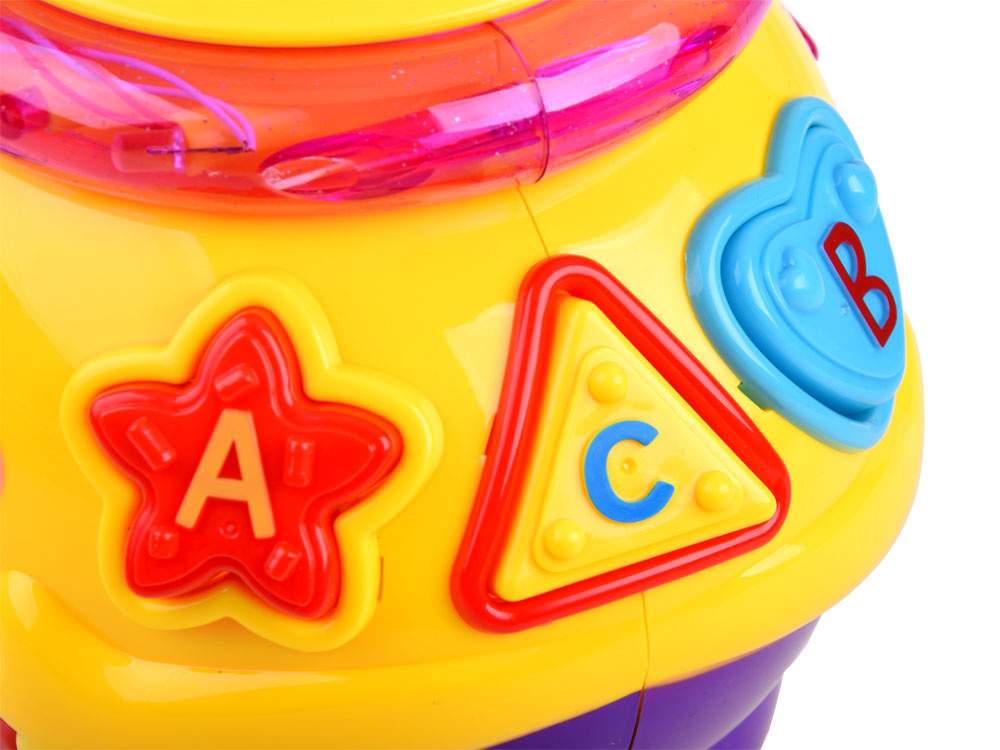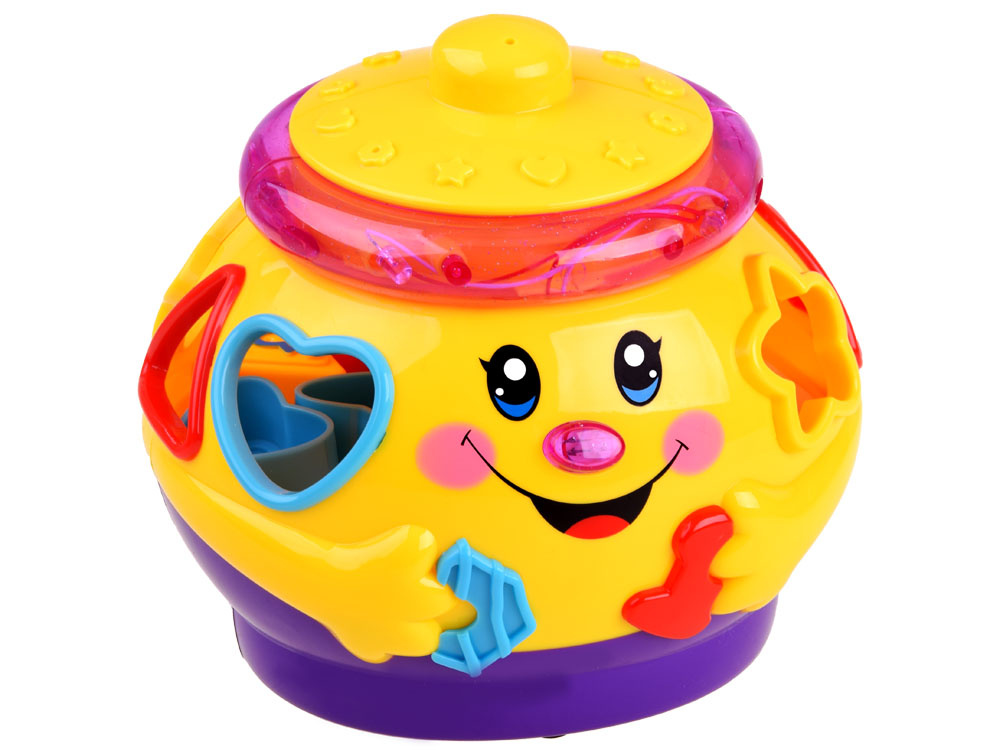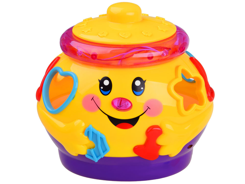 Interaktywna zabawka z serii "ucz się i baw", której celem jest nauka poprzez zabawę. Zabawka w swoim składzie posiada 6 kolorowych klocków, które należy umieścić w przeznaczonych dla nich otworach. Każdy z klocków jest w innym kształcie i z oznaczeniem cyferki lub literki. Dziecko podczas zabawy uczy się rozróżniania kształtów, kolorów. Kolorowy wesoły garnuszek po włączeniu gra wesołą muzyczkę, jeździ na kółkach i wesoła się kiwa, obręcz świeci, miga kolorowymi światełkami. Po umiejscowieniu klocków w sorterkach, znajdują się one w brzuszku garnuszka. Pojemny brzuszek garnuszka zmieści klocki ale i także zapewne inne potrzebne skarby malucha.