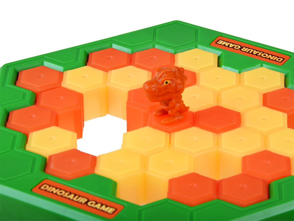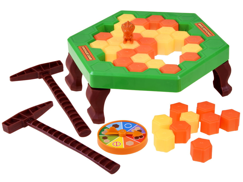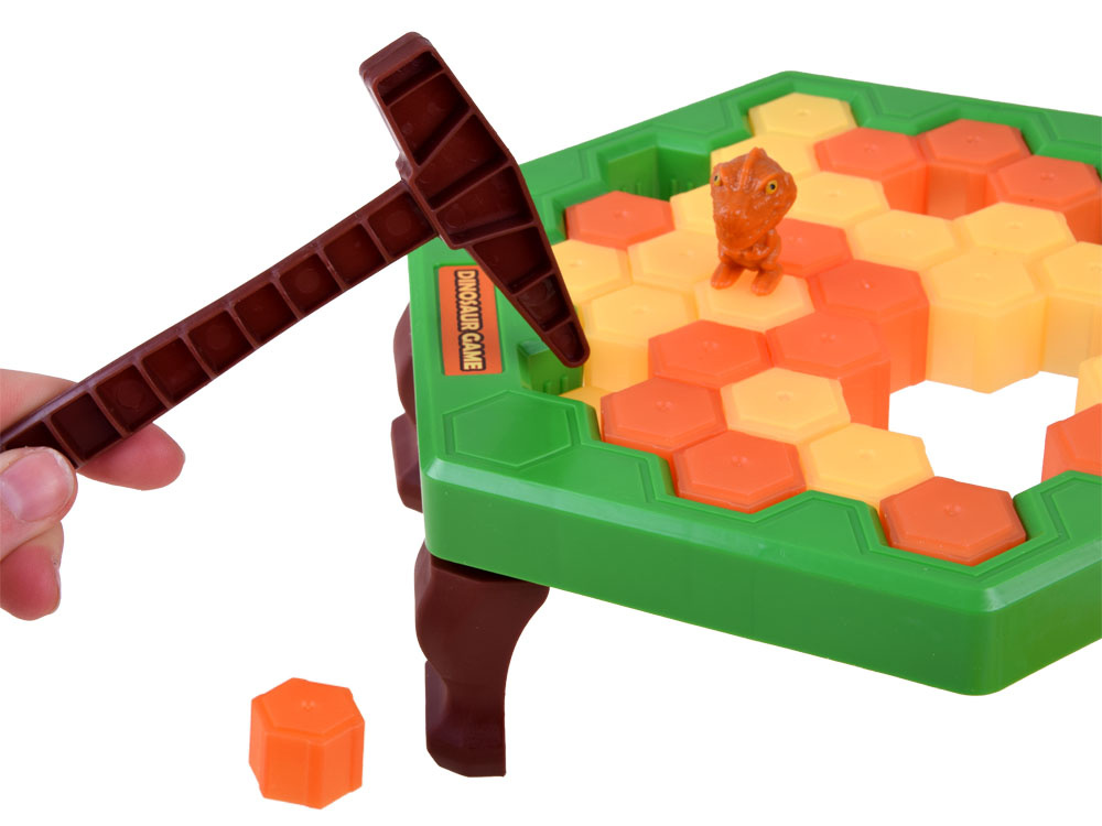 Gracze kolejno zakręcają kołem, wskazówka wyznacza, ile i jakie kolory kostek należy zbić. Jeśli wskazówka zatrzyma się na żółtym polu omija nas kolejka, jeśli na niebieskim, musimy zakręcić jeszcze raz. Kolejny etap, to podjęcie ważnej decyzji. Którą kostkę zbić, tak, by nie strącić dinozaura? Z każdą kolejną rundą decyzja jest trudniejsza. Młotek w dłoń! Czas na zbicie wybranej kostki...Obserwuj taflę i zdecyduj, jak mocno uderzyć. Przegrywa osoba, która spowoduje załamanie tafli wraz z dinozaurem.