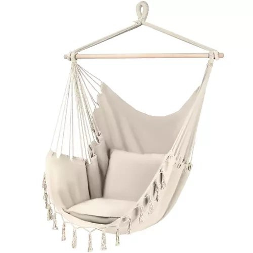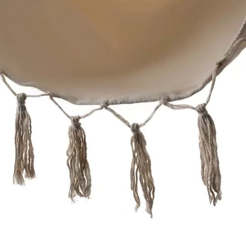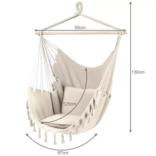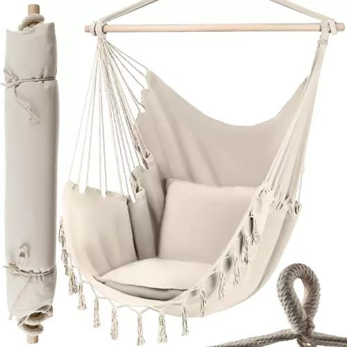 WYTRZYMAŁY MATERIAŁ – 65% bawełna zapewnia odpowiednią wentylację , co wpływa na komfort użytkowania wiszącego fotela nawet w upalne dni . Za wytrzymałość siedziska odpowiada 35% domieszka poliestru. Stałe koło montażowe połączone jest z wytrzymałymi linami , równomiernie rozmieszczonymi po bokach hamaka poprzez drewnianą poprzeczkę. Dzięki takiej konstrukcji urządzenie można łatwo zawiesić , a hamak jest dobrze wyważony i stabilny .