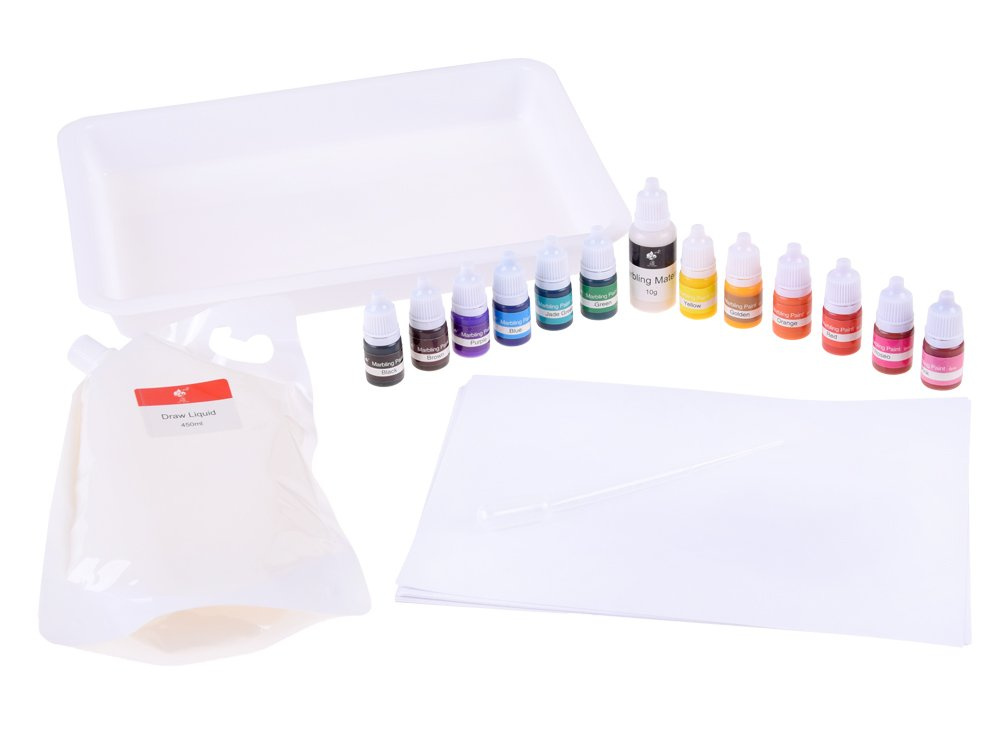 2. otwórz farby, które chcesz wykorzystać do malowania. Farby nabiera się za pomocą pipety dołączonej do zestawu. By dodać następny kolor należy odczekać aż pierwsza farba całkowicie ułoży się na wodzie.