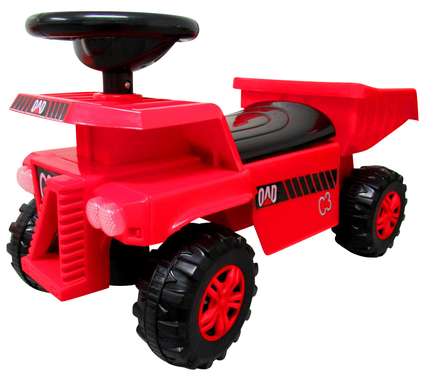 Wyposażenie pojazdu: melodyjki w kierownicy, świecące światła przednie (jedna lampa po każdej stronie - tylko zewnętrzne) siedzisko, ruchoma wywrotka, schowek pod siedziskiem, instrukcja w języku polskim i angielskim, Inne informacje: marka: R-Sport, wymagane baterie paluszki: brak w zestawie, pakowanie: szary karton, pojazd do samodzielnego - stosunkowo prostego montażu,