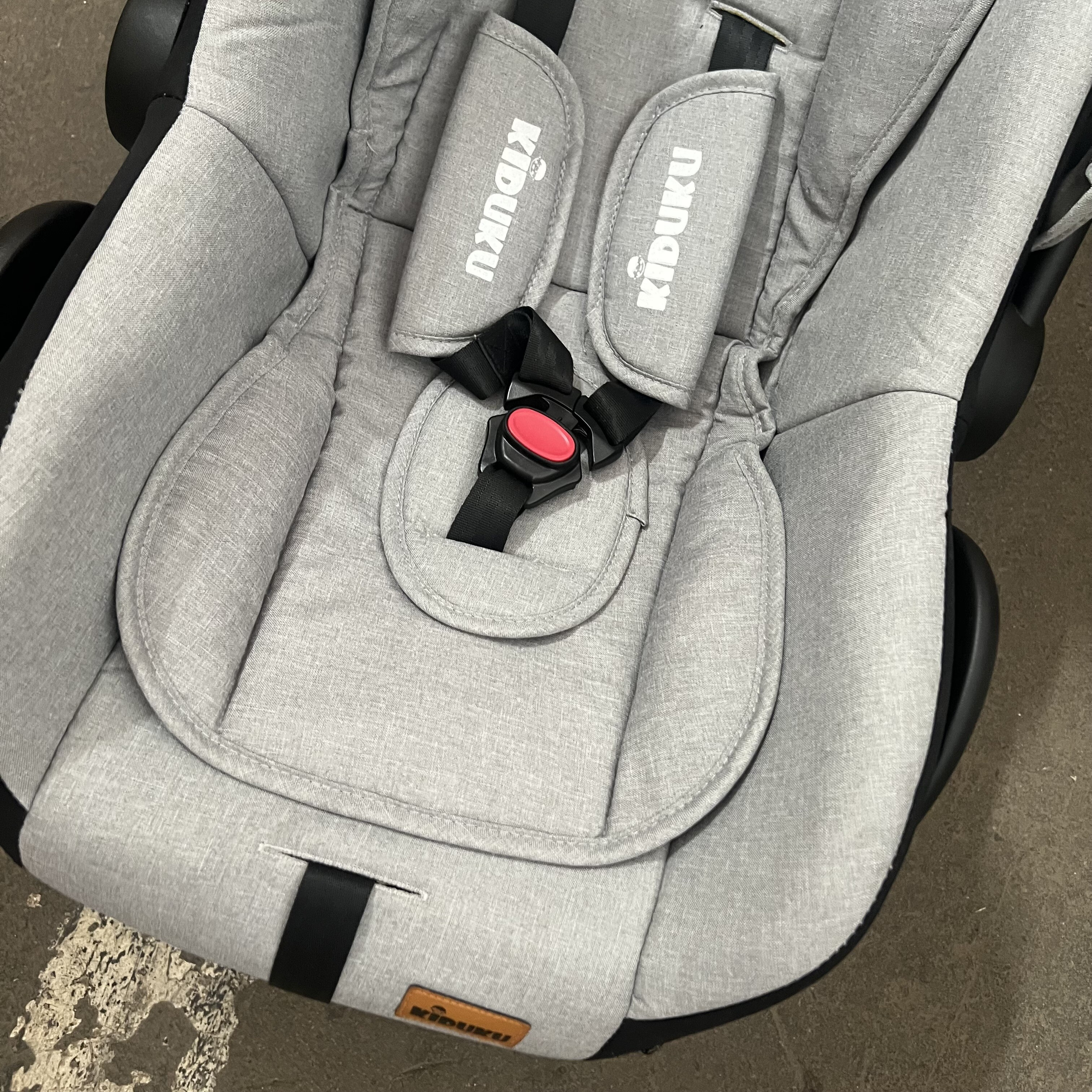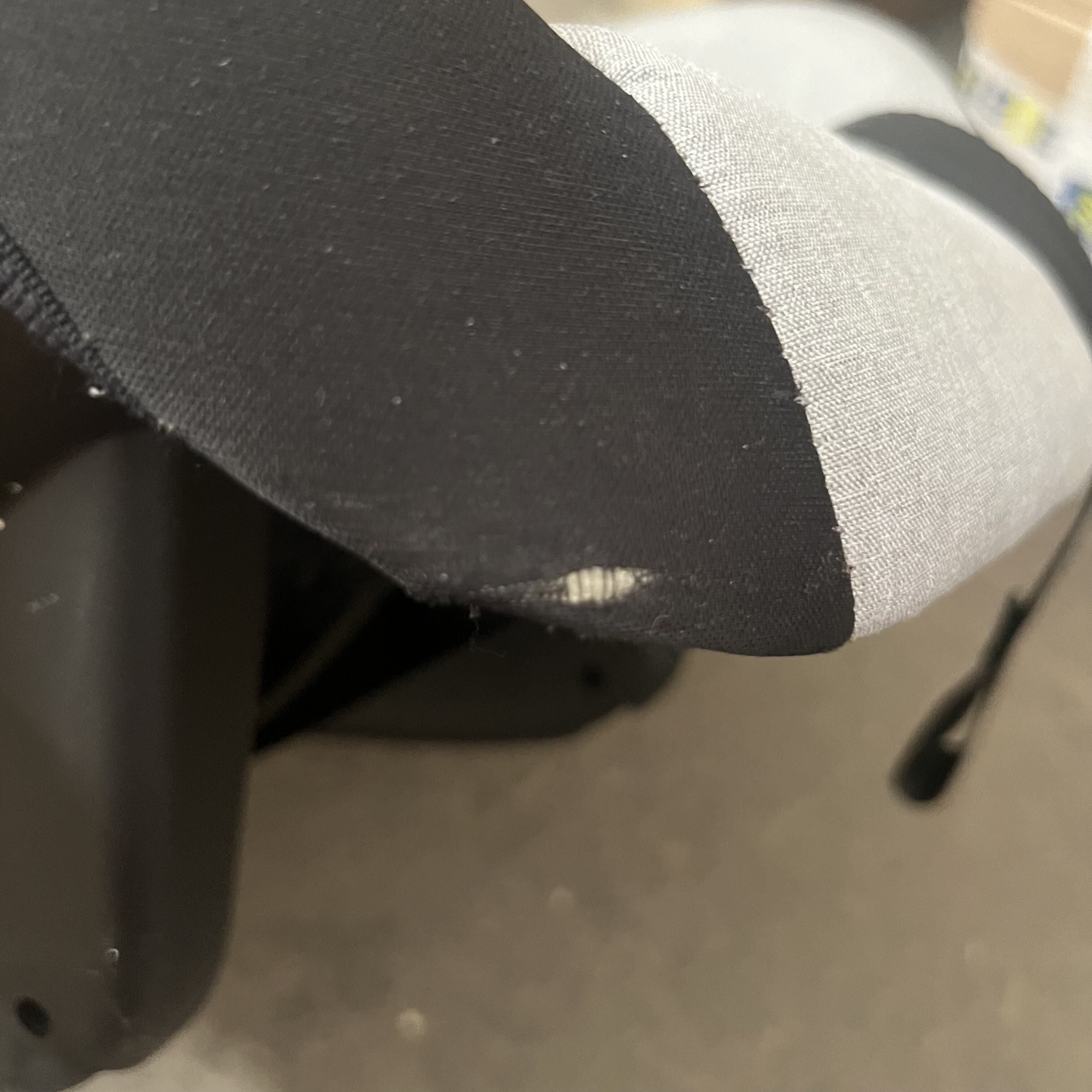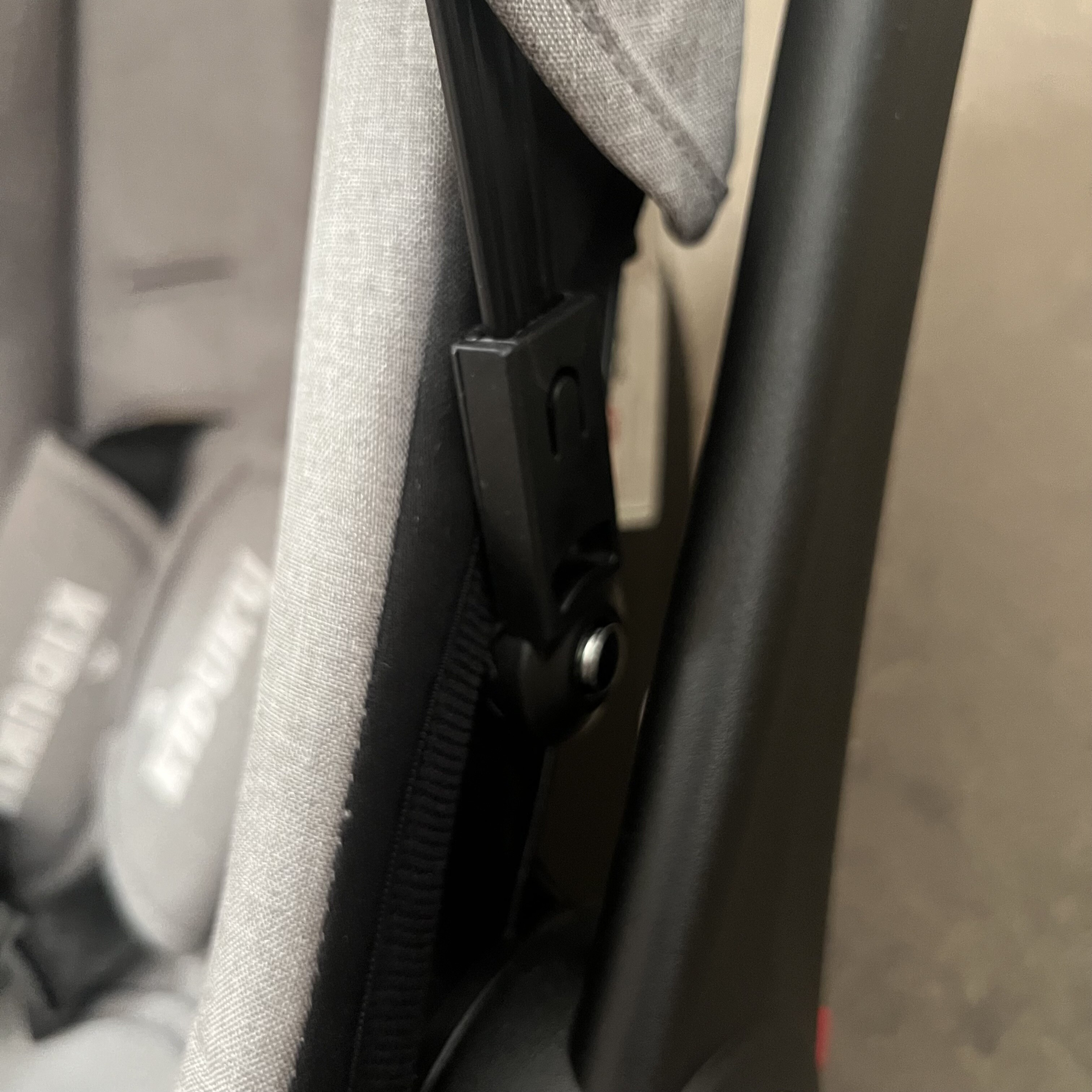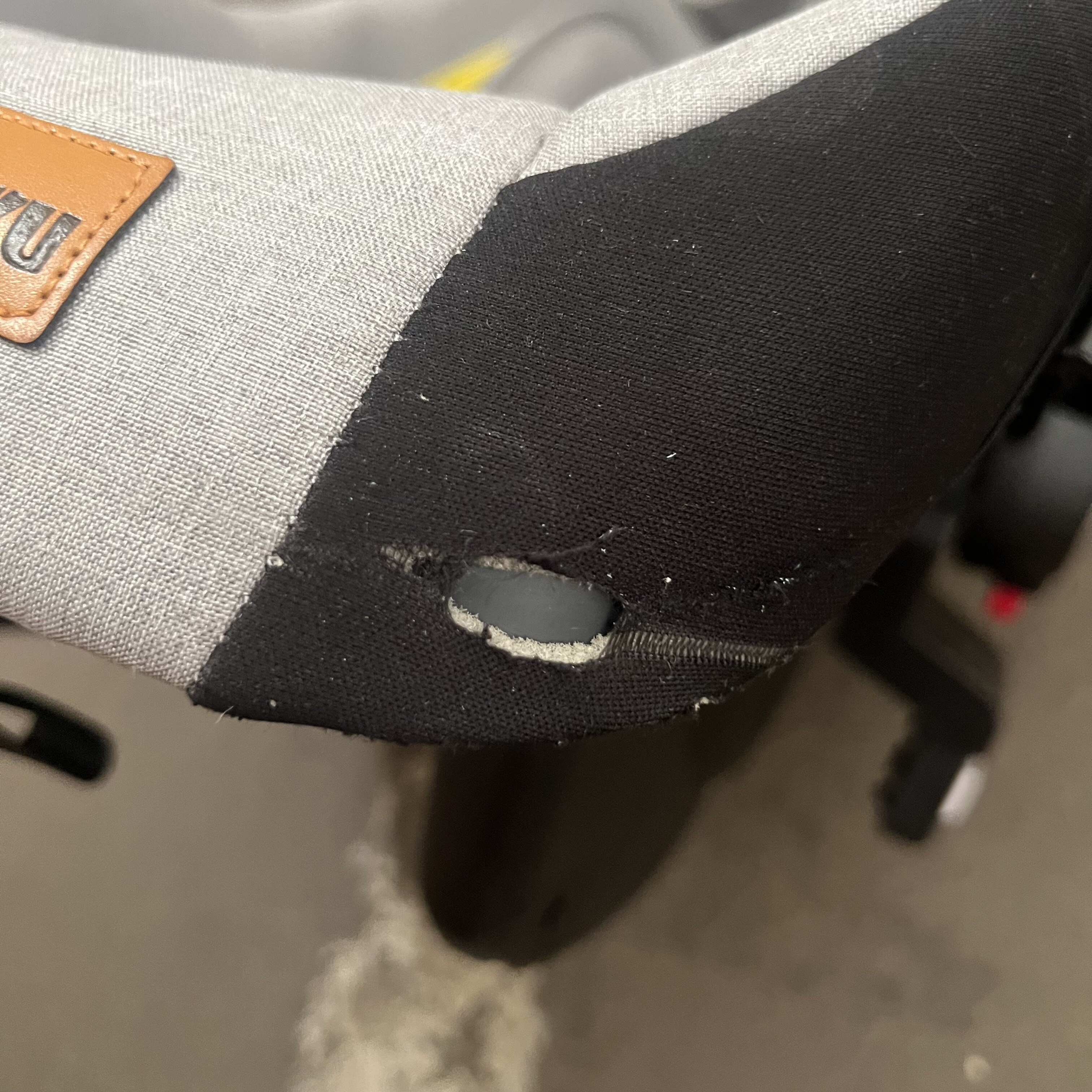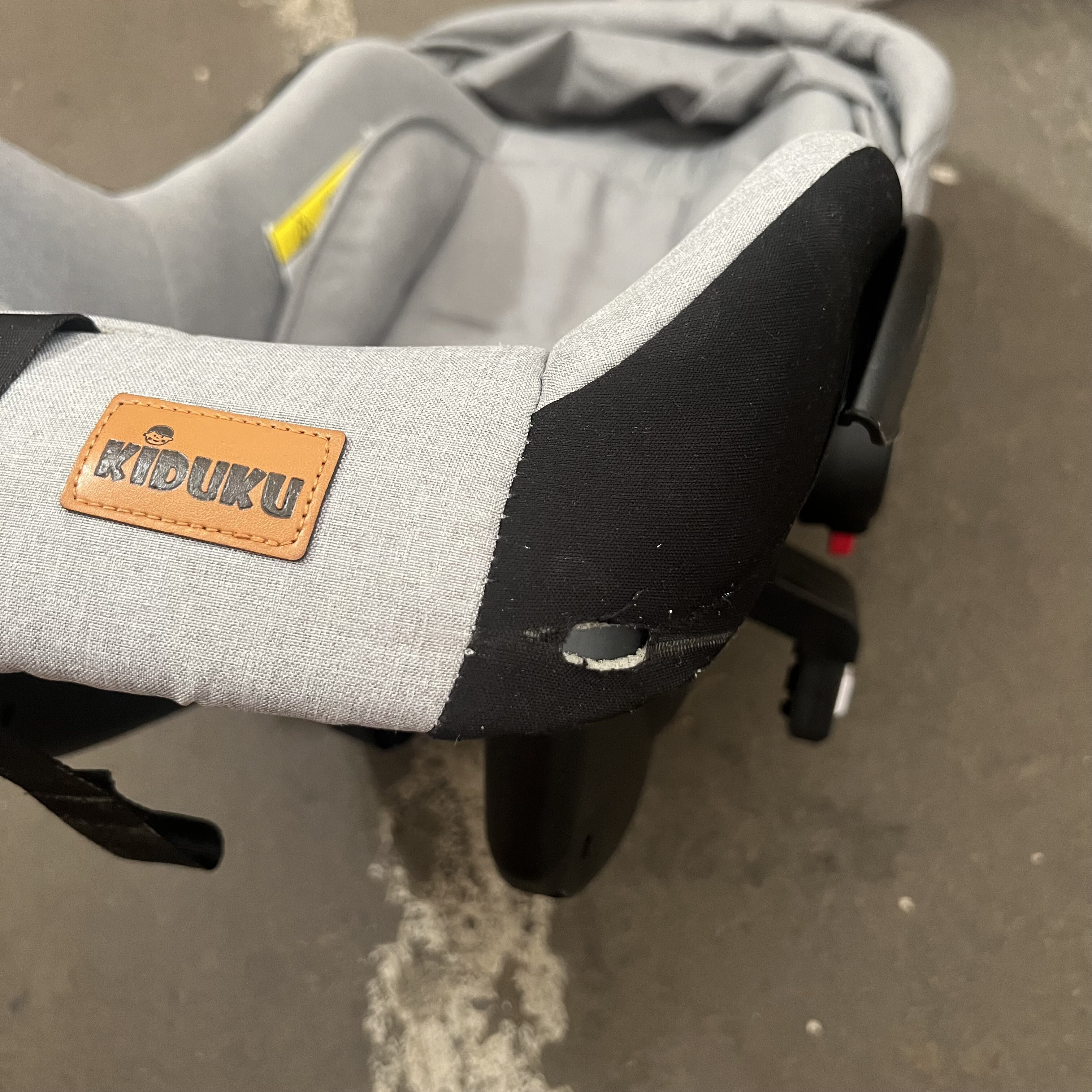 Fotelik samochodowy ma uszkodzony materiał na obu rogach, daszek z jednej strony nie zatrzaskuje się do końca i nie jest dobrze zabezpieczony.