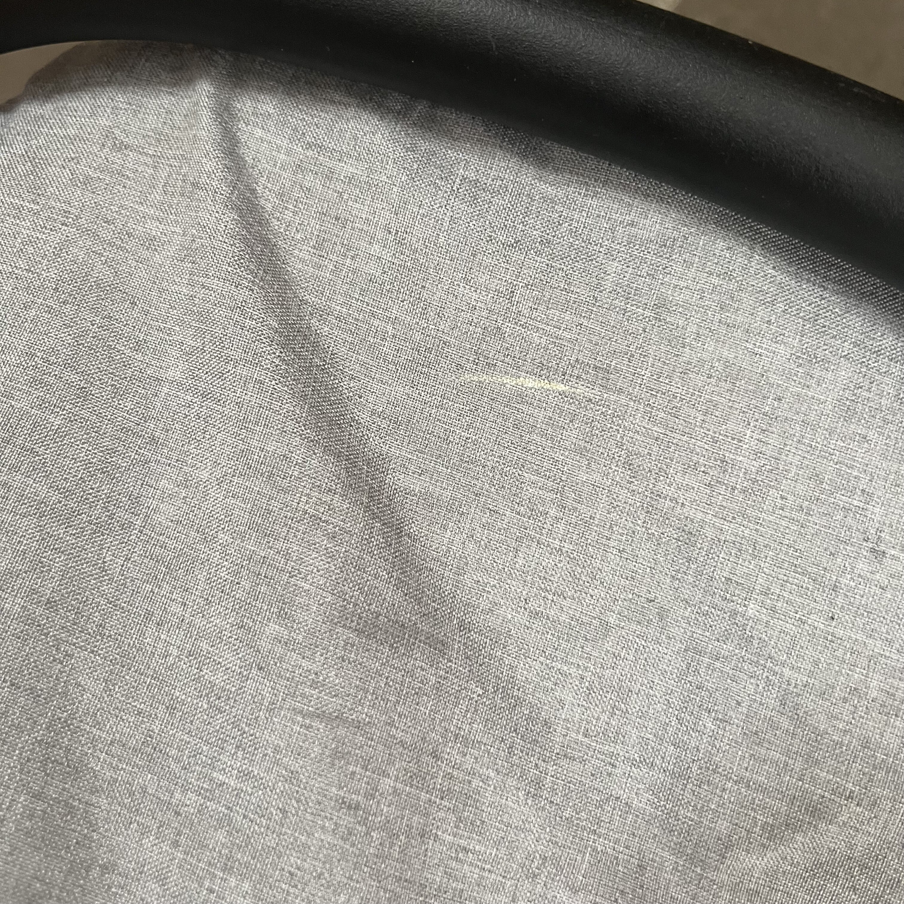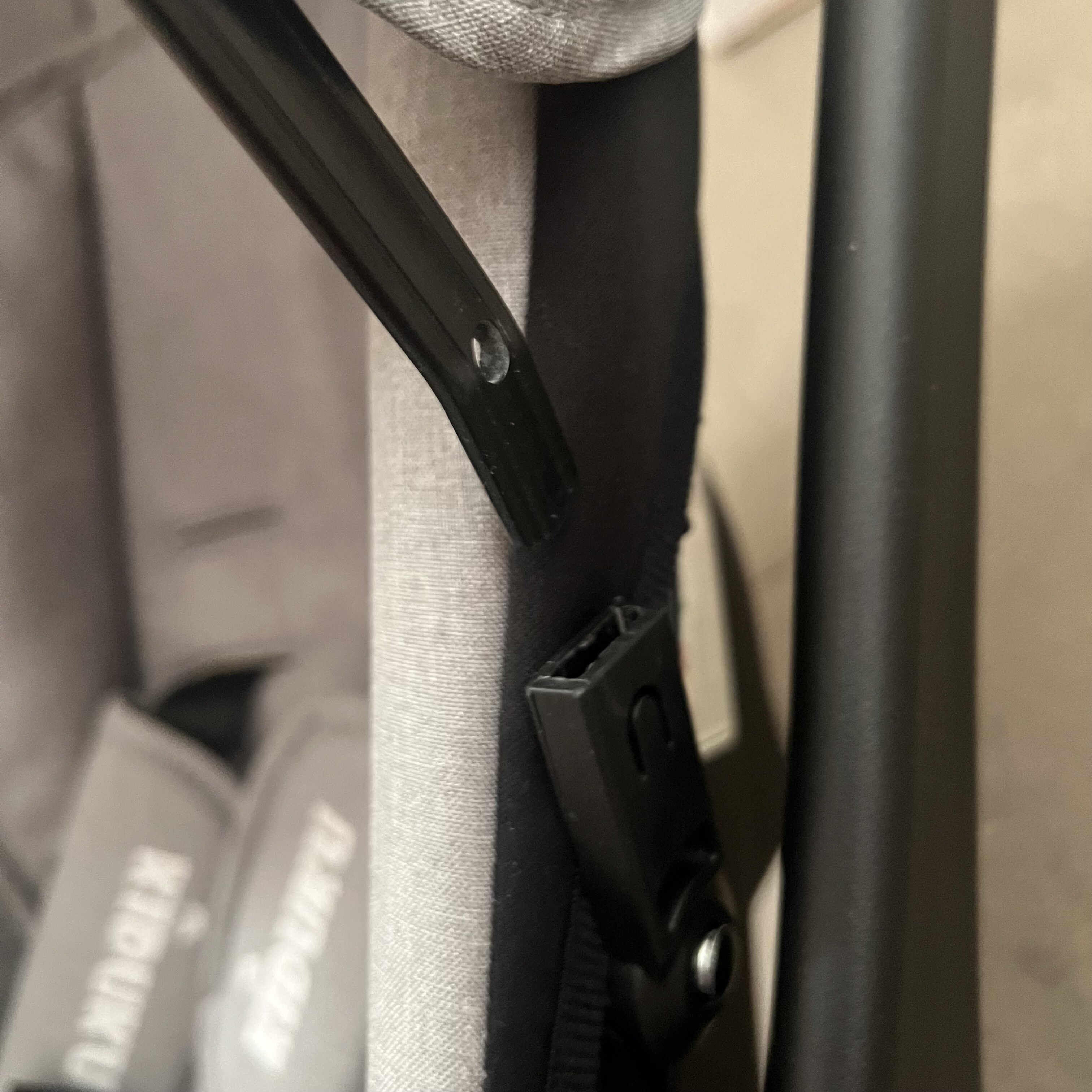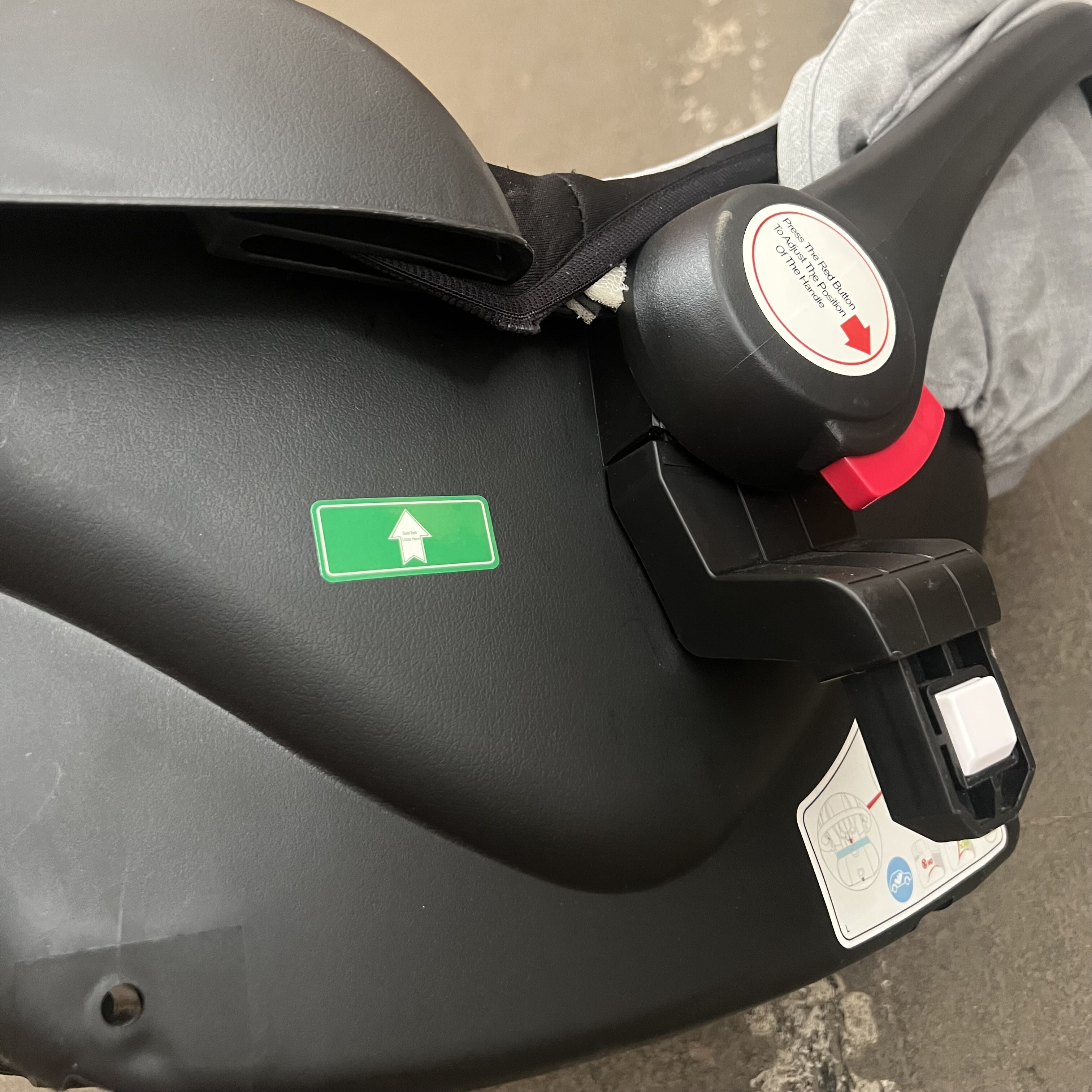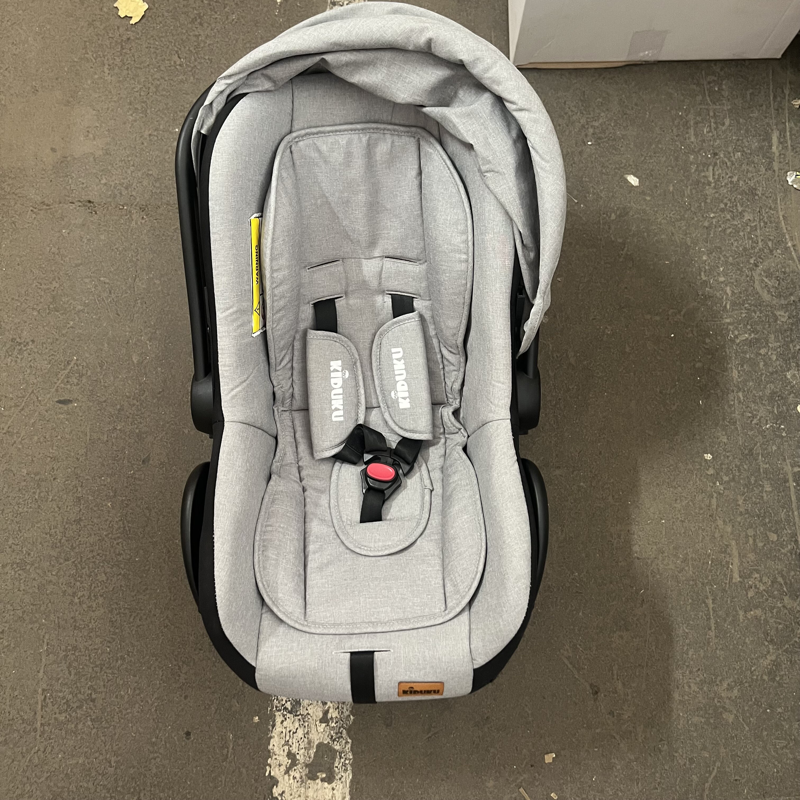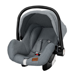 Fotelik samochodowy ma uszkodzony materiał na obu rogach, daszek z jednej strony nie zatrzaskuje się do końca i nie jest dobrze zabezpieczony.