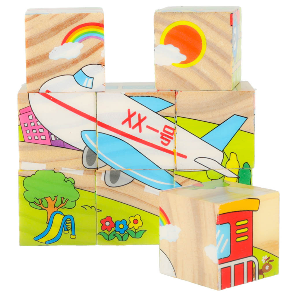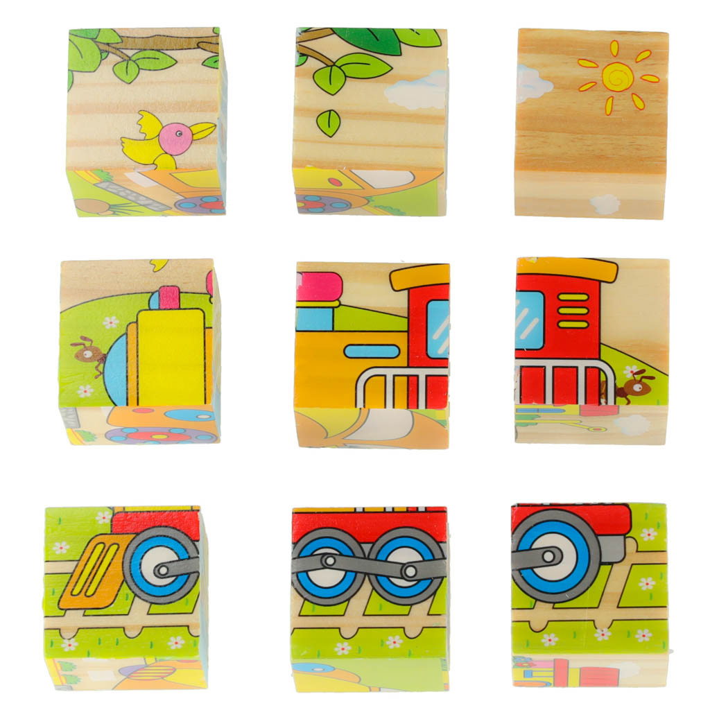 Zestaw składa się z 9 drewnianych, kolorowych kostek o tym samym wymiarze.