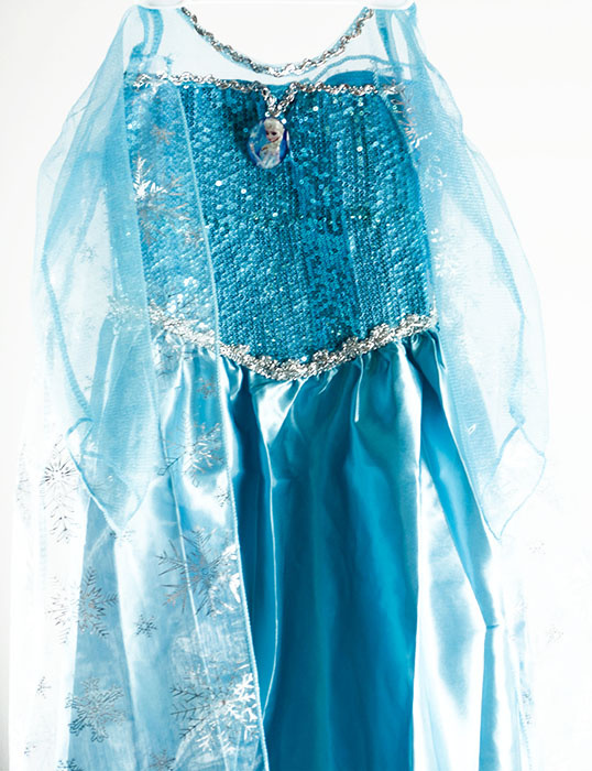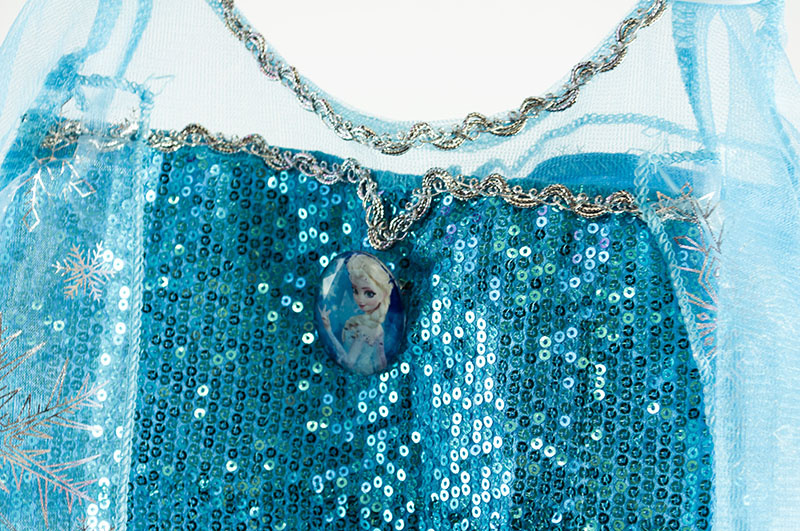 Do sukienki przyczepiona jest broszka z obrazkiem Królowej Elsy, istnieje możliwość odczepienia broszki.