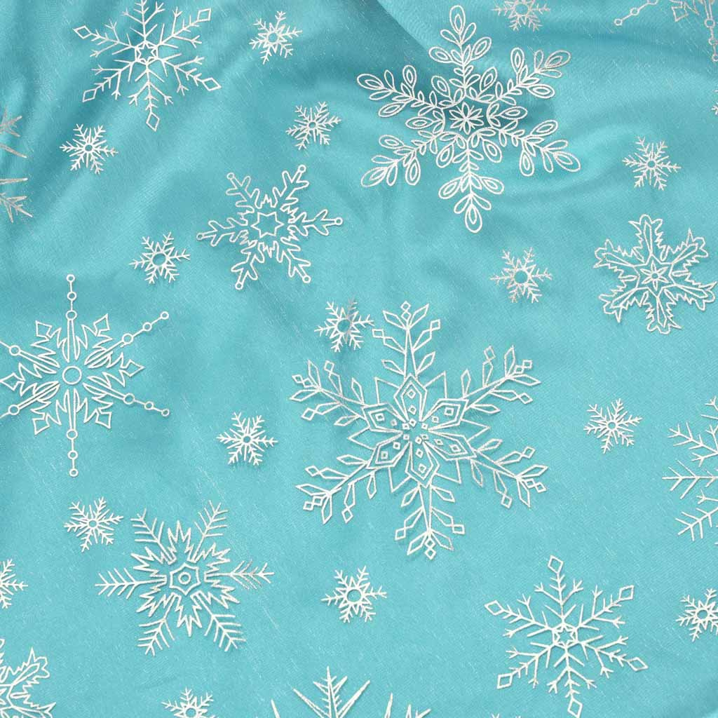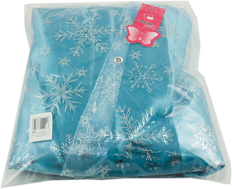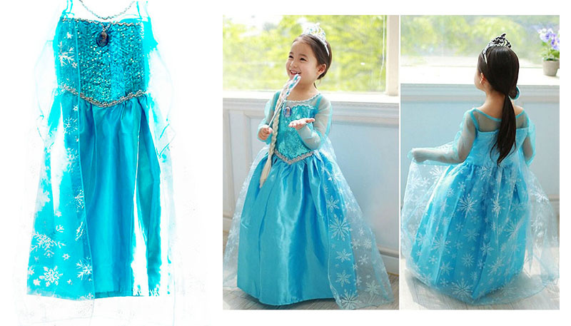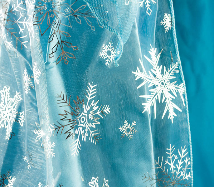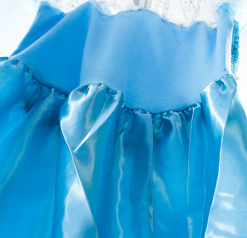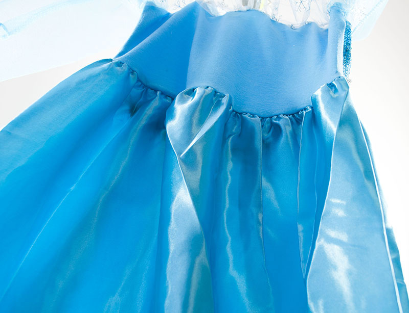 Z tyłu sukienki znajduje się półprzeźroczysta peleryna przyozdobiona wzorami w kształcie płatków śniegu.