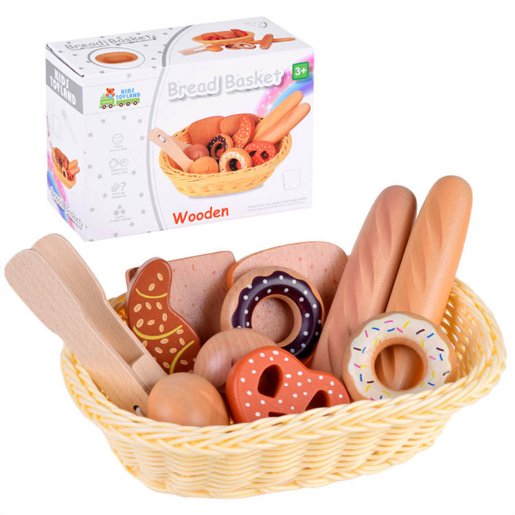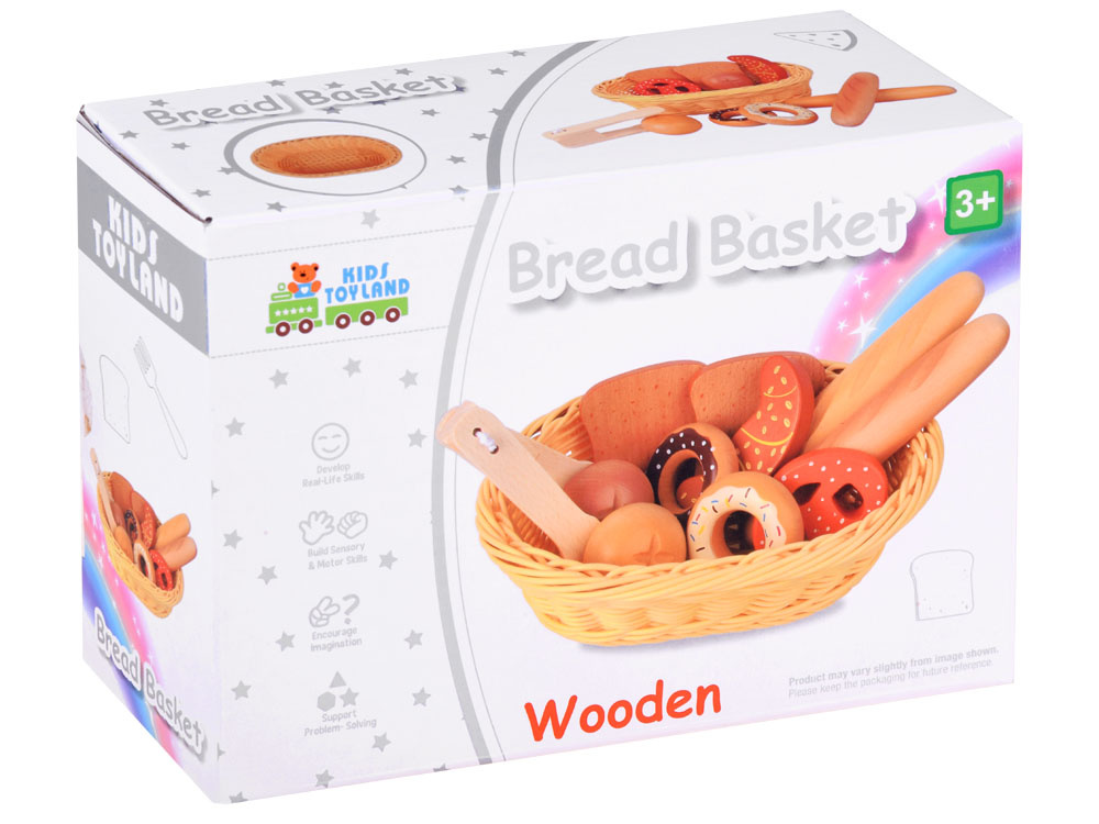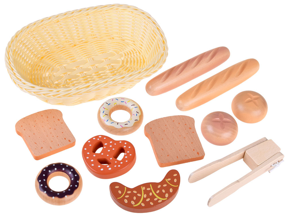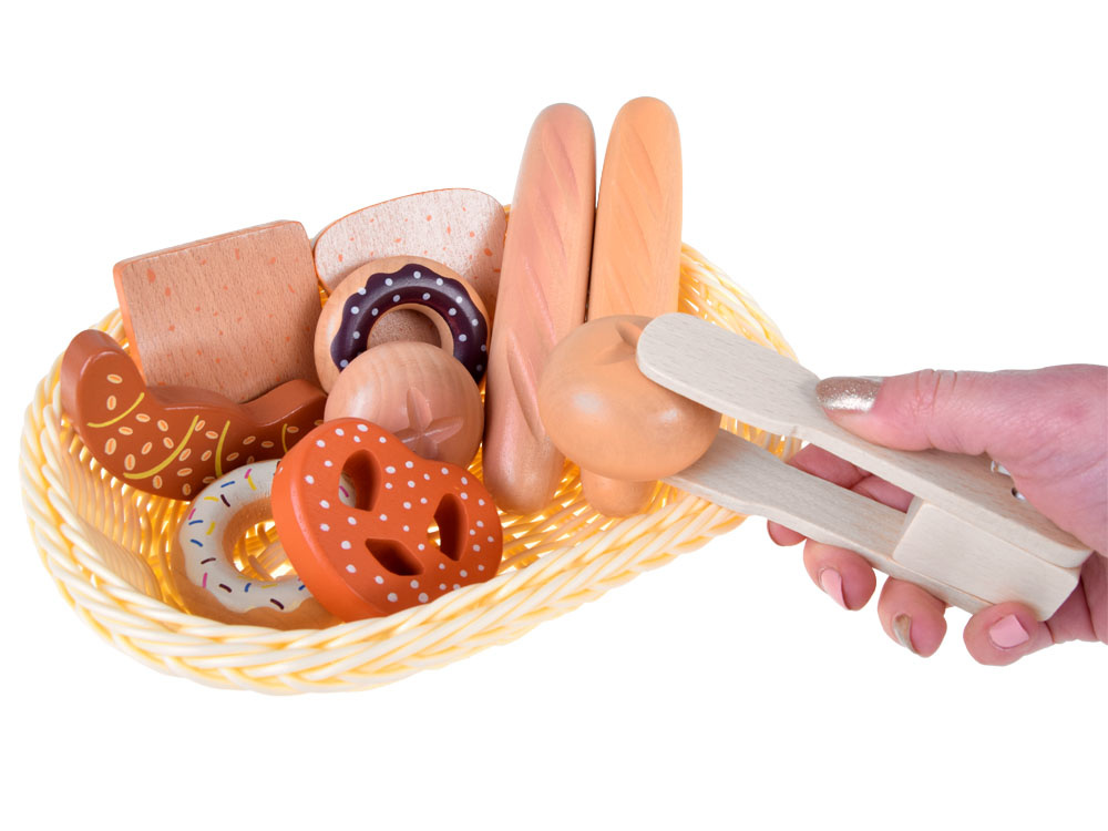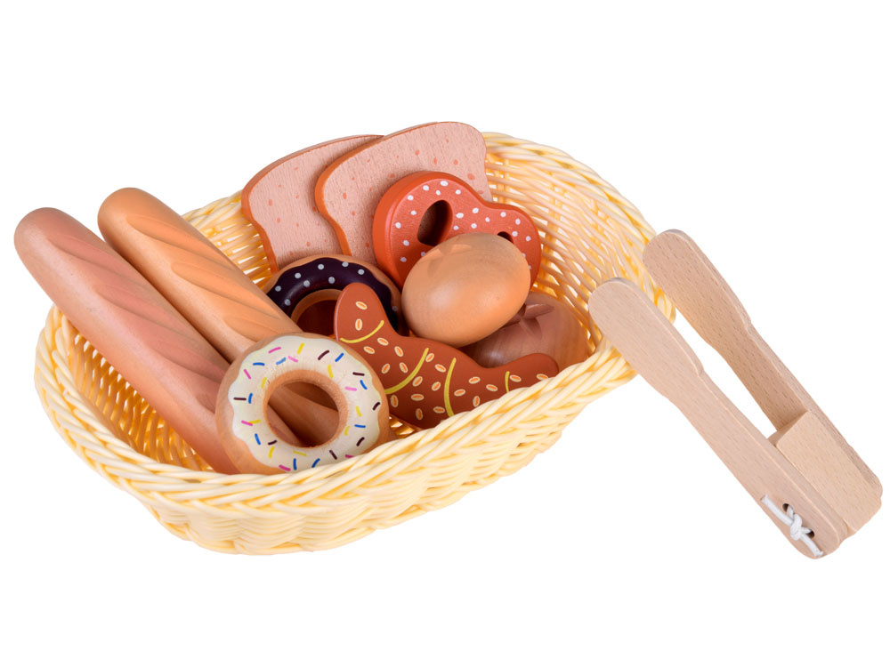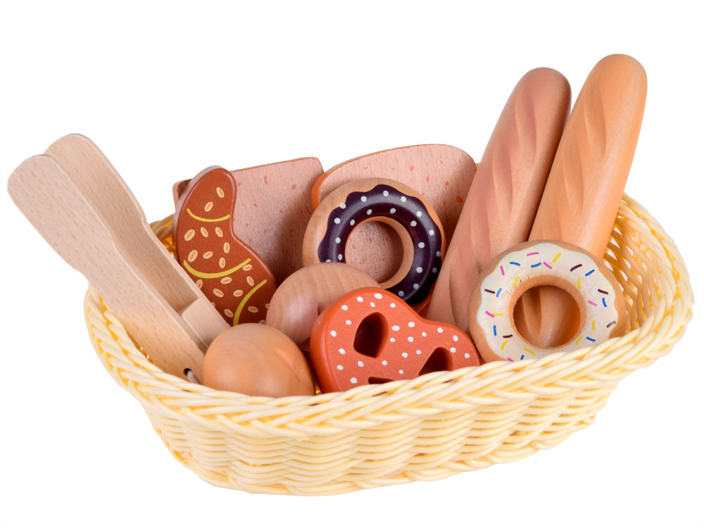Koszyk z pieczywem to drewniane artykuły spożywcze, które pozwolą każdemu dziecku na przygotowanie smacznego śniadania dla lali, misiów i innych głodomorków.