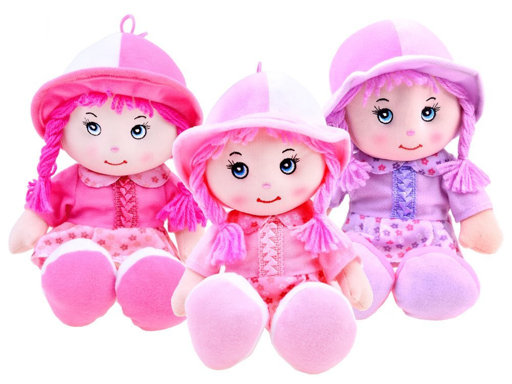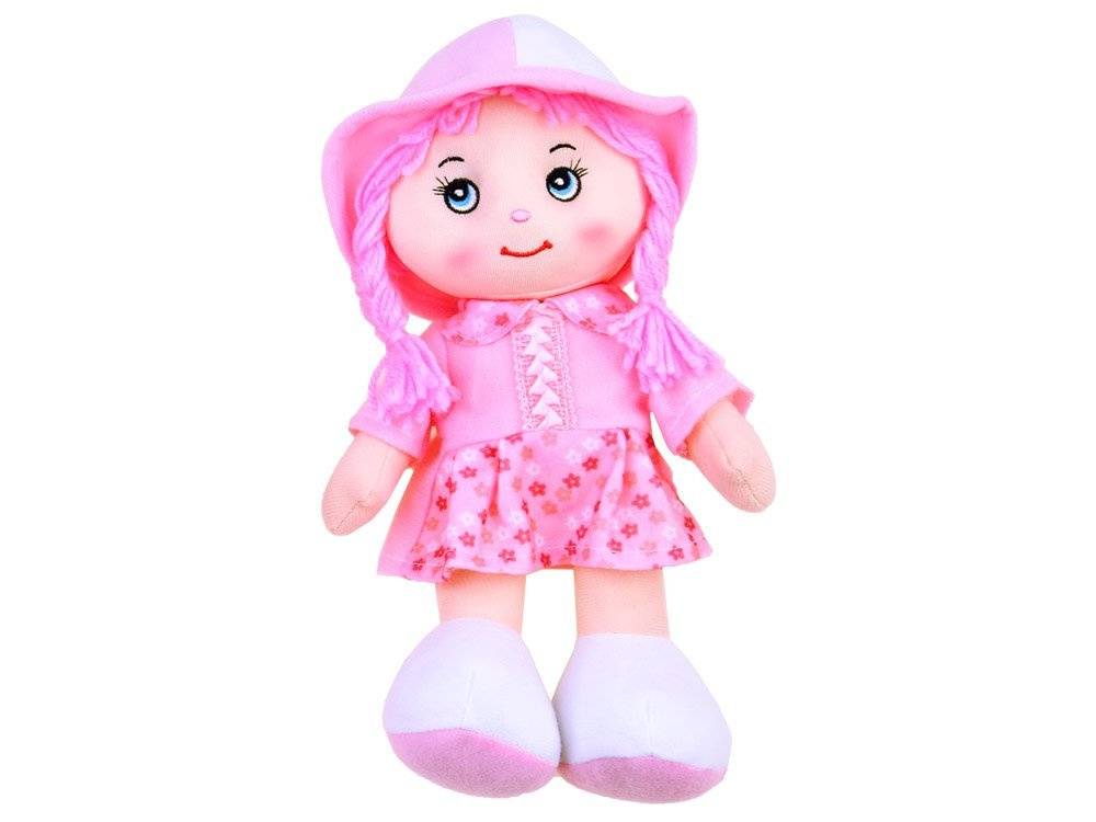 Laleczka jest mięciutka z warkoczami, w uroczym kapeluszu i sukience.