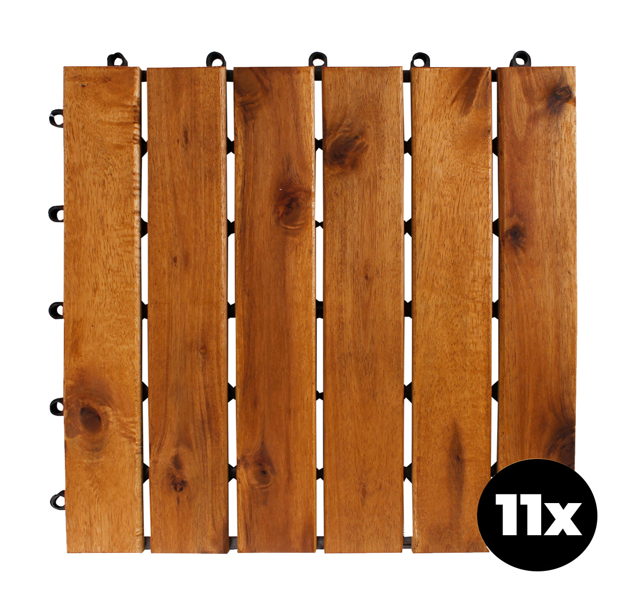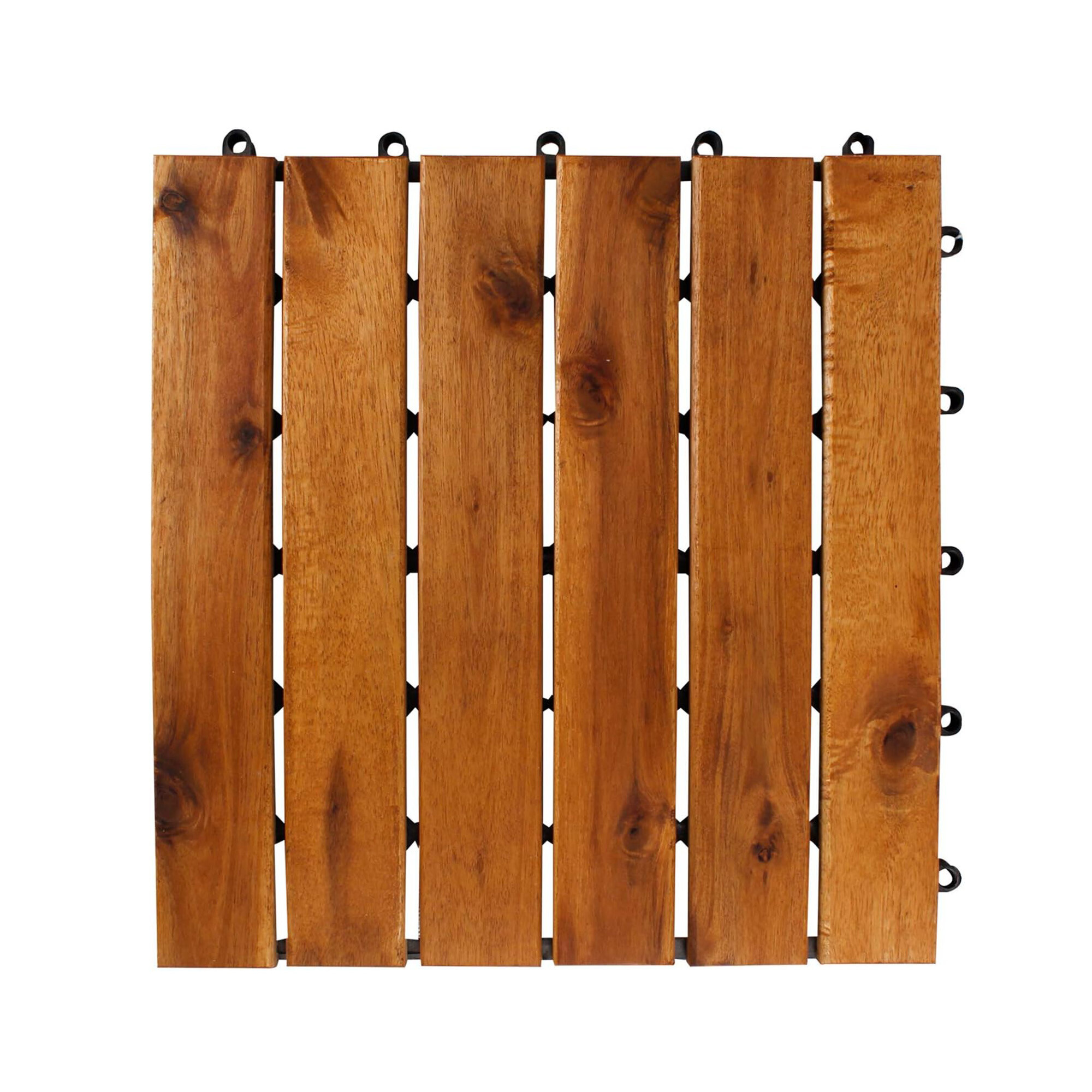 Płytki podłogowe wykonane są z wysokiej jakości drewna akacjowego, tropikalnego drewna twardego, które jest odporne na warunki atmosferyczne i długowieczne.