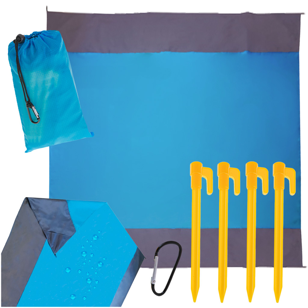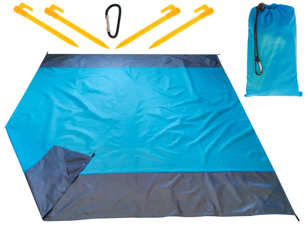 MATA PLAŻOWA KOC BIWAKOWY WODOODPORNY 210X200 Wyobraź sobie, że na Twoją odkrytą skórę padają promienie gorącego, letniego słońca, a stopy zapadają się w miękkim, rozgrzanym piasku. Znajdujesz perfekcyjne miejsce, tuż poza zasięgiem rozbijających się fal. Siadasz na piasek, ale jest on na tyle rozgrzany, że nie dasz rady wytrzymać nawet krótkiej chwili! Czy oznacza to, że cały dzień został zepsuty? Nic bardziej mylnego! W takiej sytuacji idealnym rozwiązaniem będzie mata plażowa! Pozwoli ona wygodnie usiąść na rozgrzanym piasku bez ryzyka jakichkolwiek poparzeń! Jej prosty design sprawia, że przypadnie wszystkim do gustu i świetnie sprawdzi się w każdej sytuacji! Z łatwością na kocu zmieścisz się z rodziną lub przyjaciółmi! Duże wymiary pozwolą na to, aby każdy z was wygodnie usiadł lub położył się, by chłonąć słońce! Bez wątpienia ważną cechą koca jest jego wodoodporność! Dzięki temu możesz zabrać go nie tylko na plażę, ale również na wycieczkę do lasu albo po prostu do ogrodu! Nawet jeśli rozłożysz go na wilgotnej i mokrej powierzchni, nie musisz martwić się, że przemoknie mocząc Twoje ubrania! Możesz być pewnym, że będziesz całkowicie suchy! Nikt nie lubi, gdy wiatr podwiewa i zawija rogi koca, rozrzucając piasek po wszystkim, co na nim leży. Ciągłe poprawianie koca również nie jest zbyt komfortowe. W przypadku tego koca wszystko został dokładnie przemyślanie - w zestawie znajdują się 4 łatwe do wbicia śledzie, dzięki czemu możesz przymocować koc do ziemi! Aby wygodnie przenosić koc i móc zabrać go ze sobą wszędzie, do zestawu został dołączony specjalny worek, w który włożysz wszystkie jego elementy! Bez żadnych problemów zabierzesz go ze sobą na wycieczkę samochodem czy pociągiem albo zmieścisz do plecaka podczas pieszych wędrówek lub wypraw do lasu! Koc biwakowy sprawdzi się świetnie w różnorodnych warunkach między innymi dzięki zastosowaniu bardzo wytrzymałego materiału! Pozwoli to na częste korzystanie z maty bez obaw, że zostanie rozdarta! Czyszczenie również będzie jedynie formalnością, wystarczy, ze spłuczesz powierzchnię wodą, poczekasz chwilę aż wyschnie i gotowe! Zawartość zestawu: