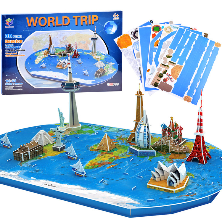 Zestaw składa się z 136 elementów. Poszczególne elementy puzzli umieszczone są arkuszach wykonanych ze specjalnego kartonika. Na ułożonej mapie odnajdziemy takie budowle jak: Wieżę Eiffla, Operę w Sydney, Statuę Wolności i wiele innych.